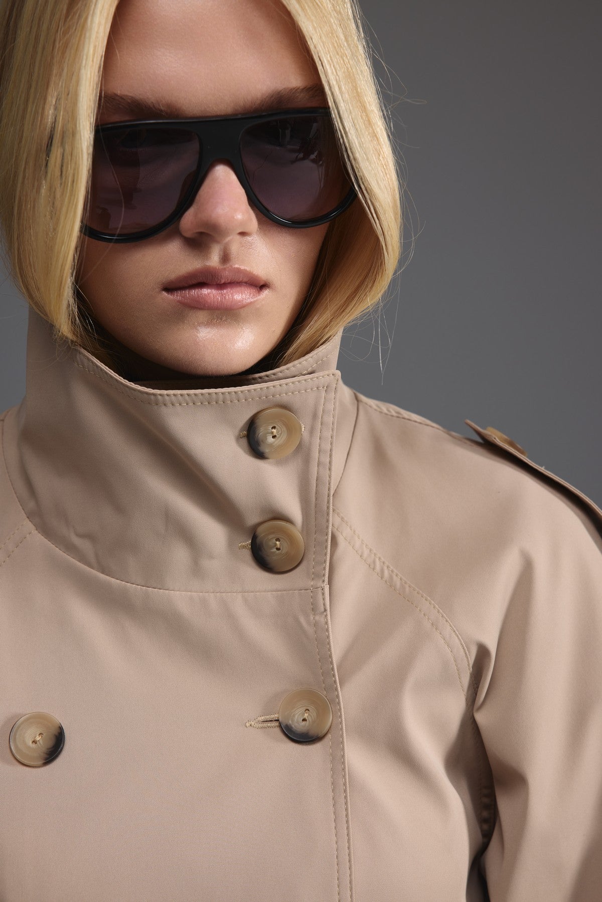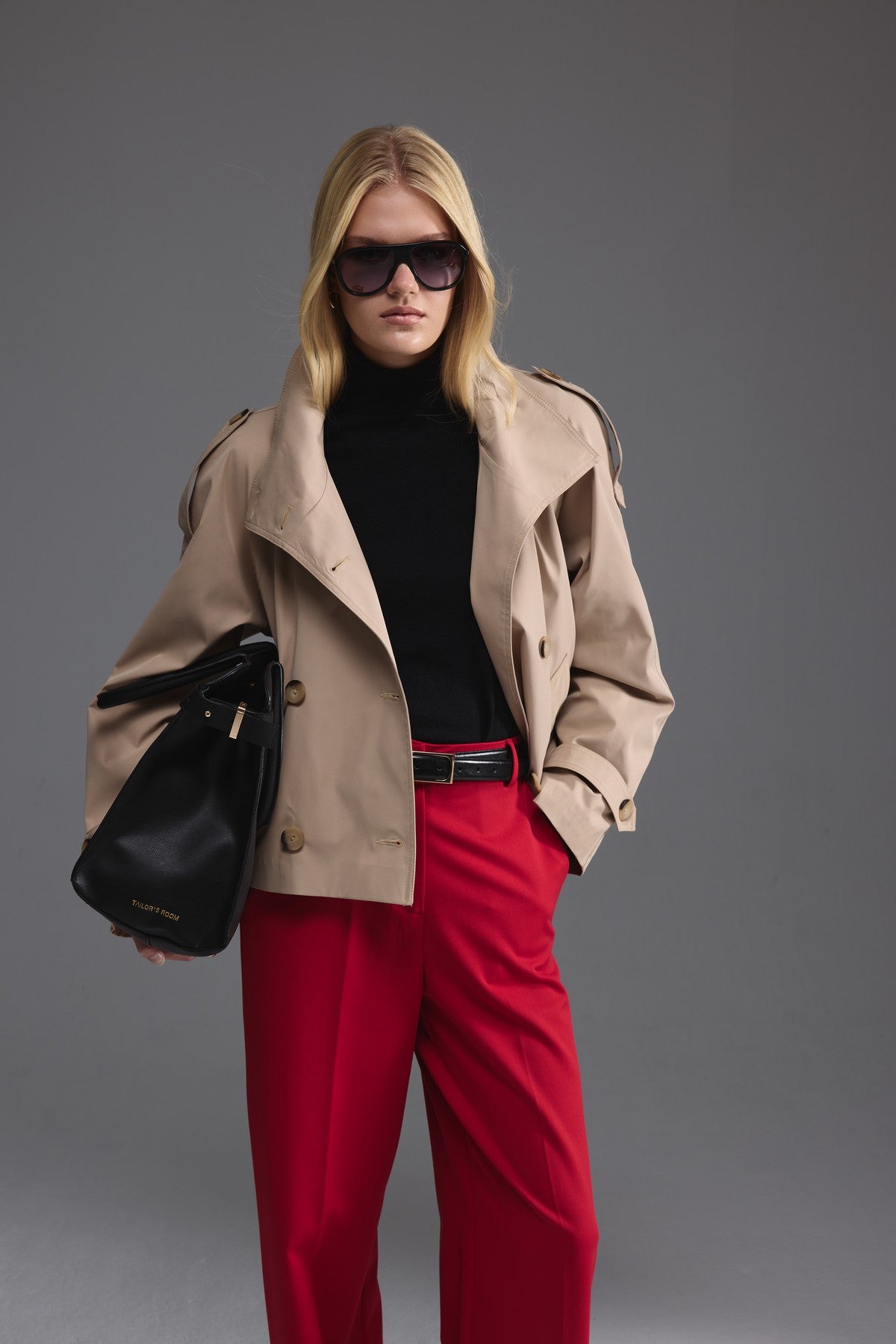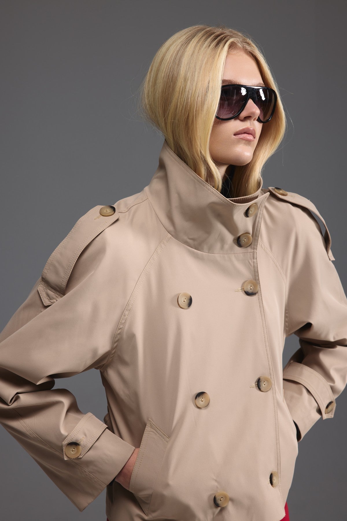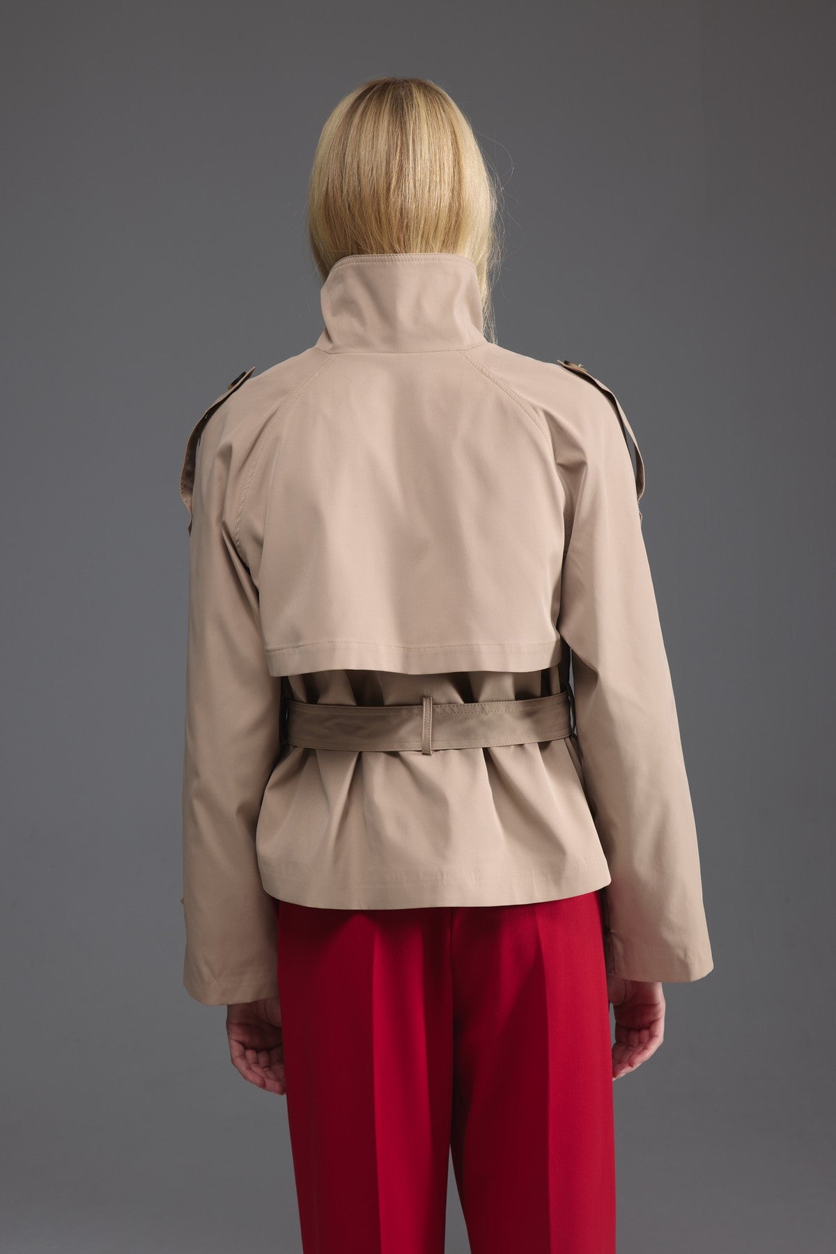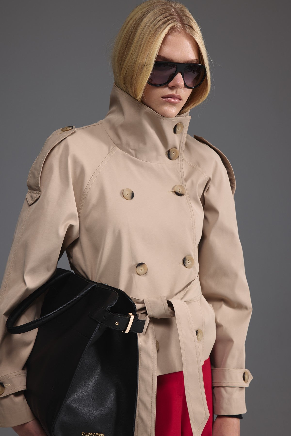 Çentikli, klapalı, cepli, reglan kollu, omuzları ve kol apoletli, kısa dik yaka trençkot.