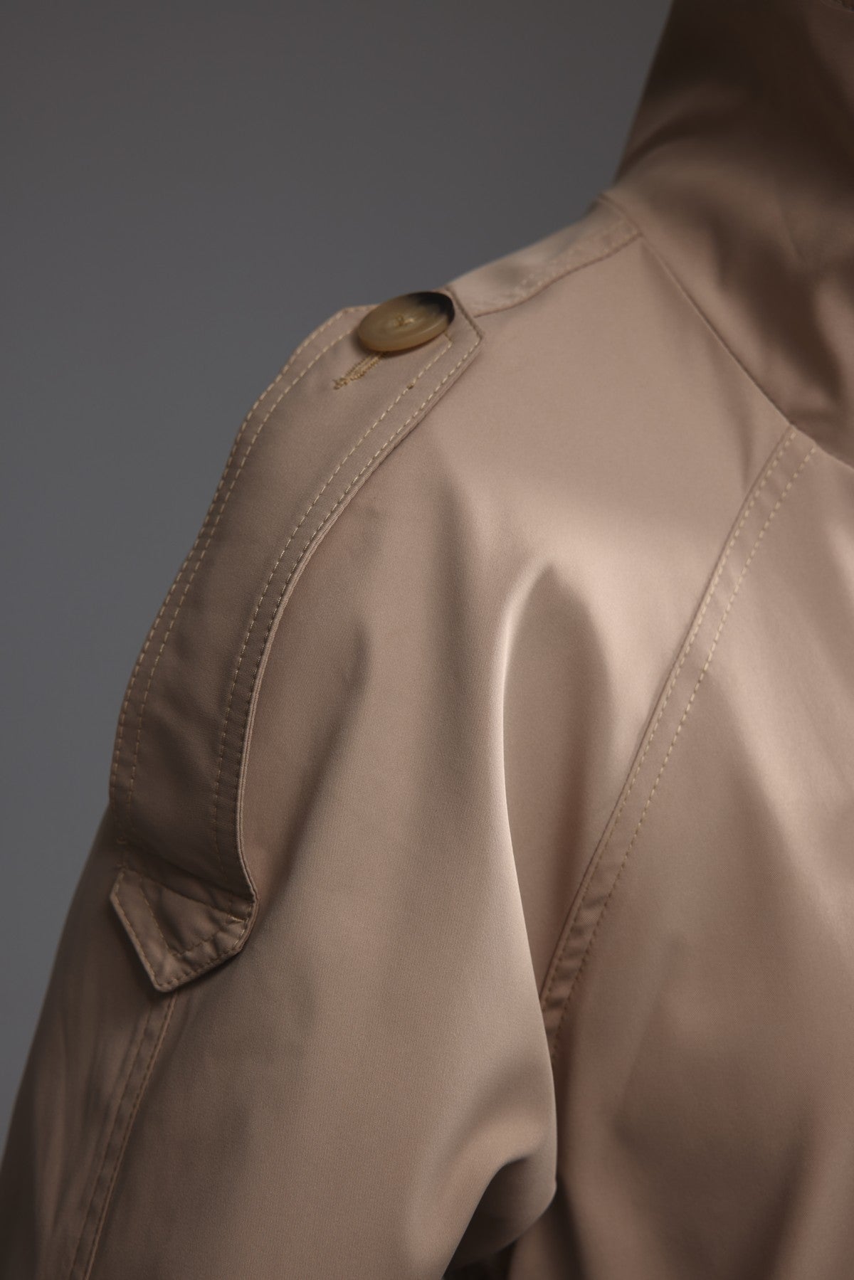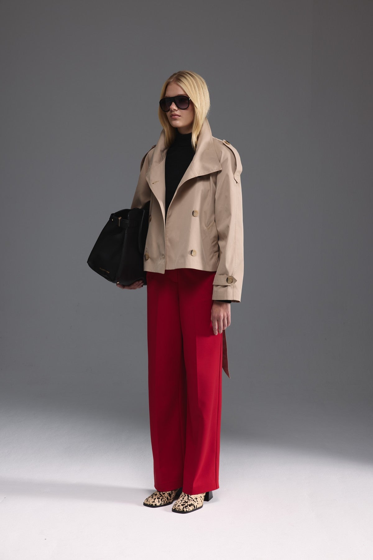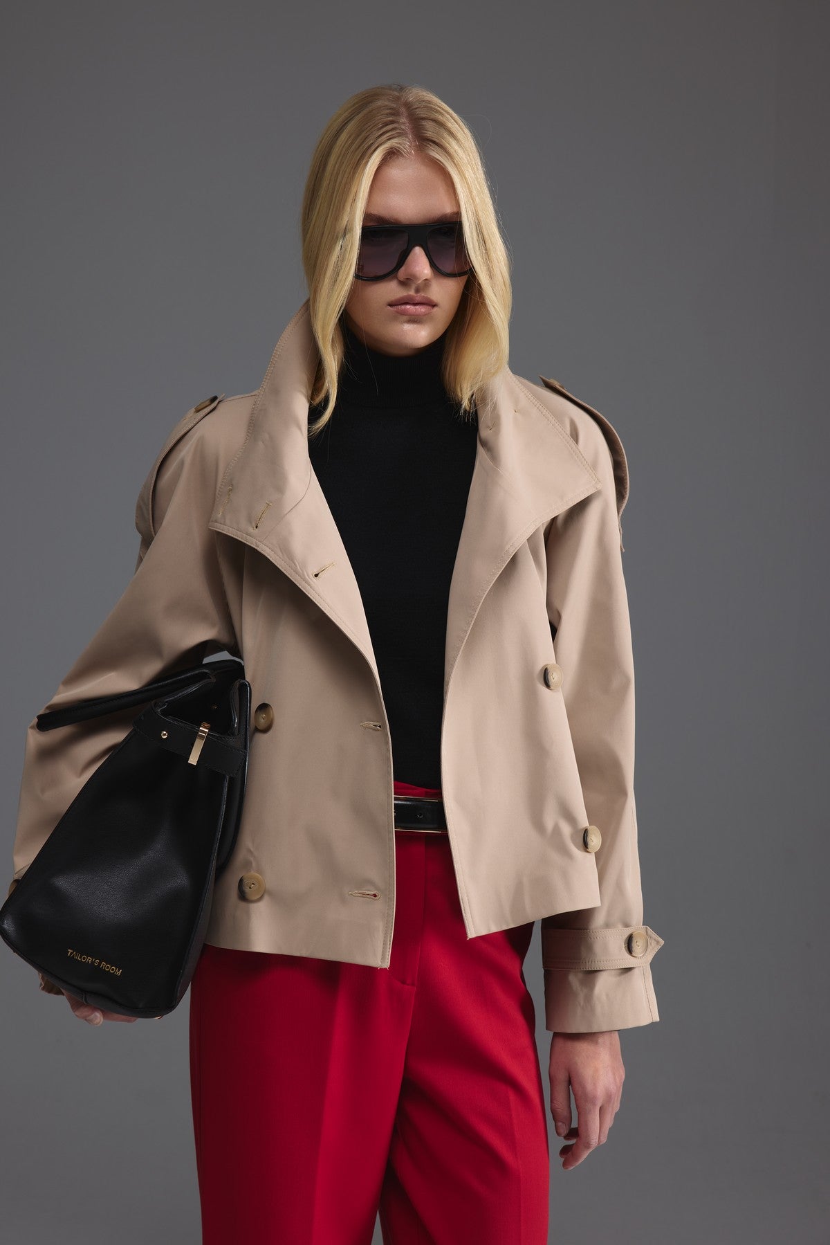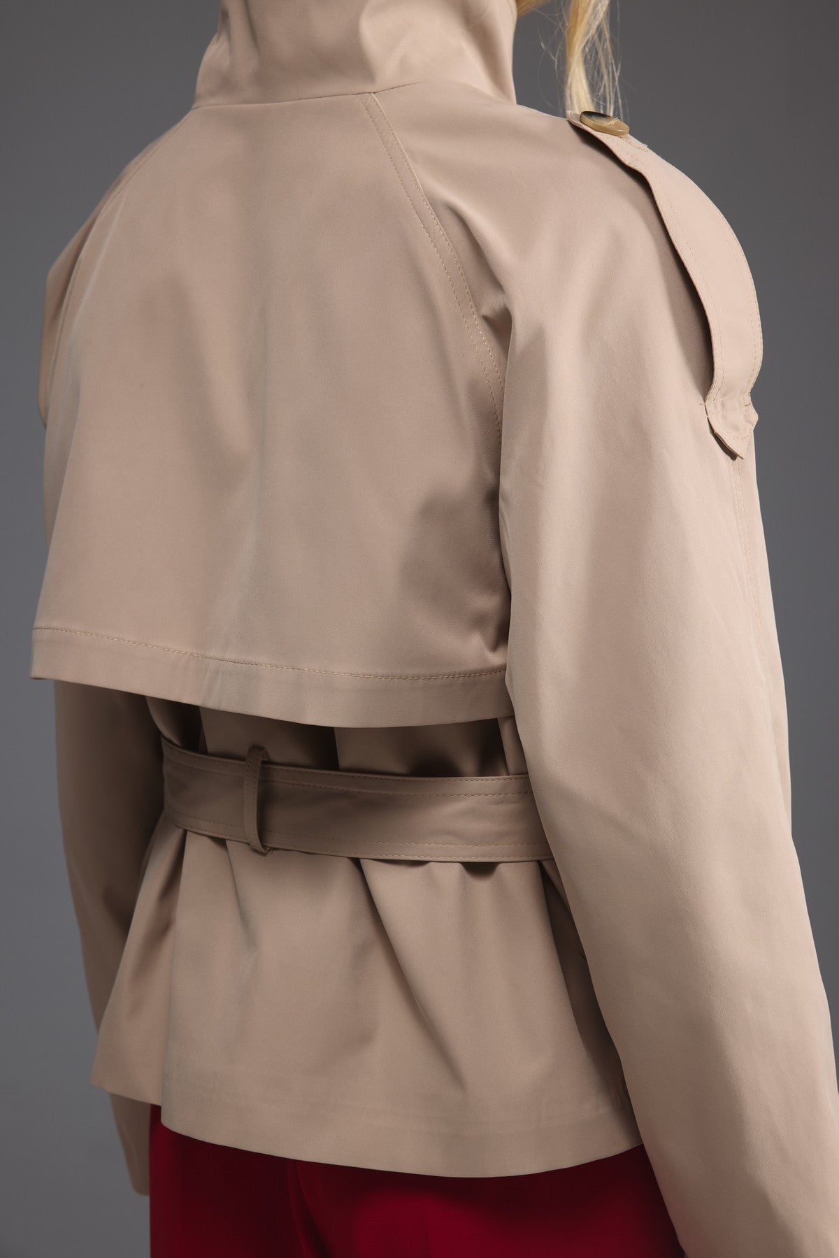 Çentikli, klapalı, cepli, reglan kollu, omuzları ve kol apoletli, kısa dik yaka trençkot.