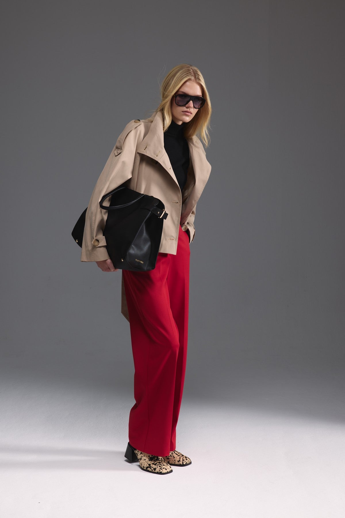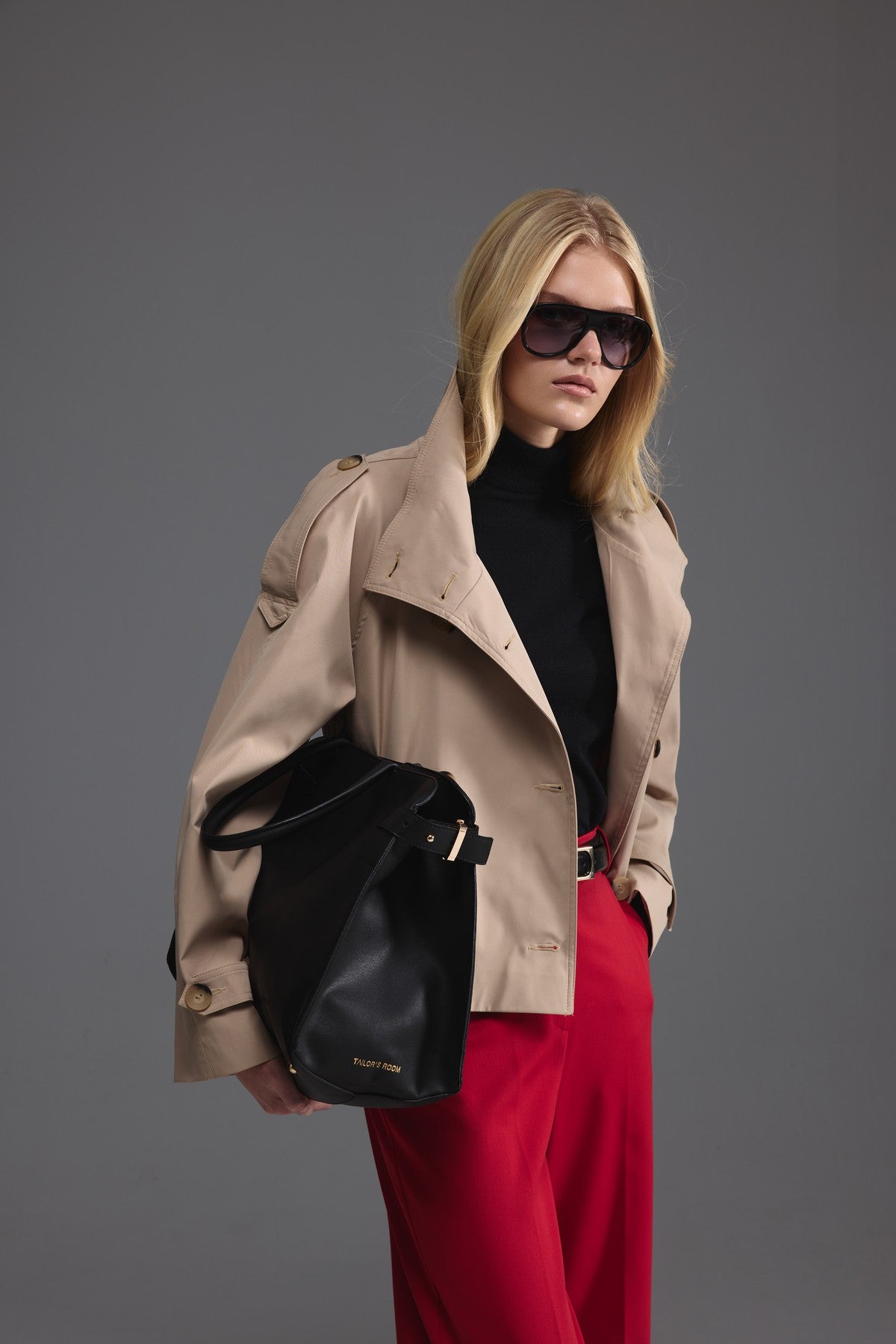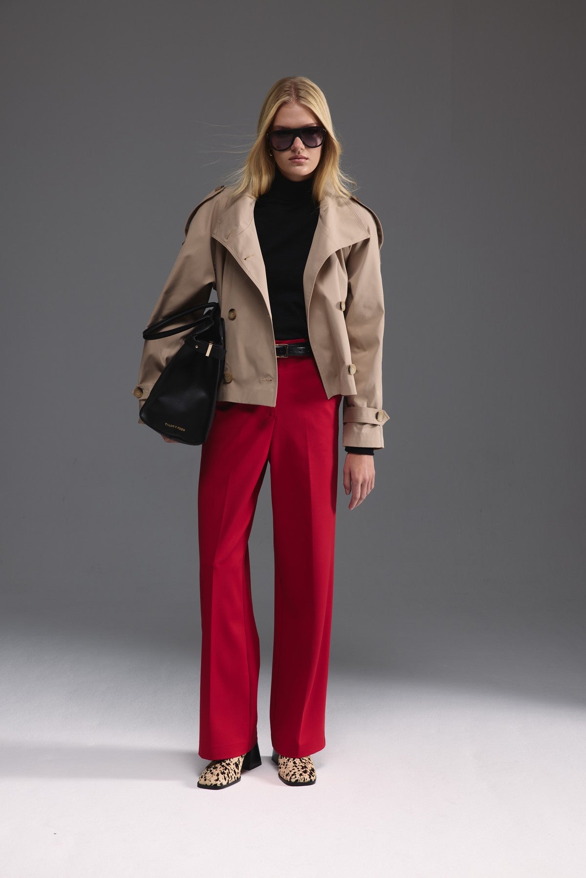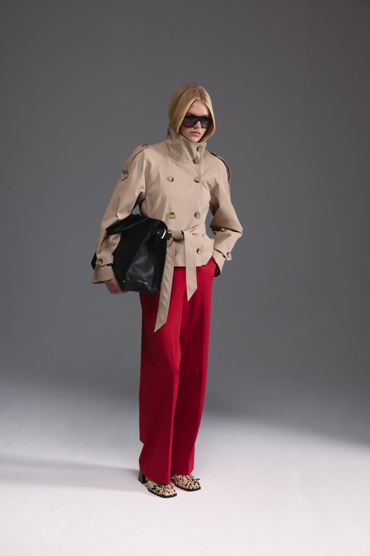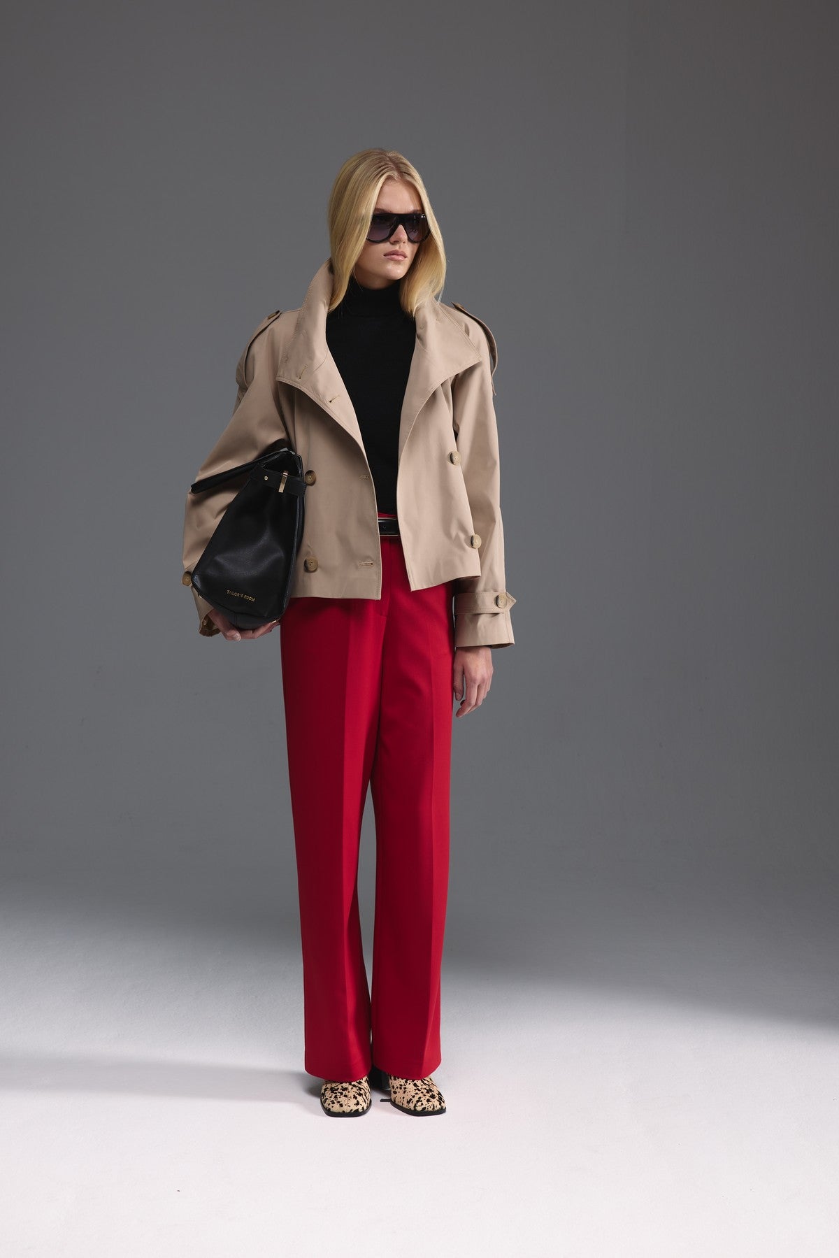Çentikli, klapalı, cepli, reglan kollu, omuzları ve kol apoletli, kısa dik yaka trençkot.