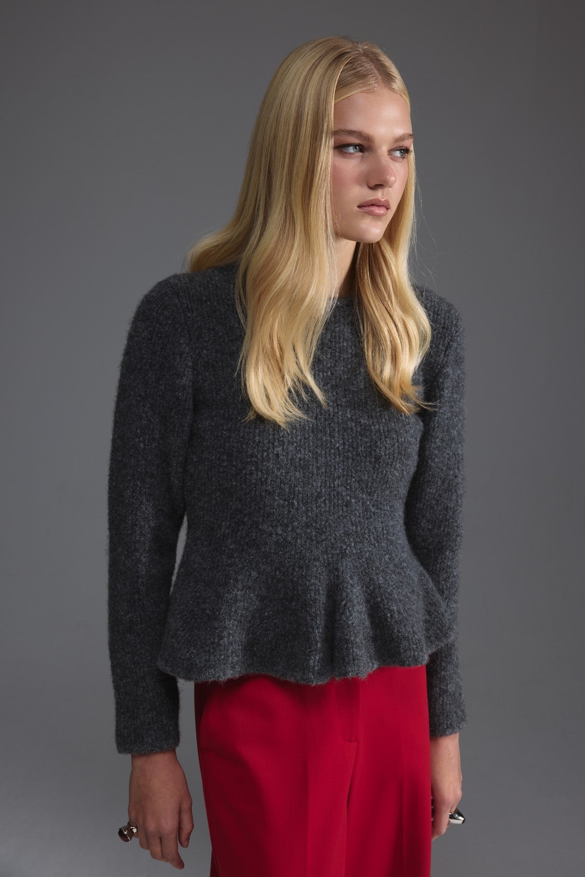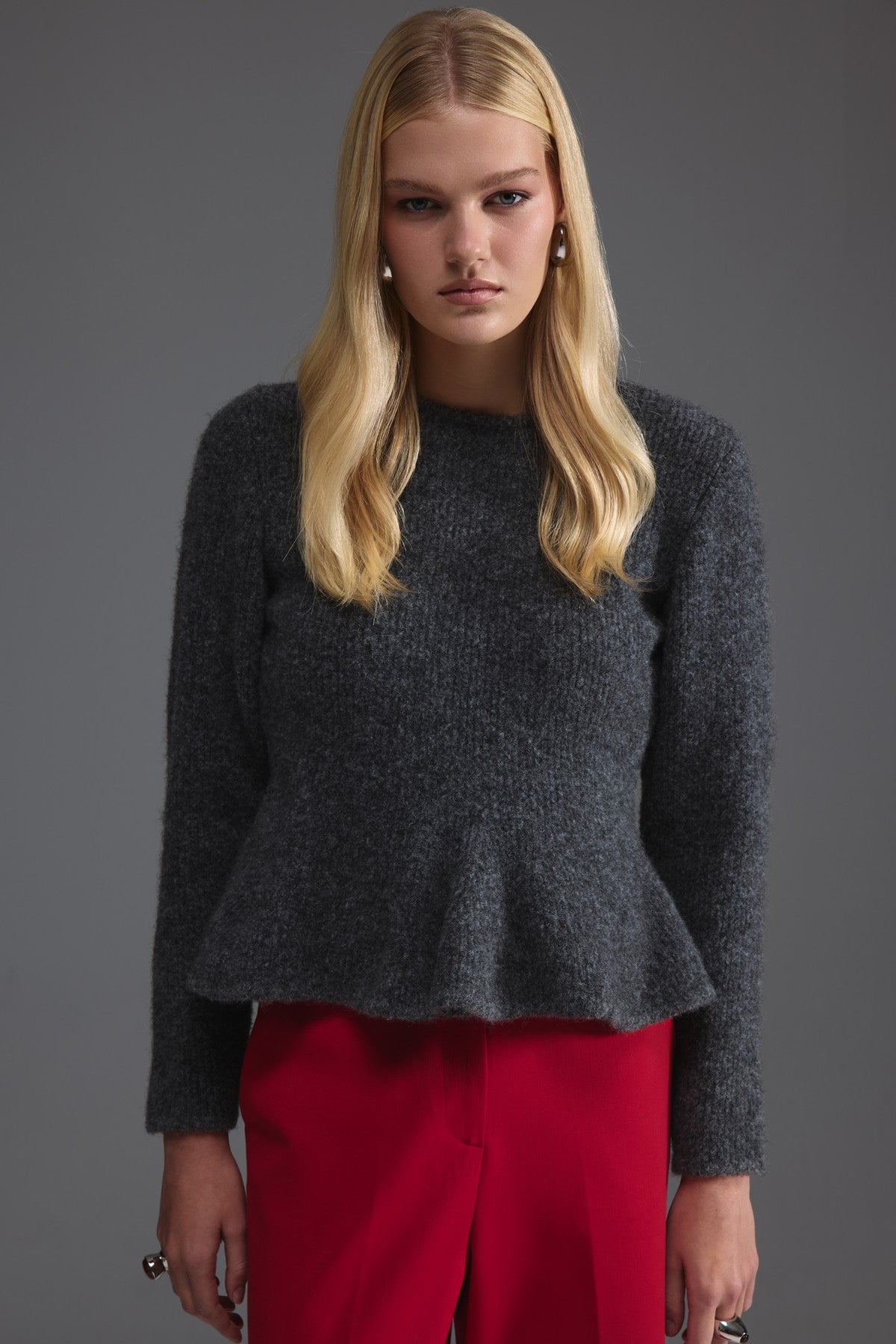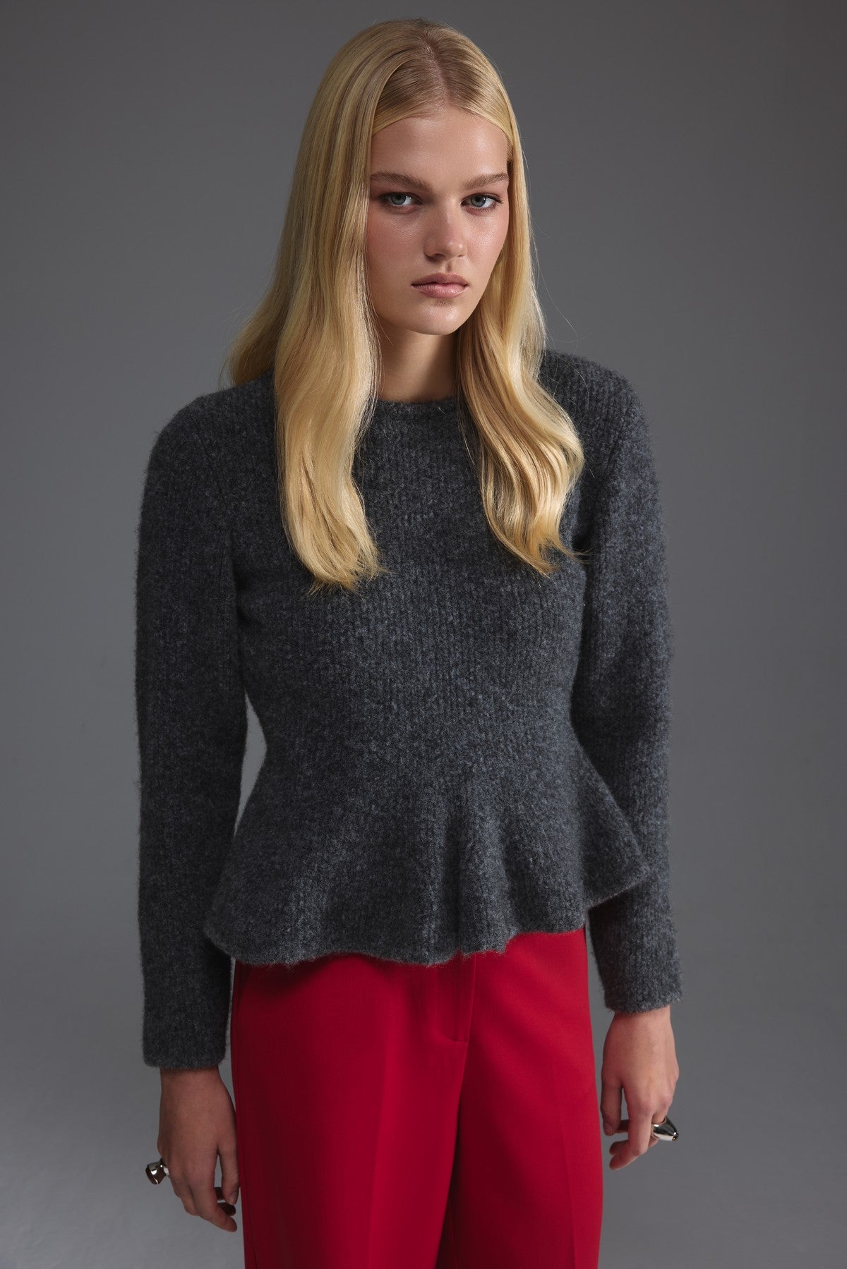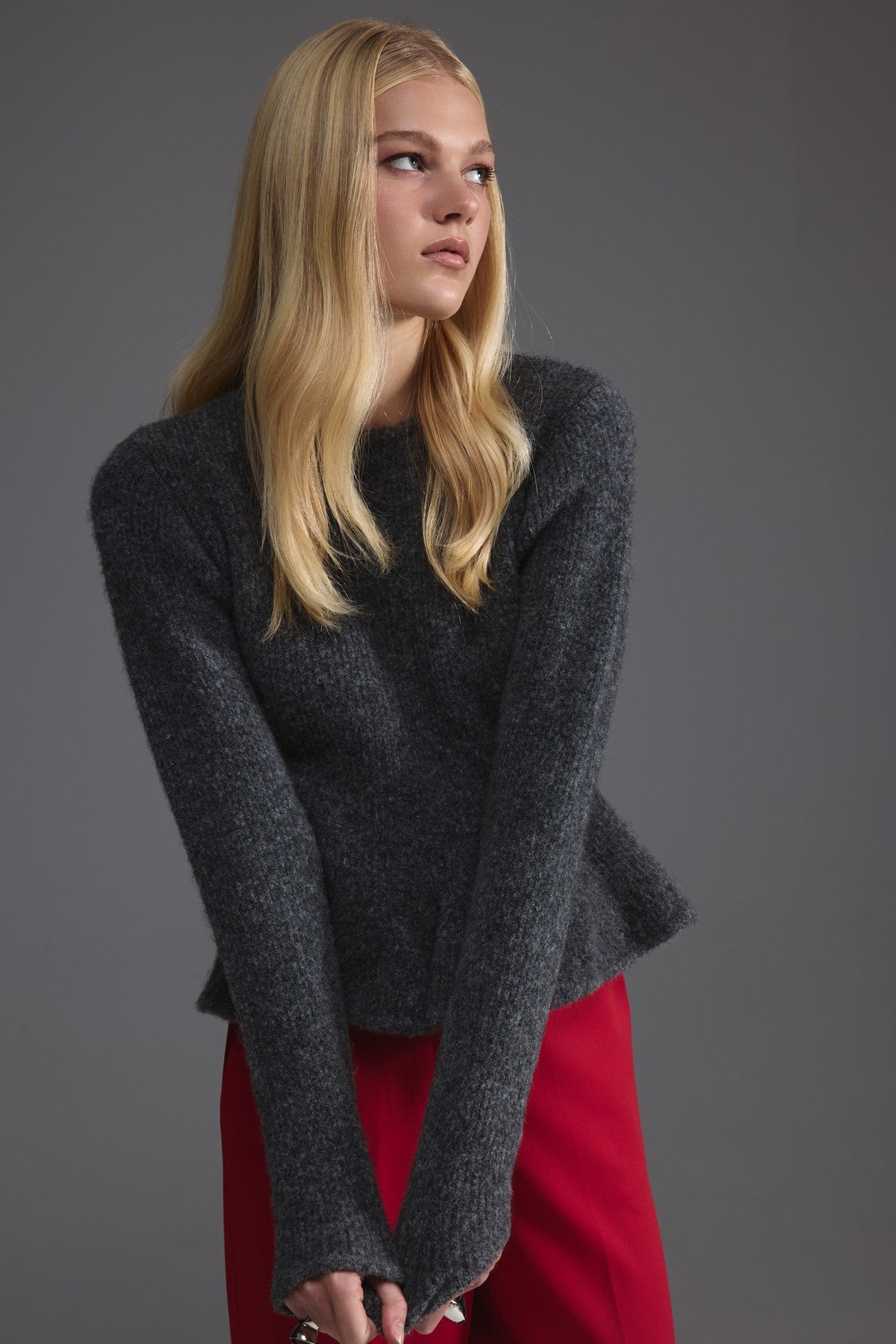 Yumuşak tüylü ipten örülmüş, yuvarlak yakalı, uzun kollu, bele oturan etek ucu kloş peplumlu kazak.
