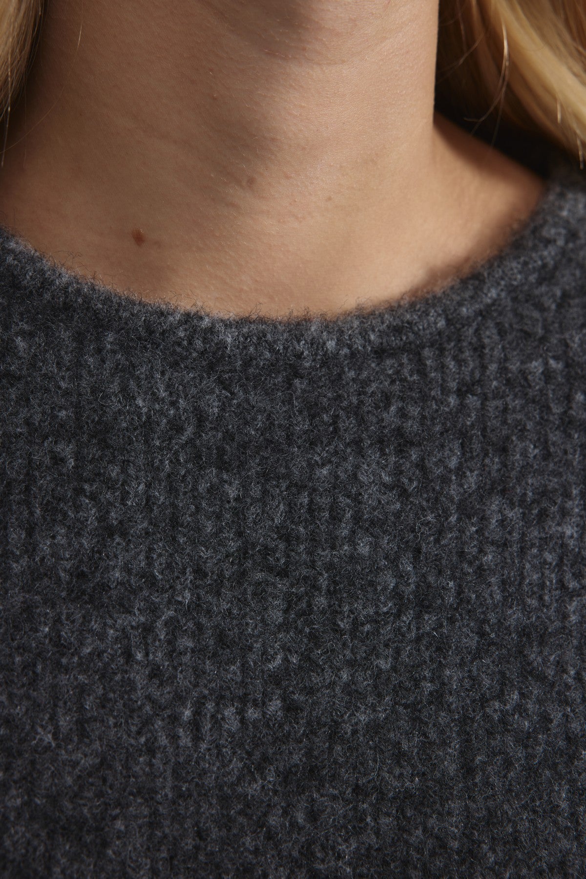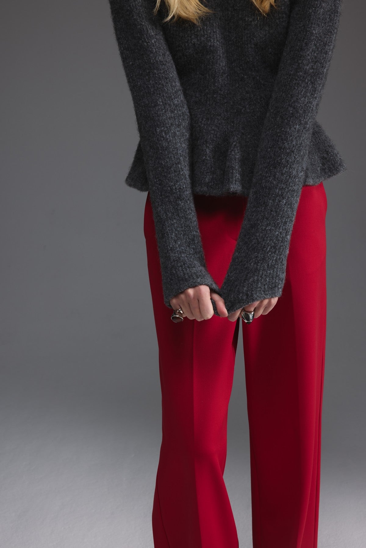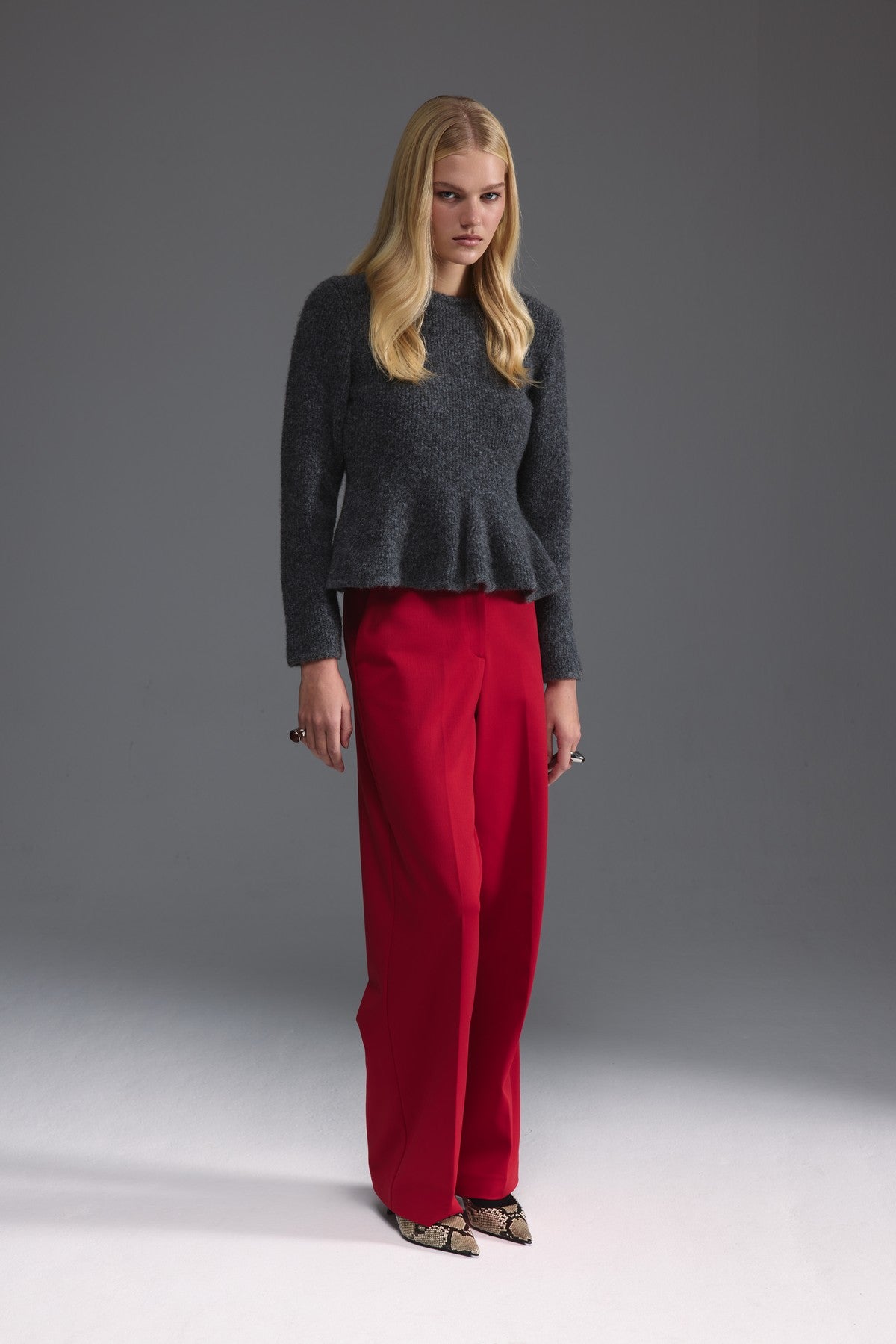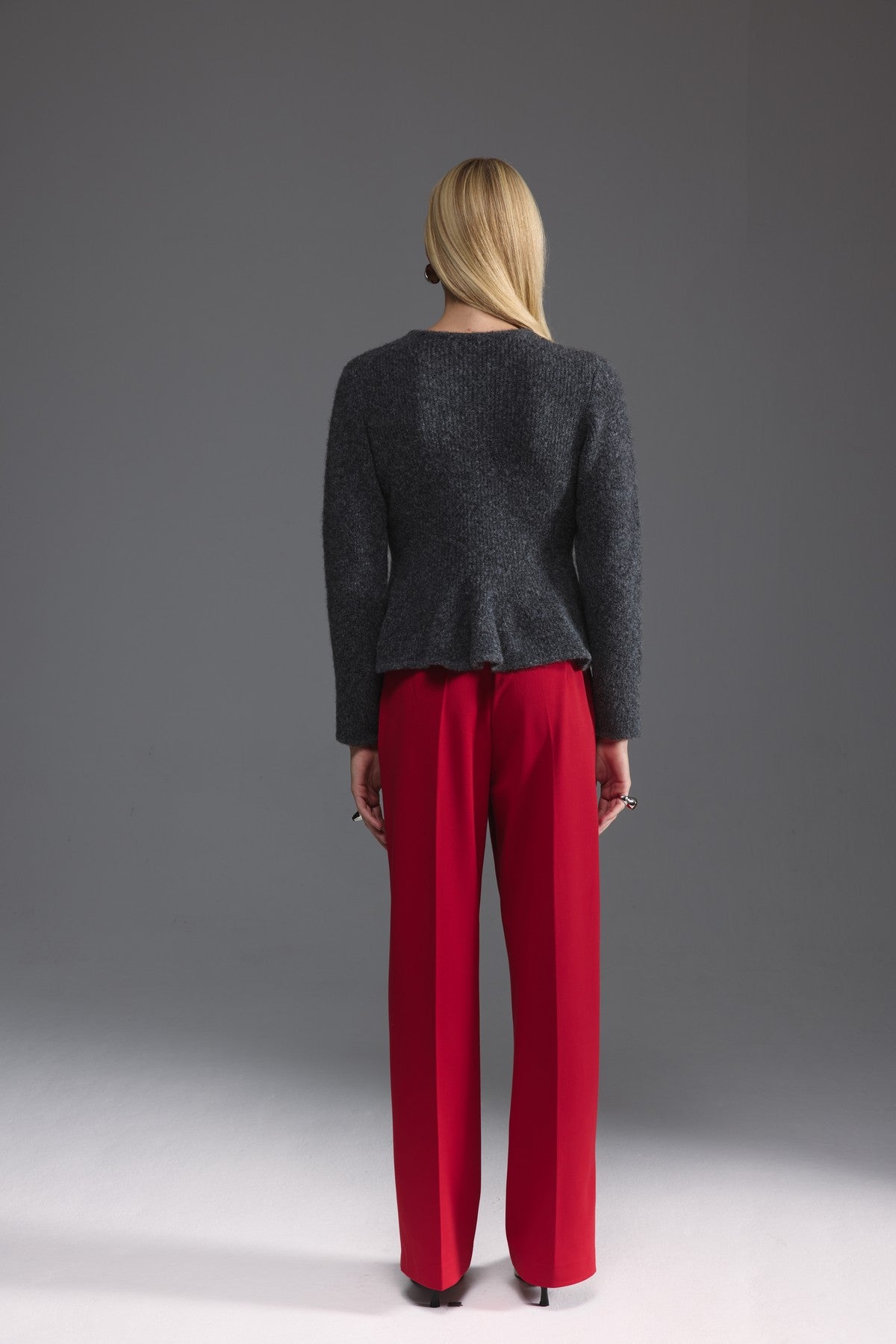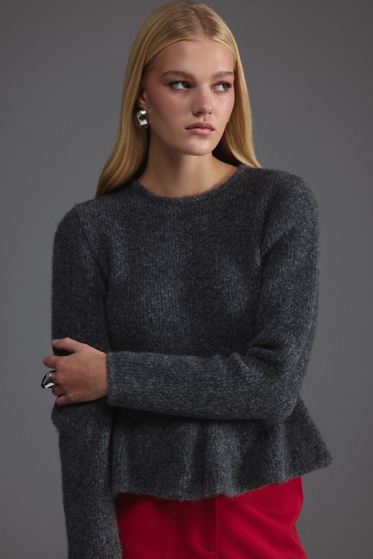 Yumuşak tüylü ipten örülmüş, yuvarlak yakalı, uzun kollu, bele oturan etek ucu kloş peplumlu kazak.