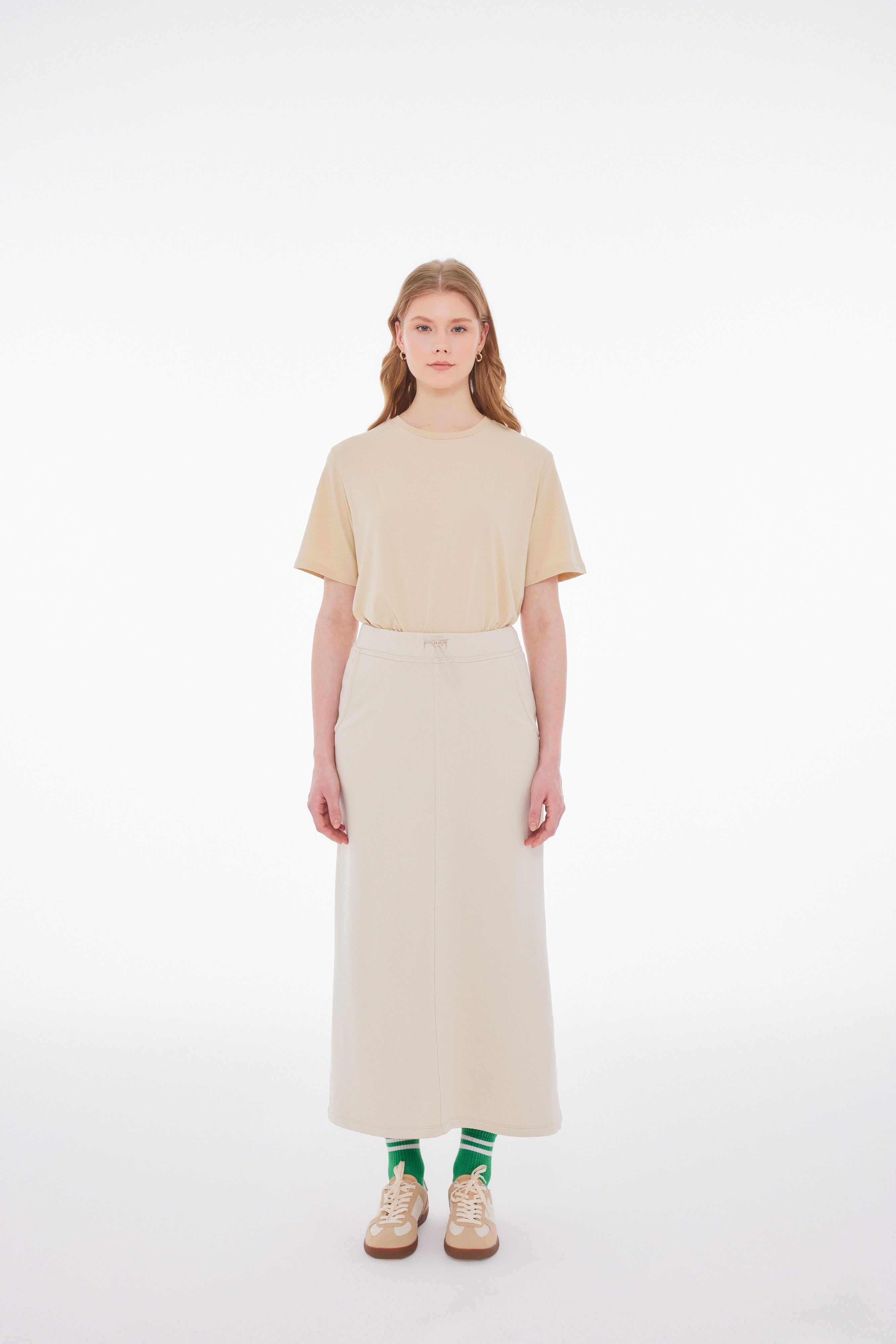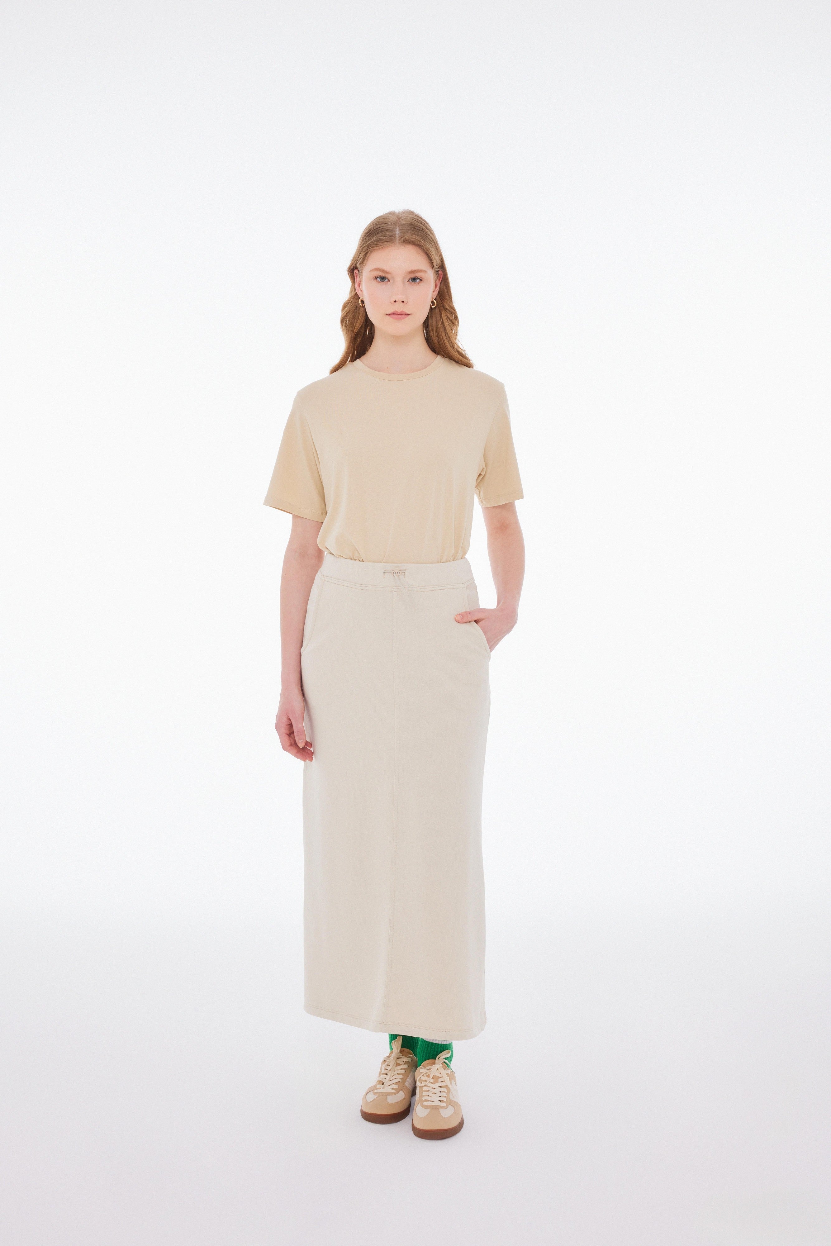 Pamuklu örme kumaştan, beli kaplı lastikli ve ip stoperli, elastik büzgü bağlı, bedene oturan uzun etek. Çapraz yan cepli, etek ucu düz kesimli Tailors Room Pamuklu Comfy Etek.