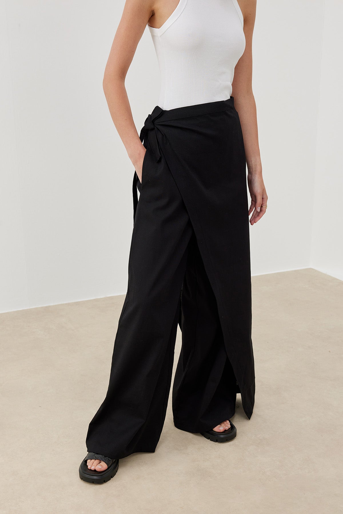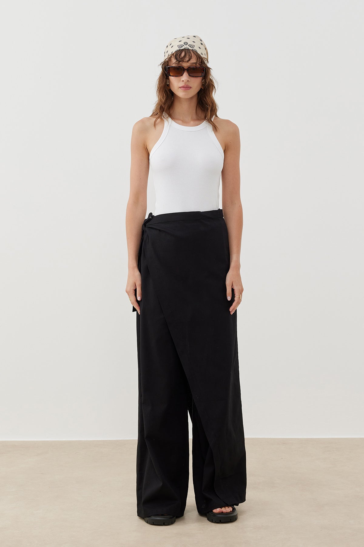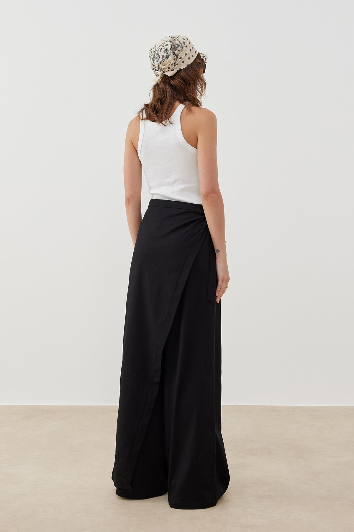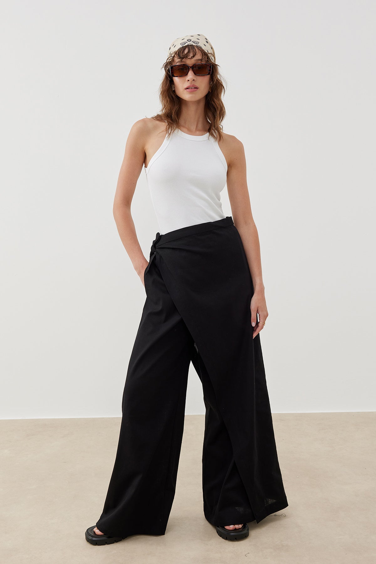 Pamuk dokuma kumaştan üretilen Keten Görünümlü Pareo Pantolon, keten dokusunu andıran hafif ve nefes alabilir kumaşıyla yaz aylarında konforlu bir kullanım sunar. Asimetrik kesimli üst parçası ve bağlama detayı sayesinde farklı şekillerde kullanılabilen bu özel tasarım, modern ve zarif bir görünüm sağlar.