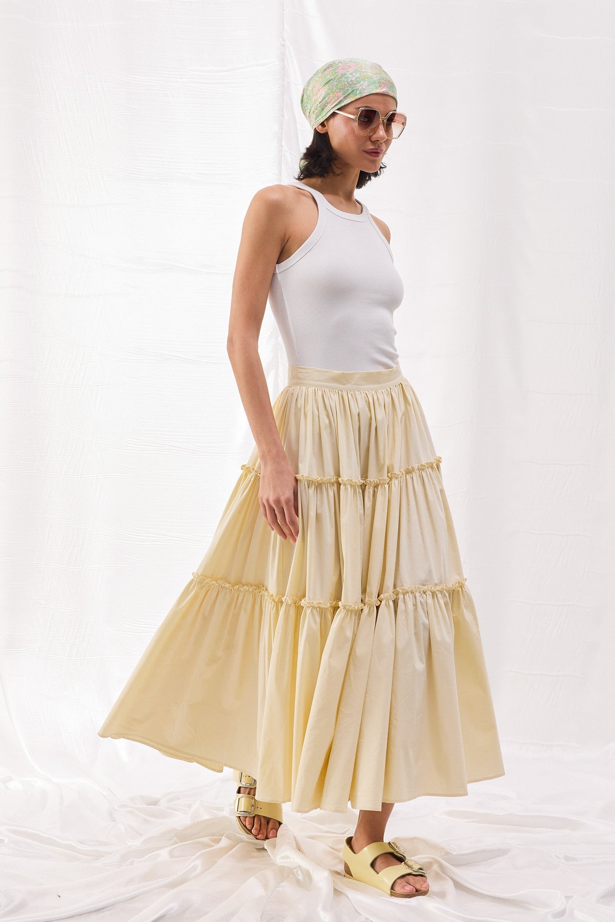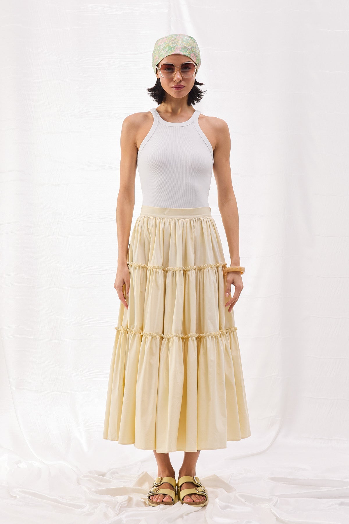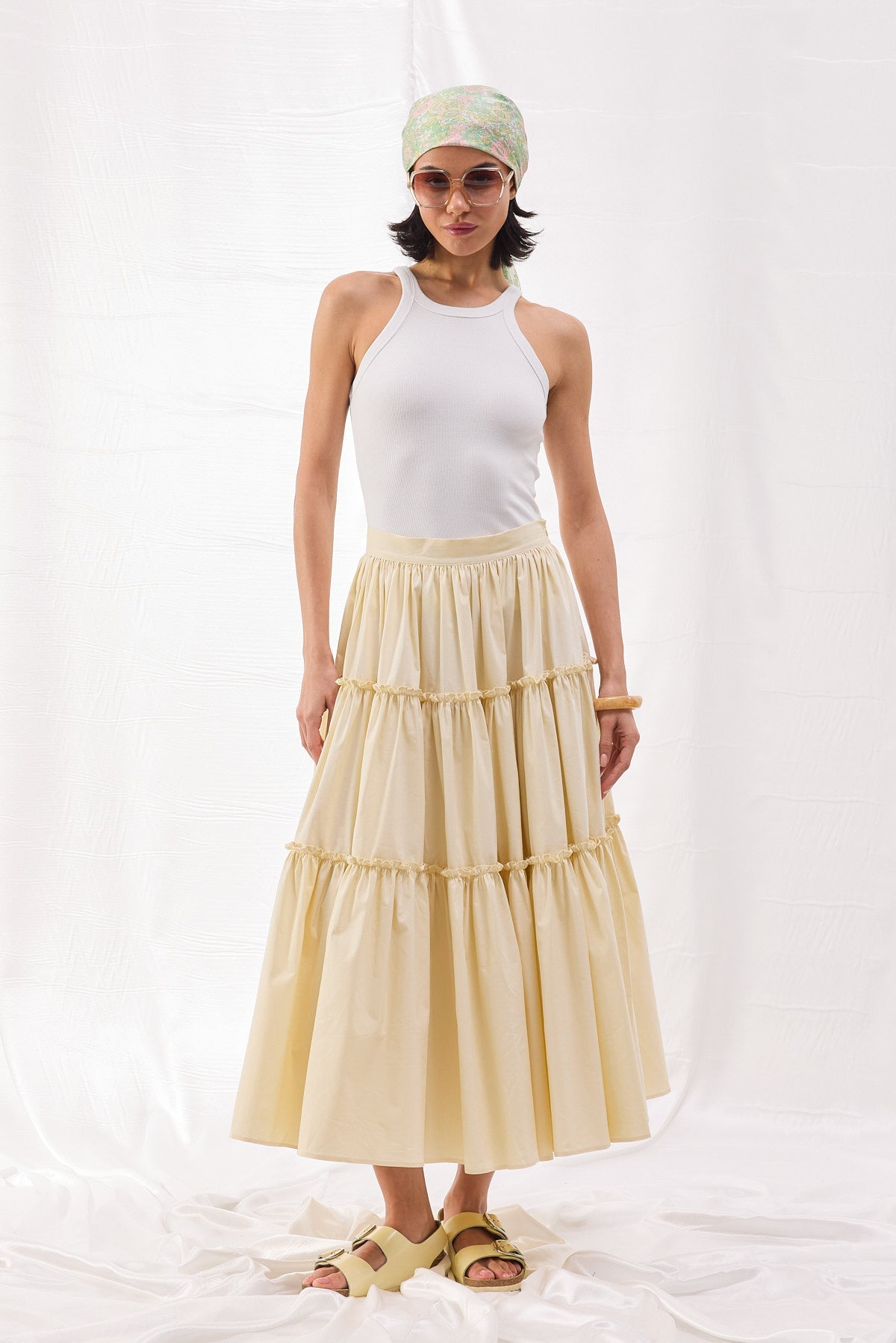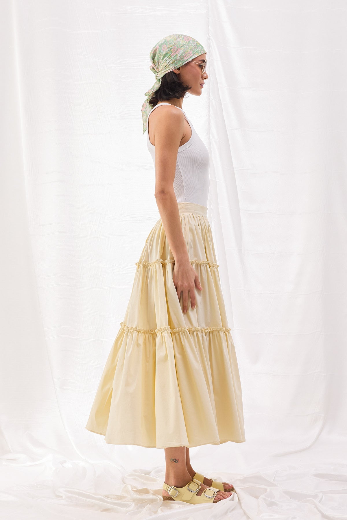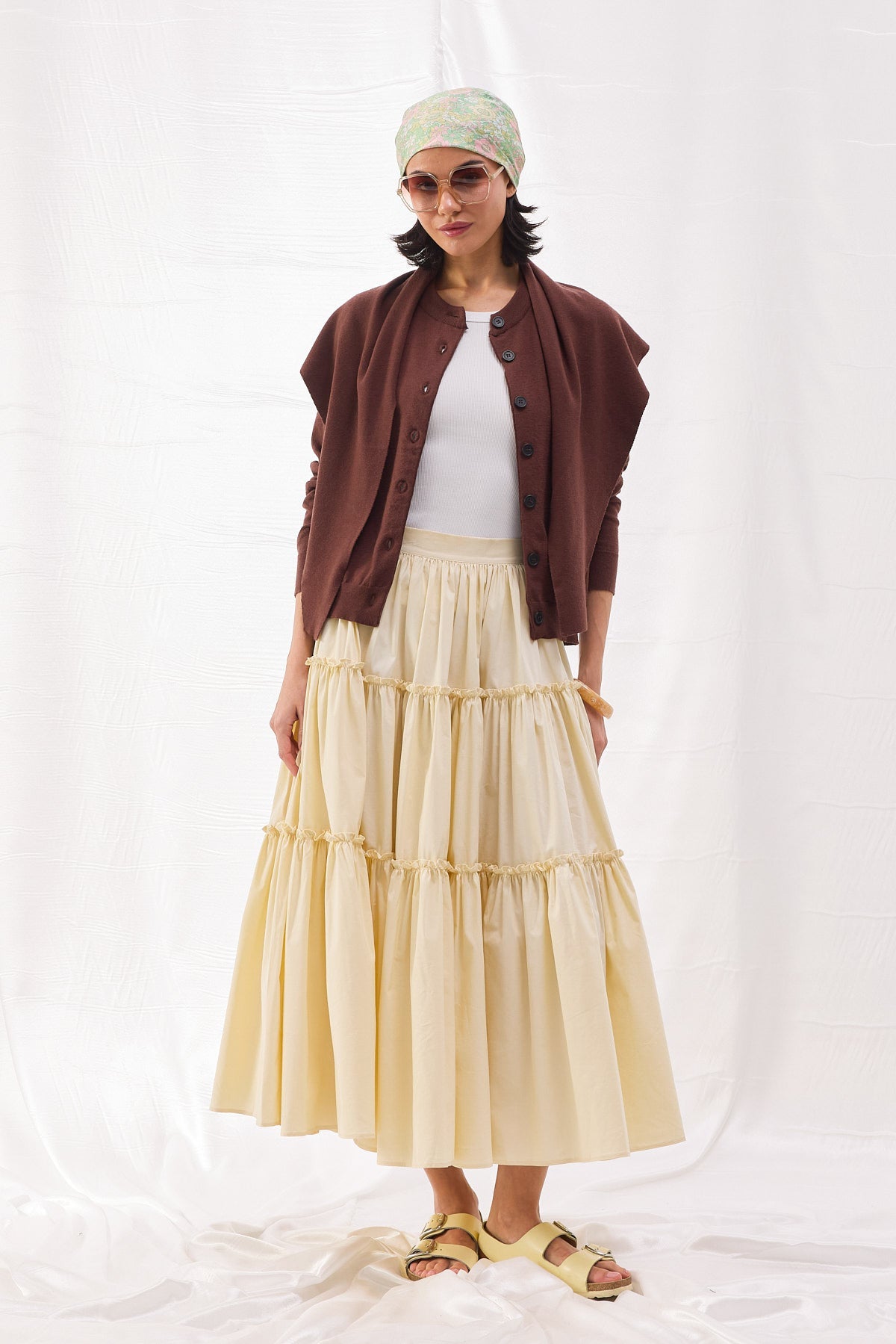 Pamuklu kumaştan, kat kat büzgülü, fermuarlı kloş etek. Astarsız.