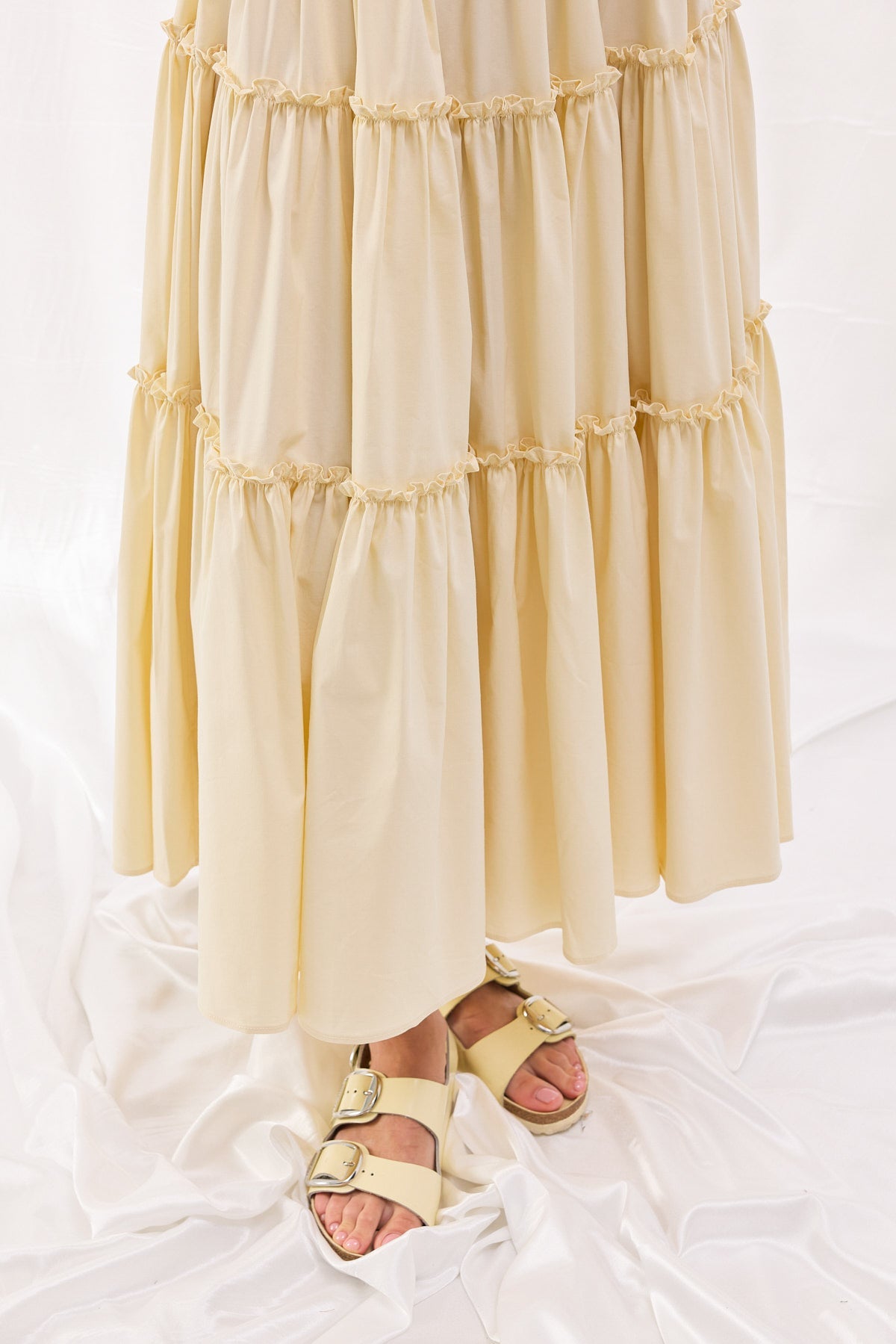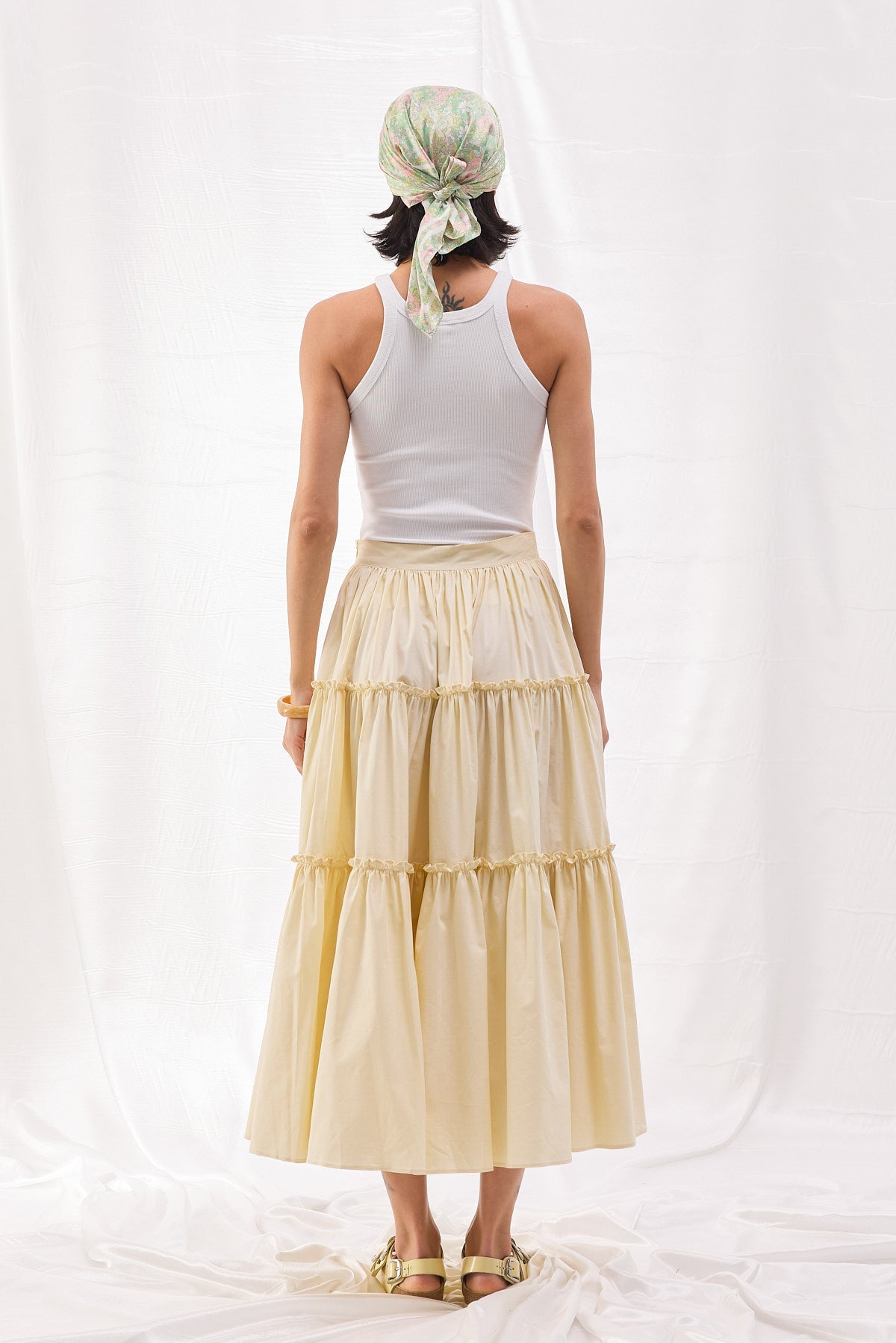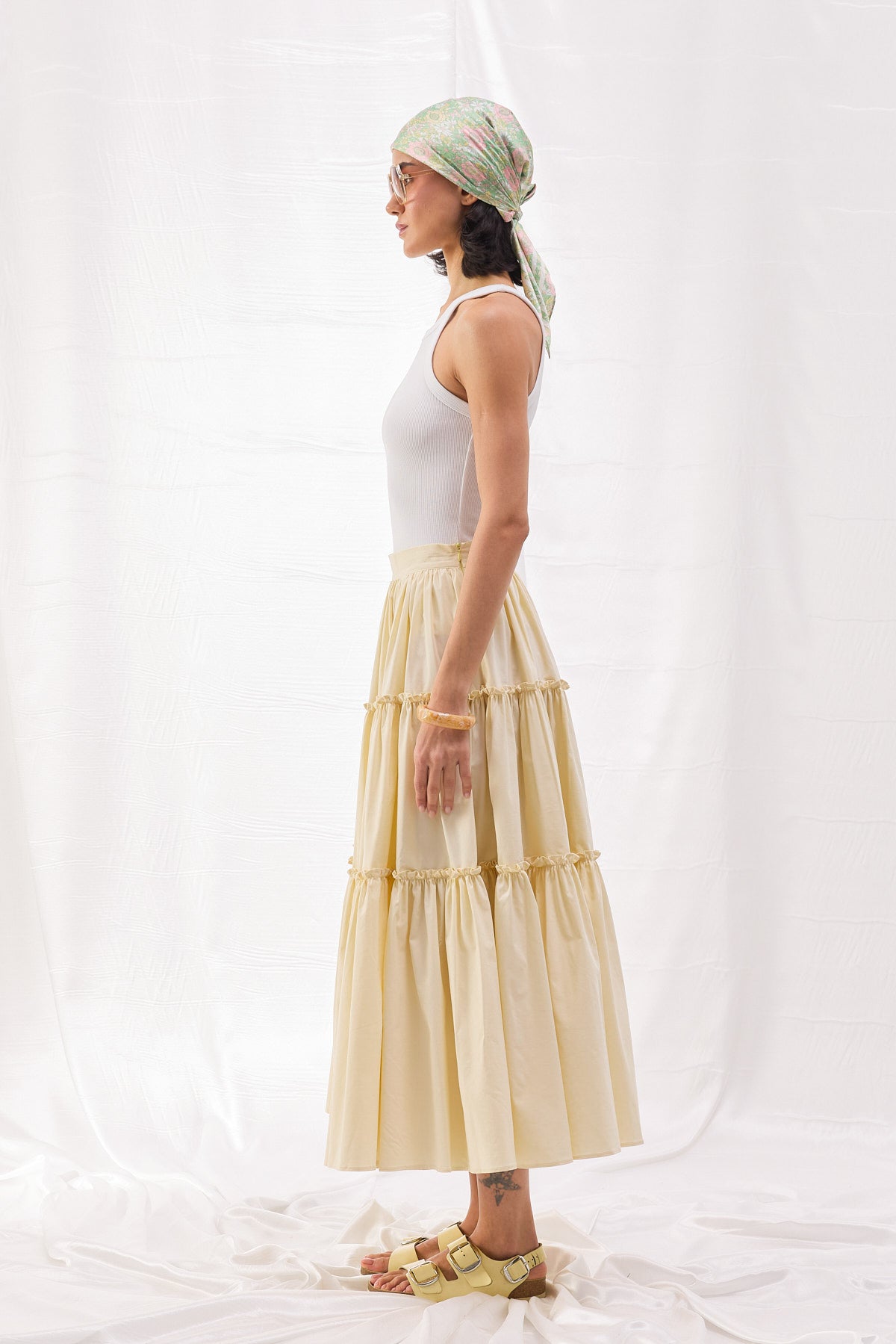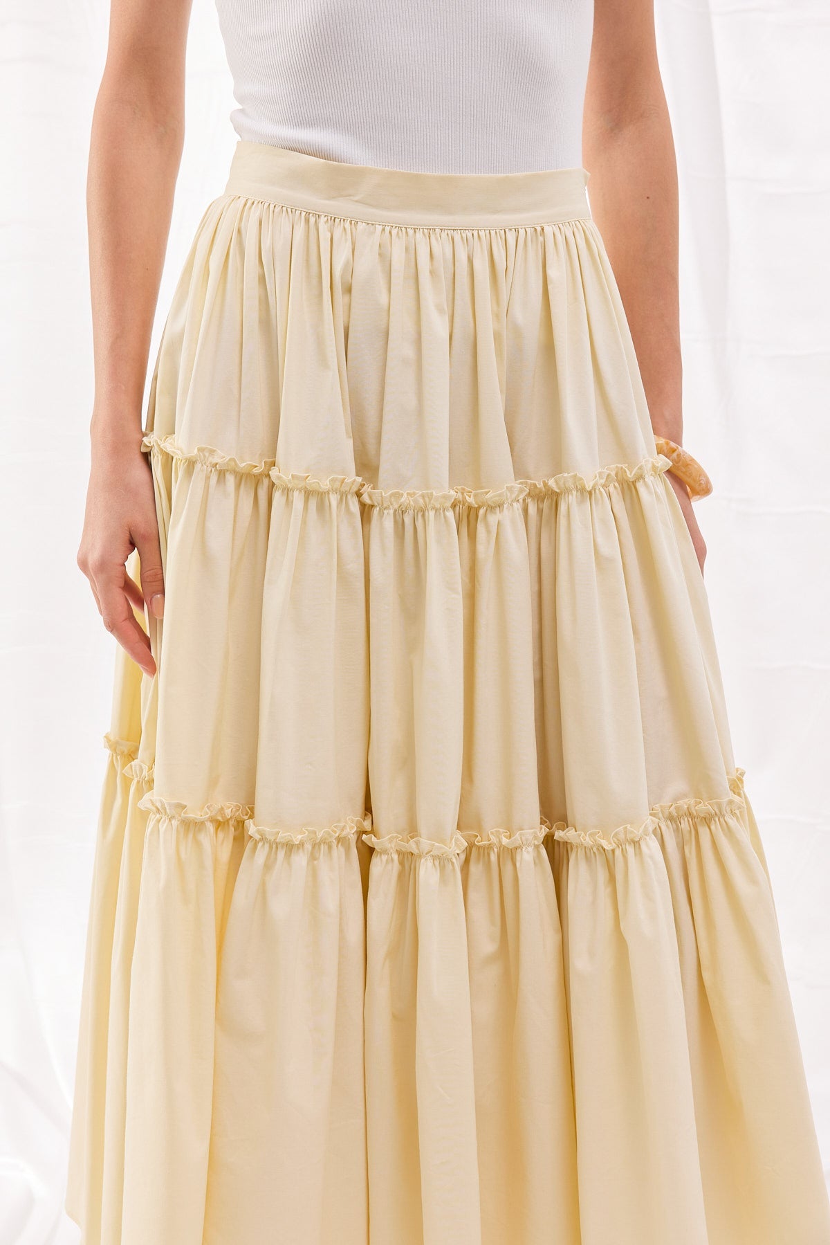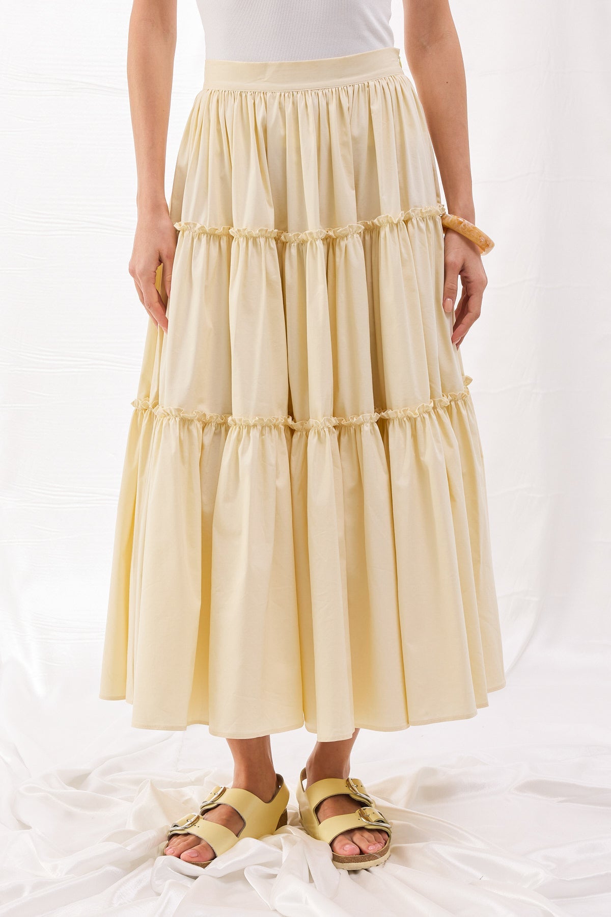 Pamuklu kumaştan, kat kat büzgülü, fermuarlı kloş etek. Astarsız.