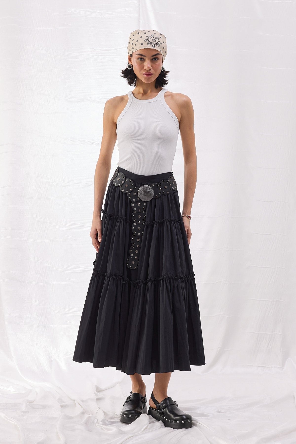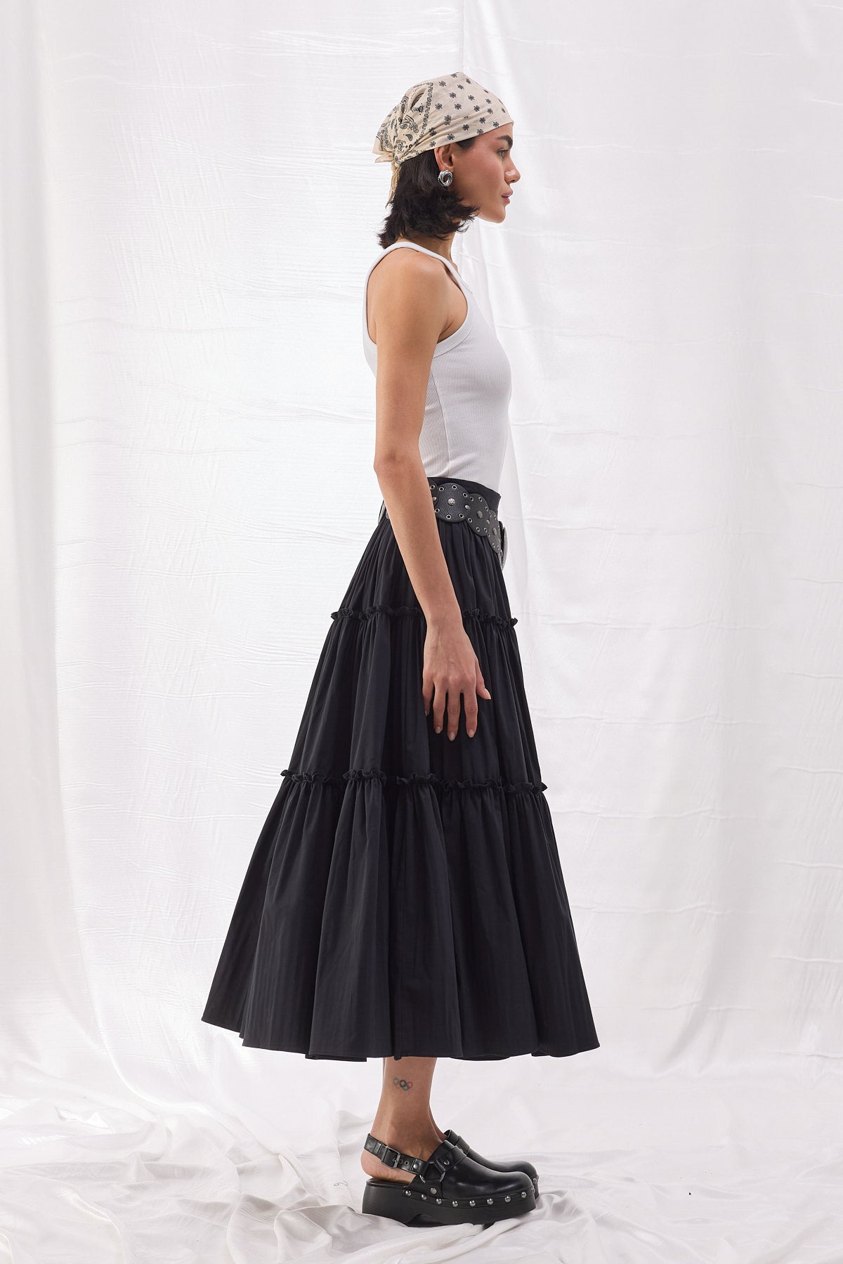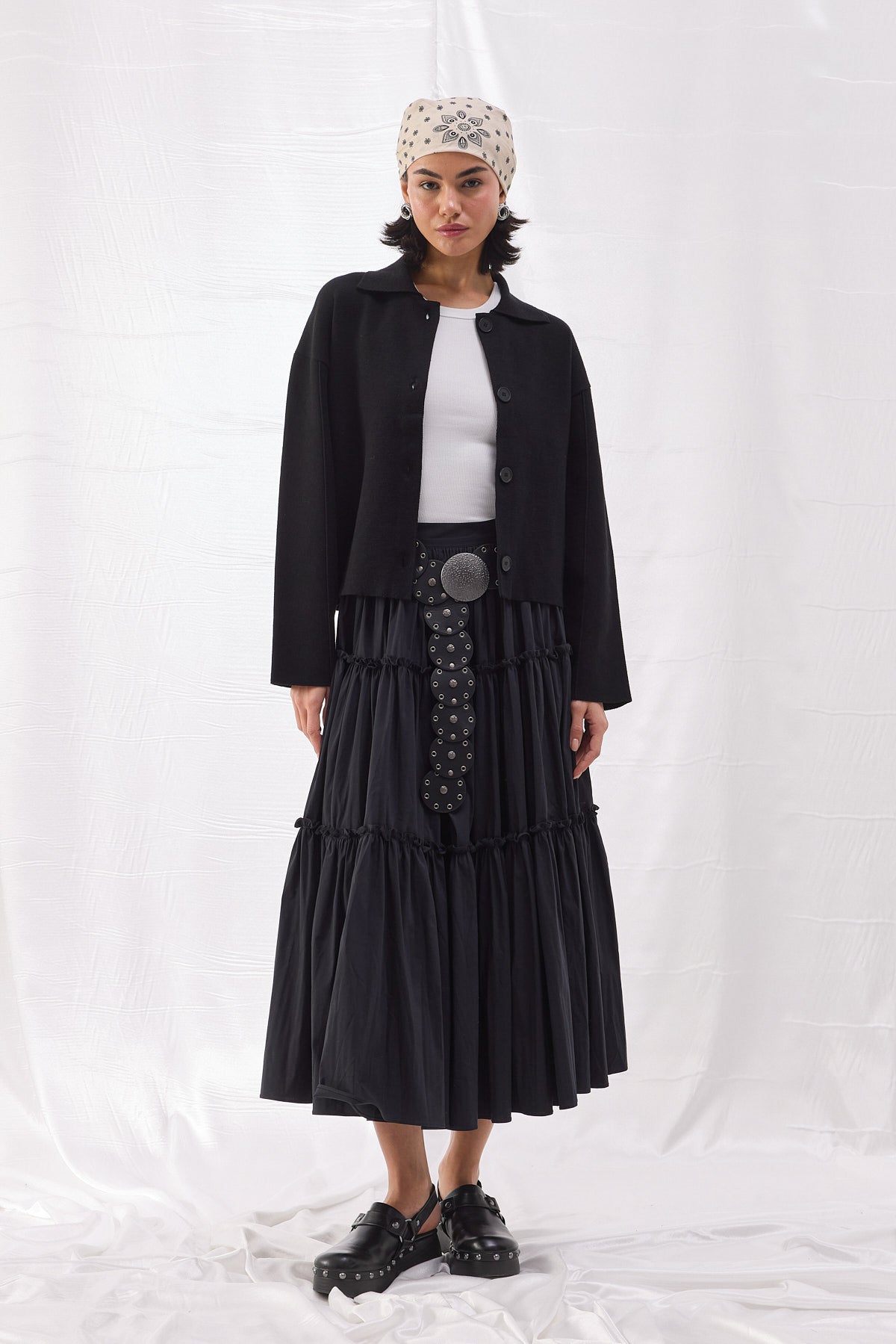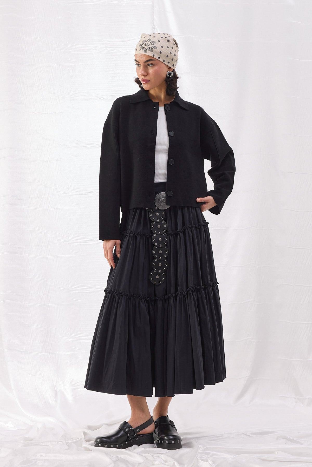 Pamuklu kumaştan, kat kat büzgülü, fermuarlı kloş etek. Astarsız.