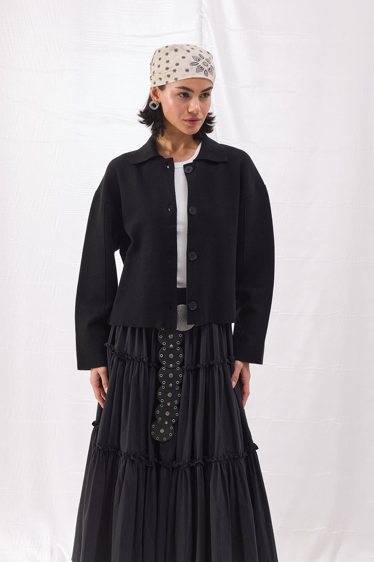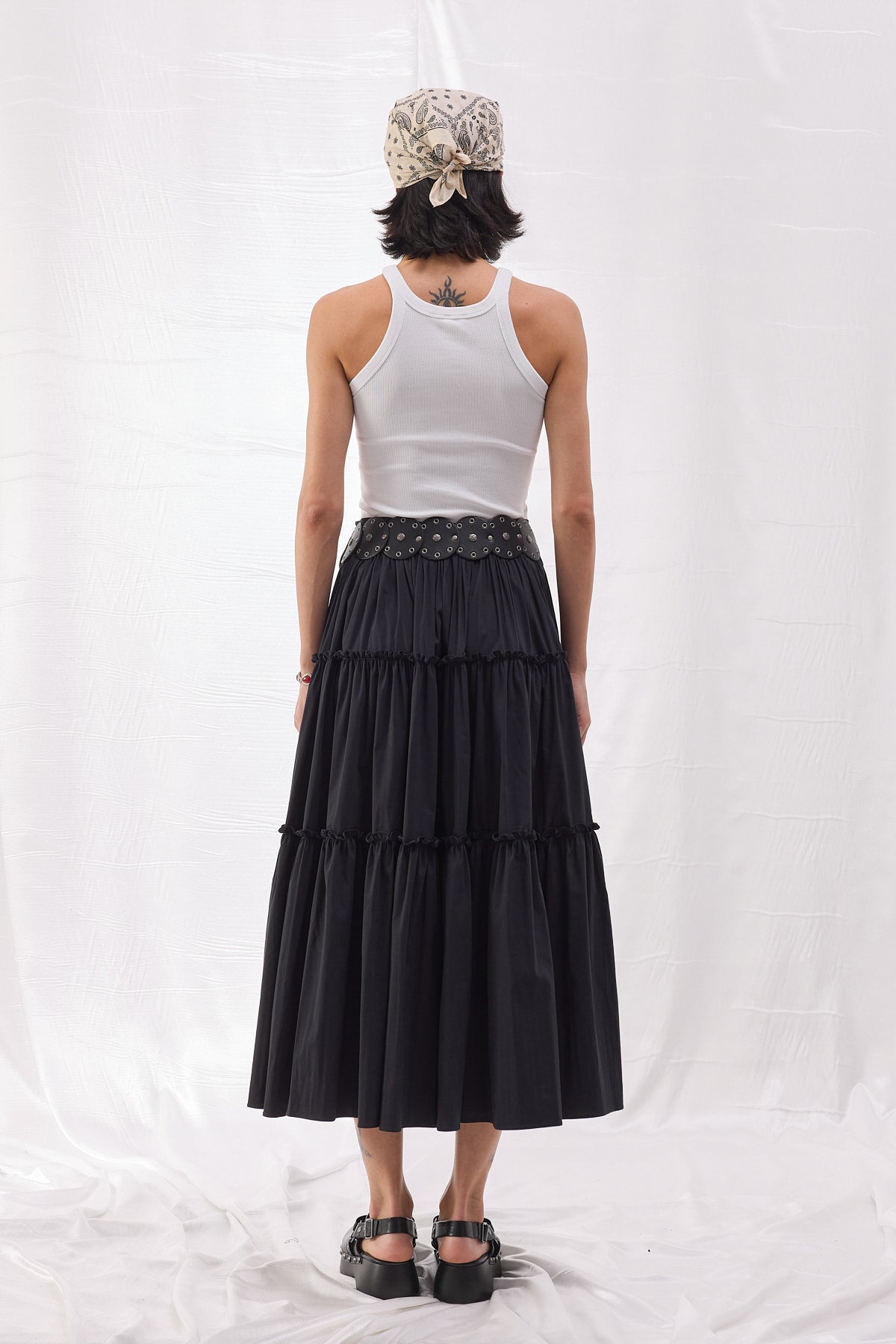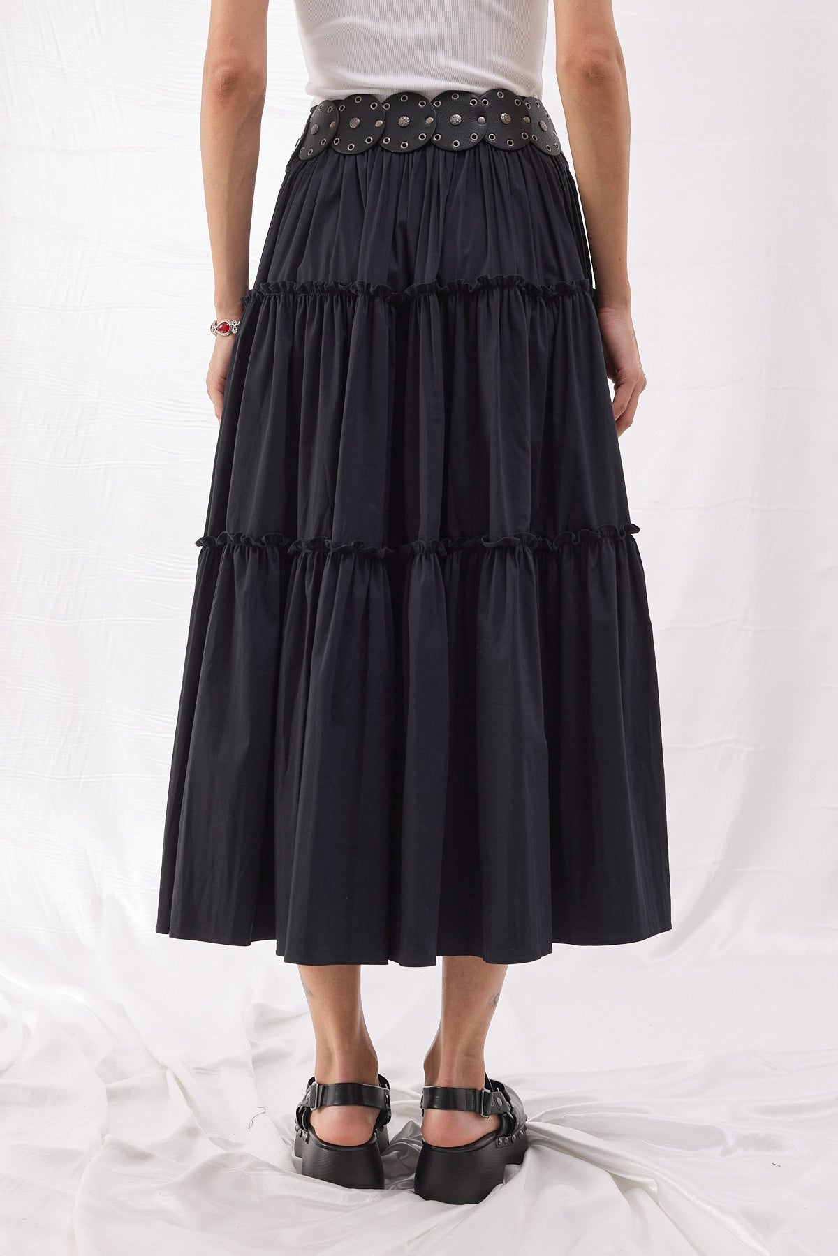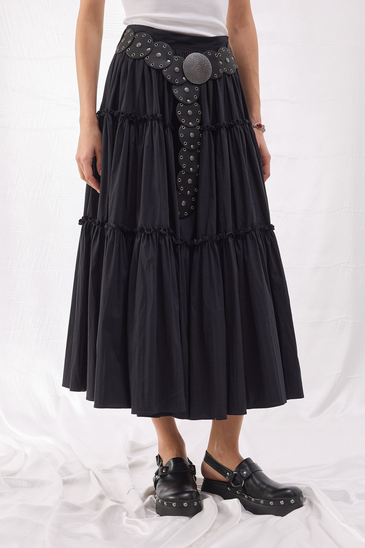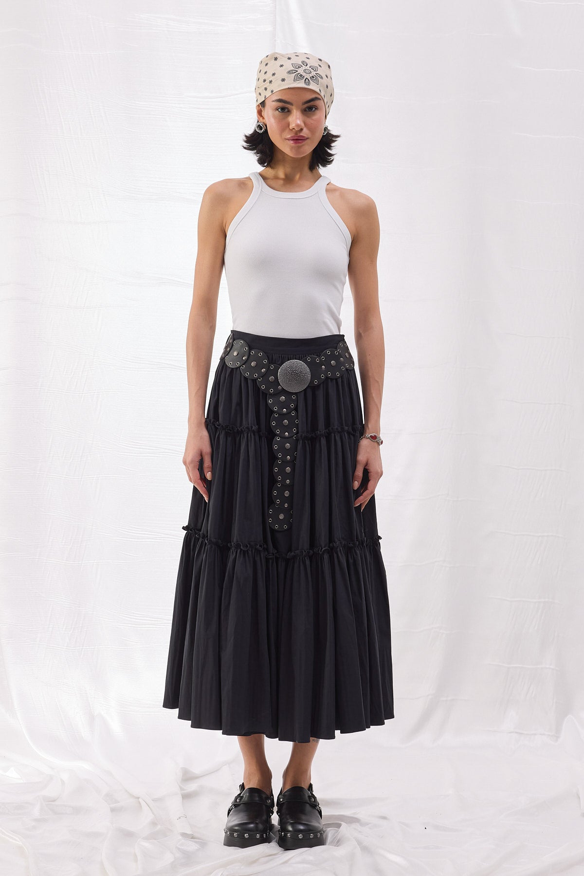 Pamuklu kumaştan, kat kat büzgülü, fermuarlı kloş etek. Astarsız.