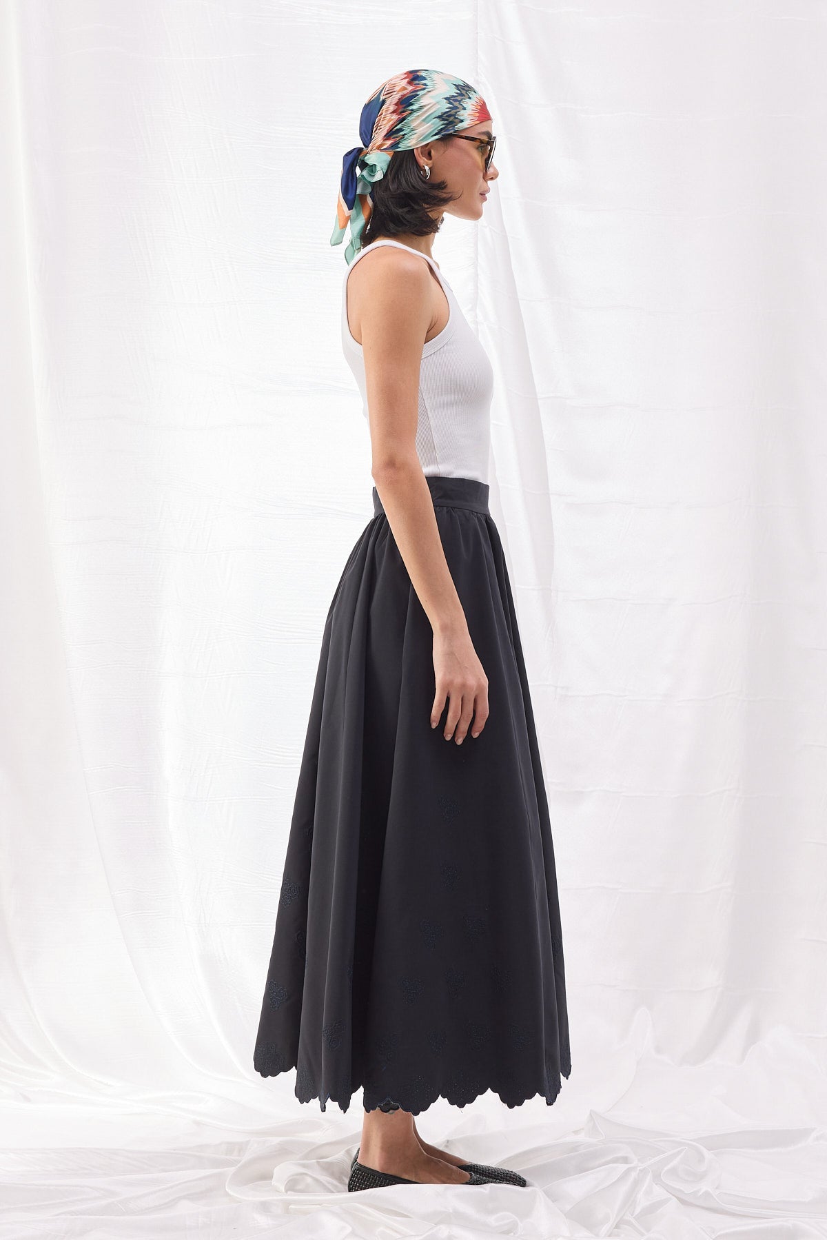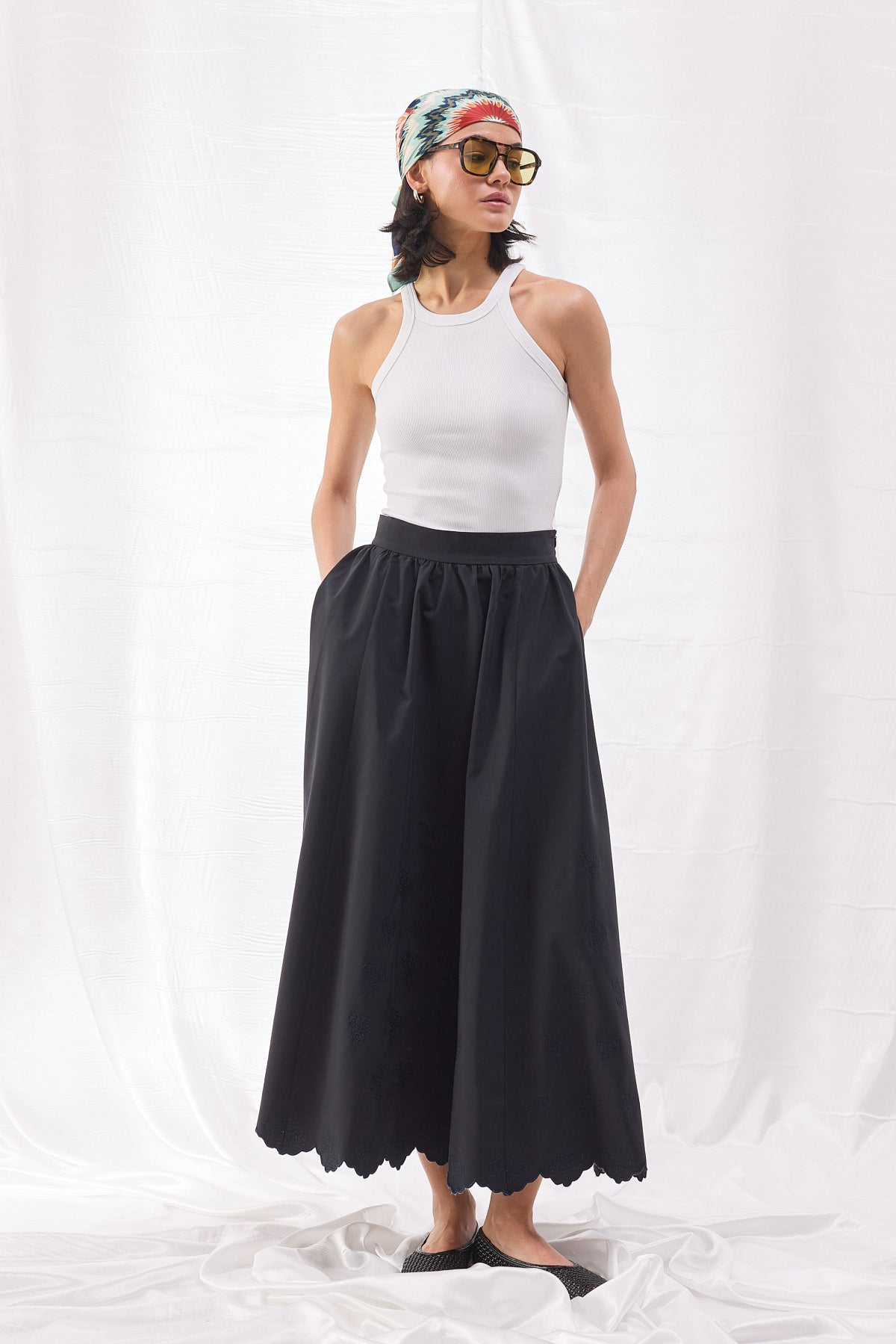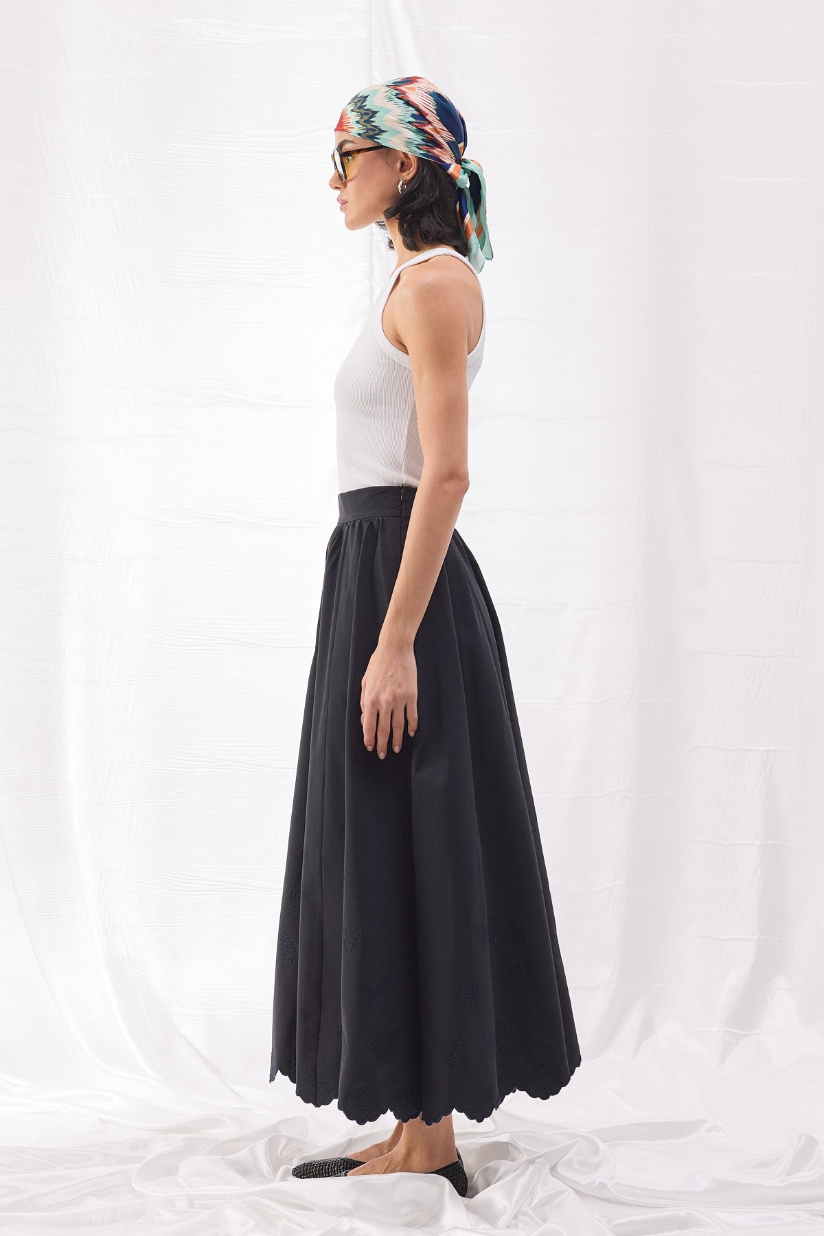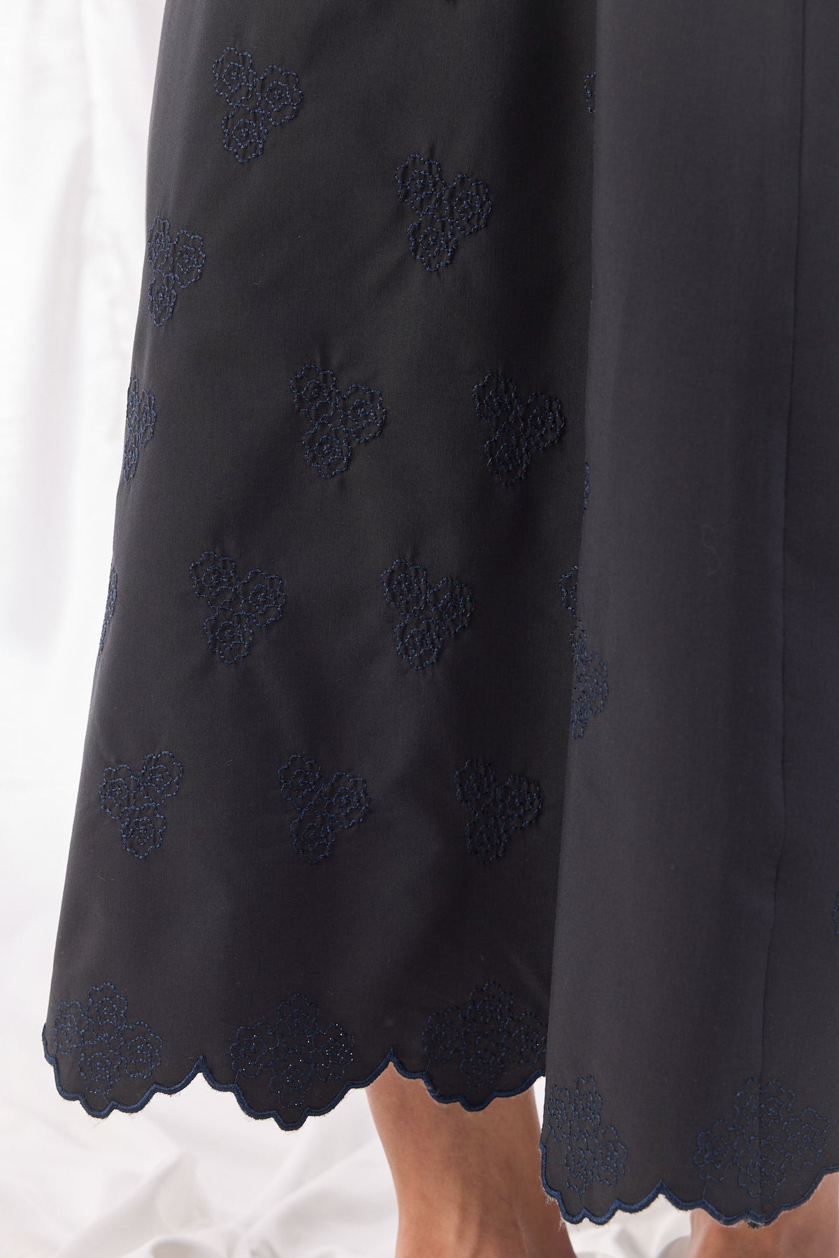 Pamuklu kumaştan, etek uçları lazer kesim detaylı, nakışlı ve fermuarlı. Astarsız.