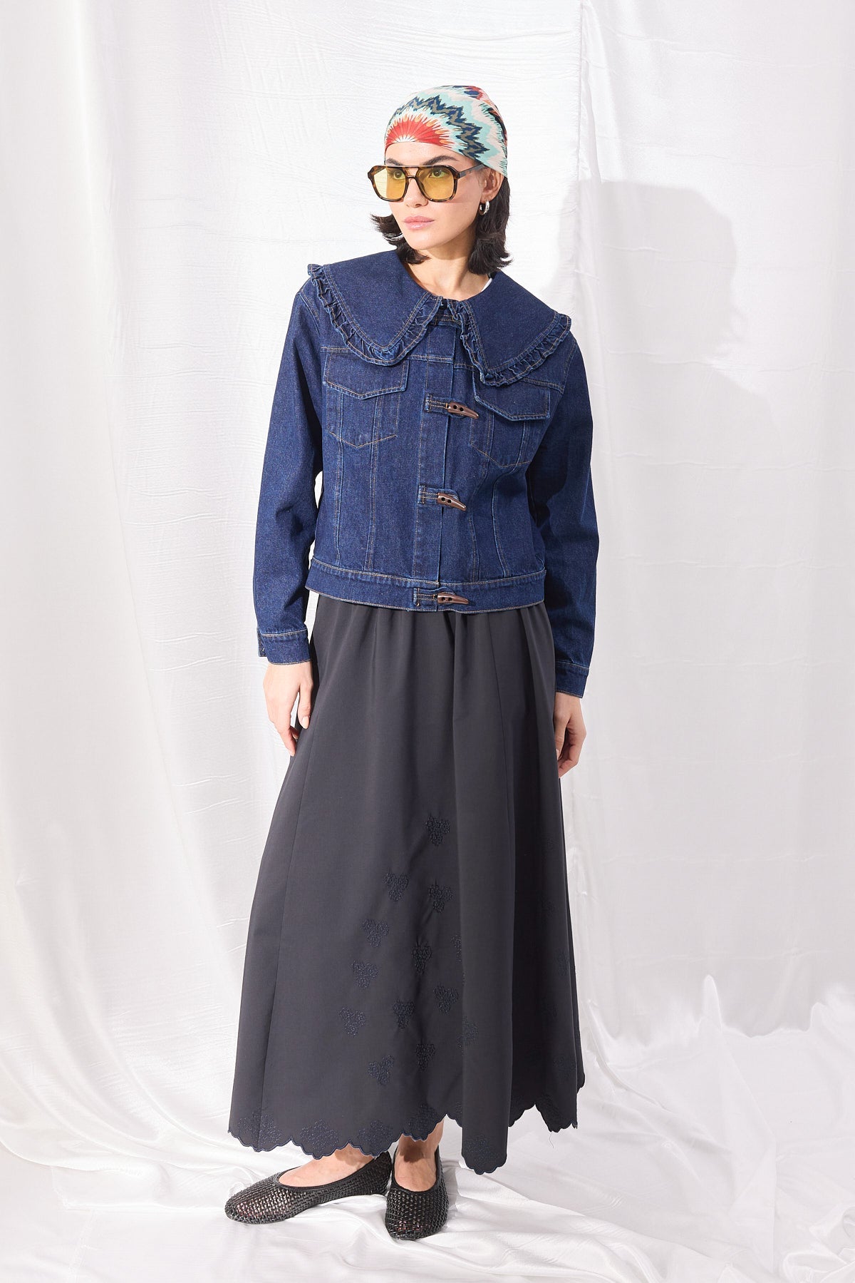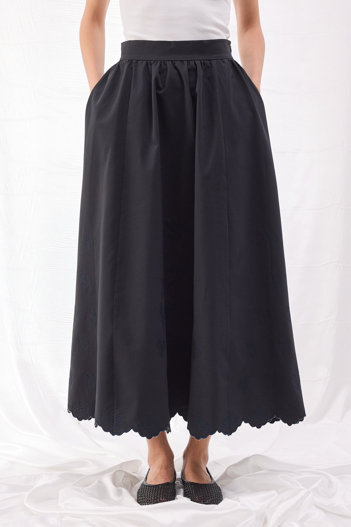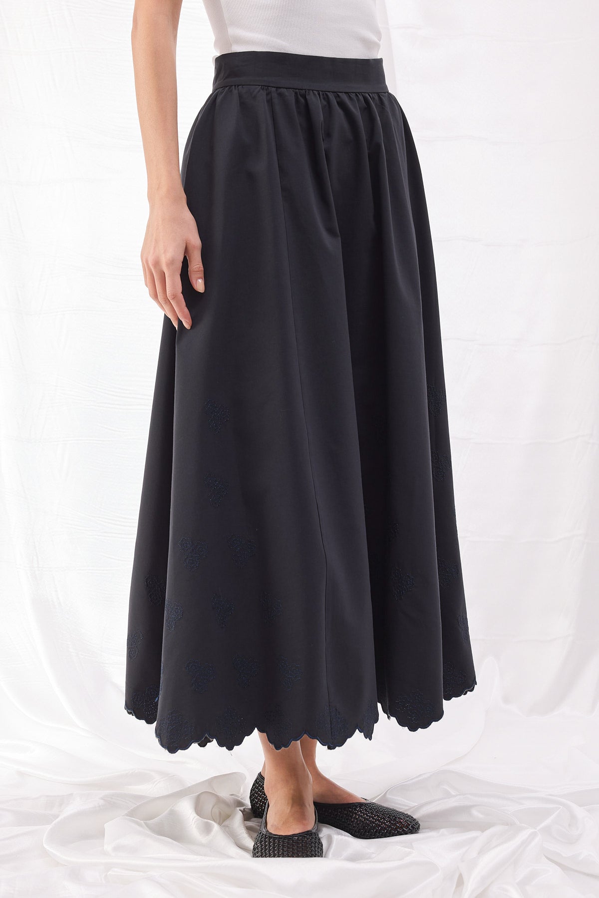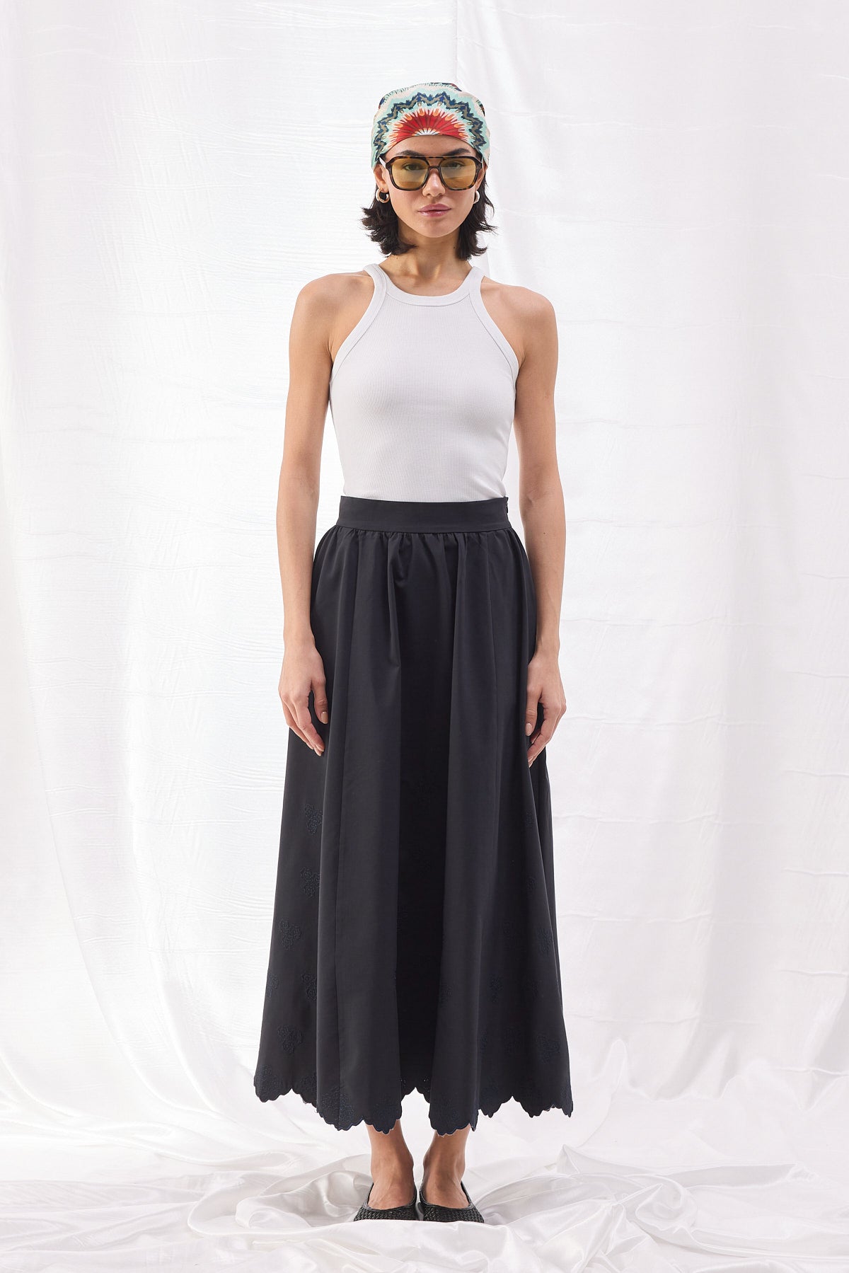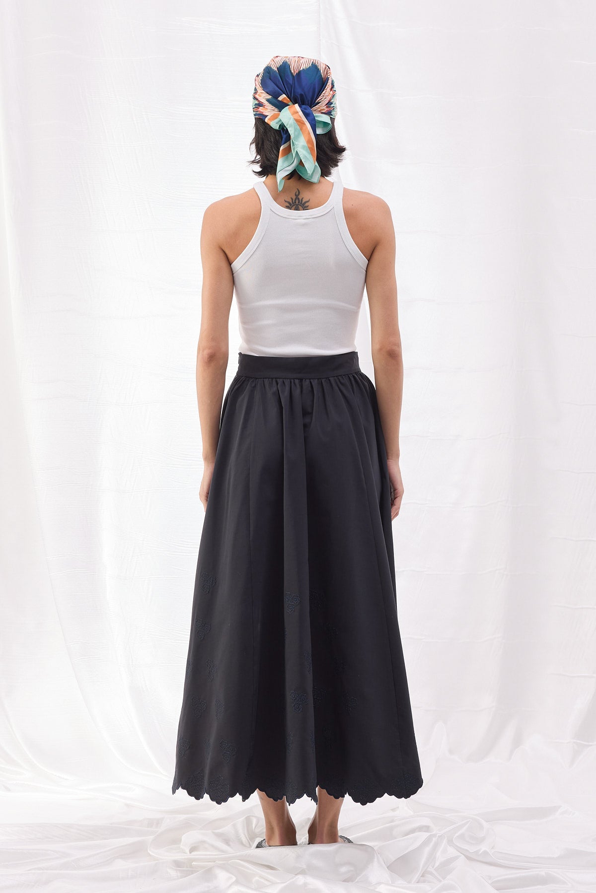 Pamuklu kumaştan, etek uçları lazer kesim detaylı, nakışlı ve fermuarlı. Astarsız.