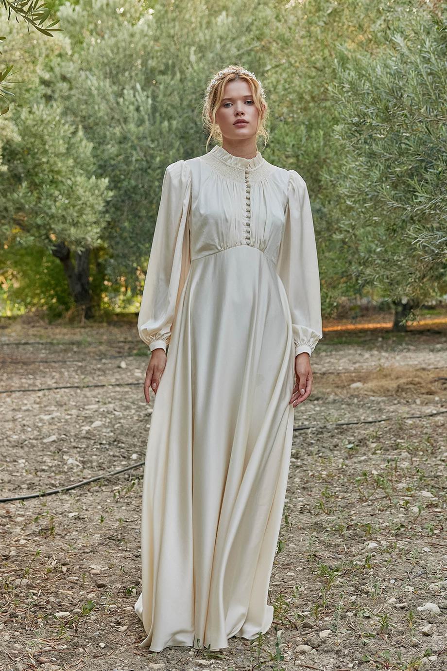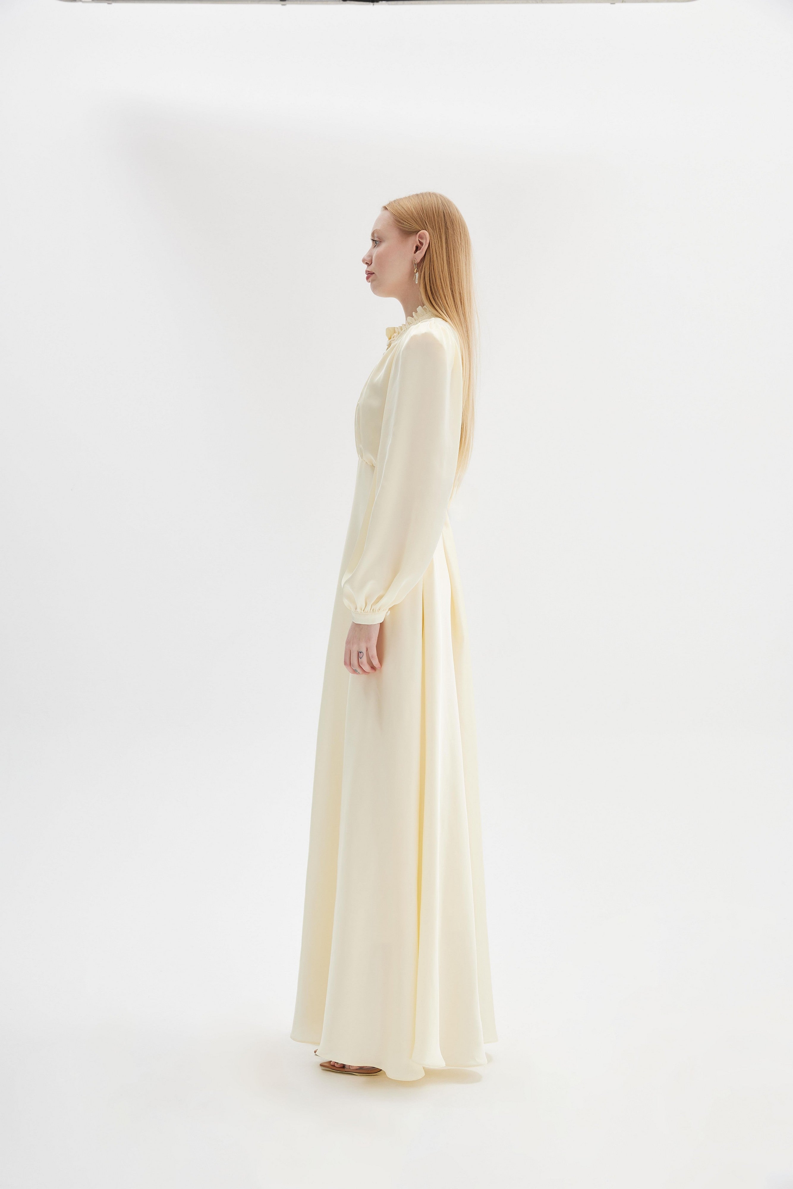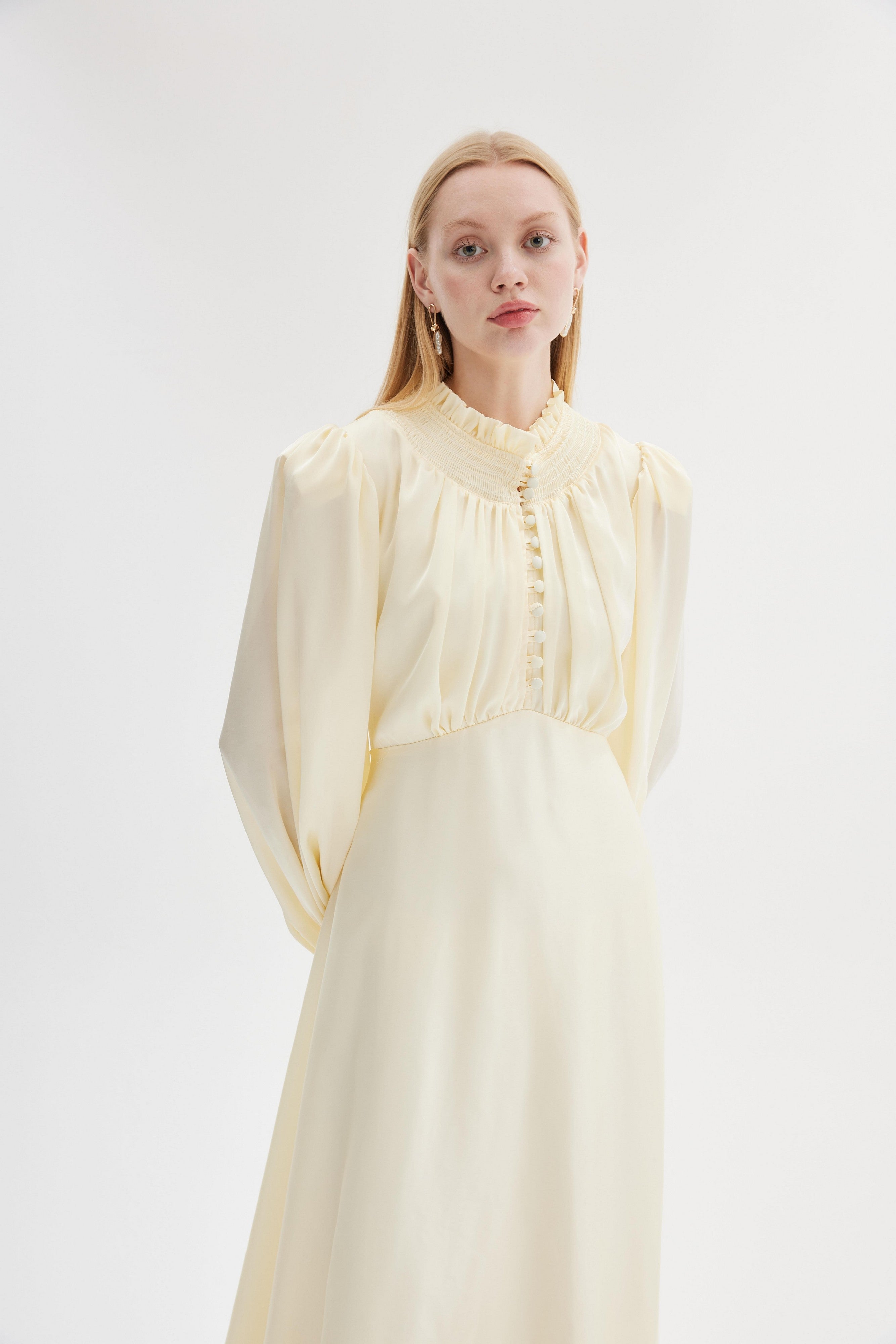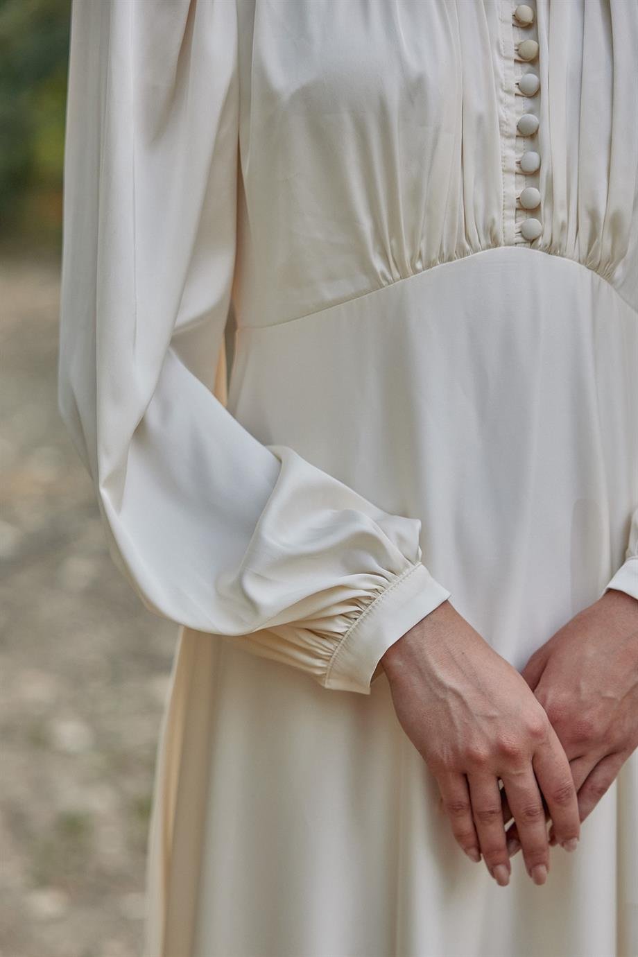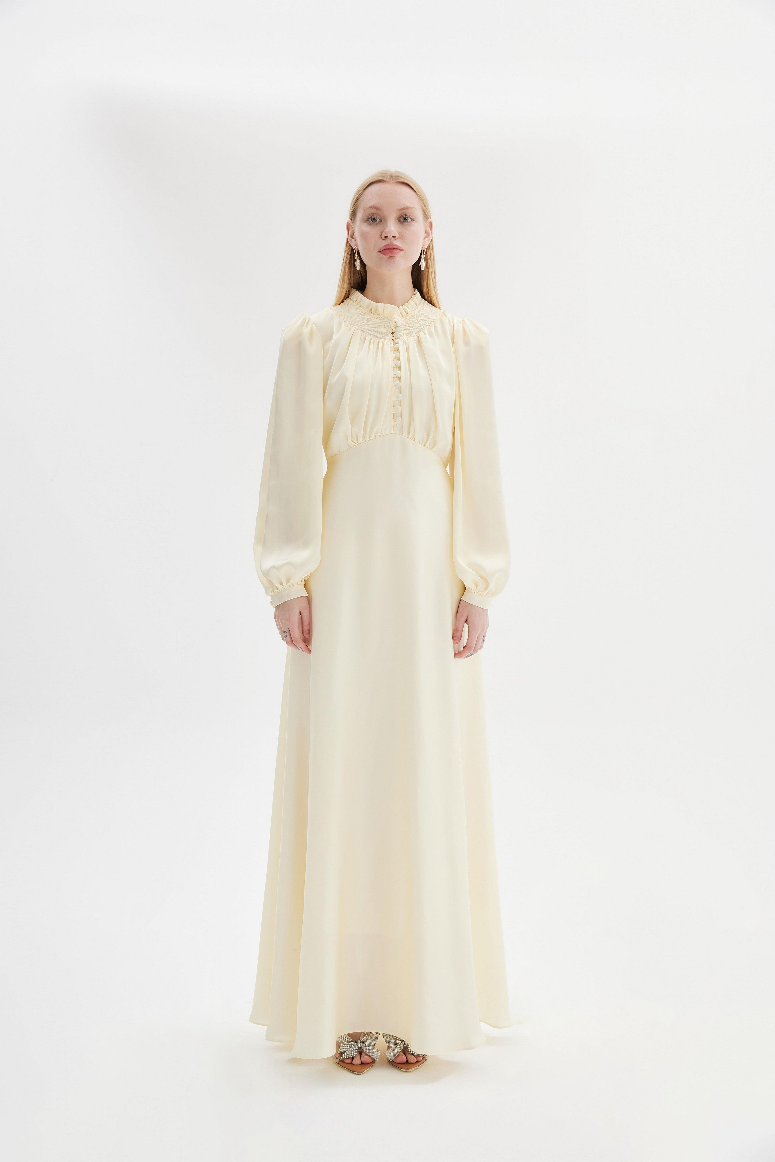 Hafif dökümlü ipek satenden, hakim yaka, boğaz kısmı gipe detaylı, göğüs altından büzgülü, üst kısmında birit kaplama düğmeli, uzun balon kollu, ince manşetli, yan kısmından gizli fermuarlı, astarlı Tailor’s Room Saten Gece Elbisesi