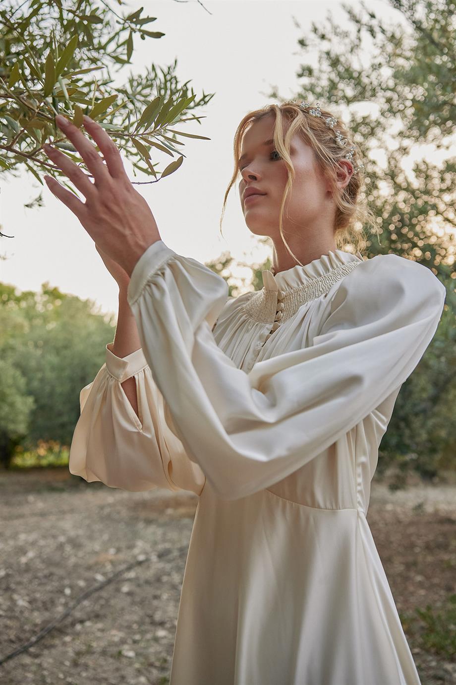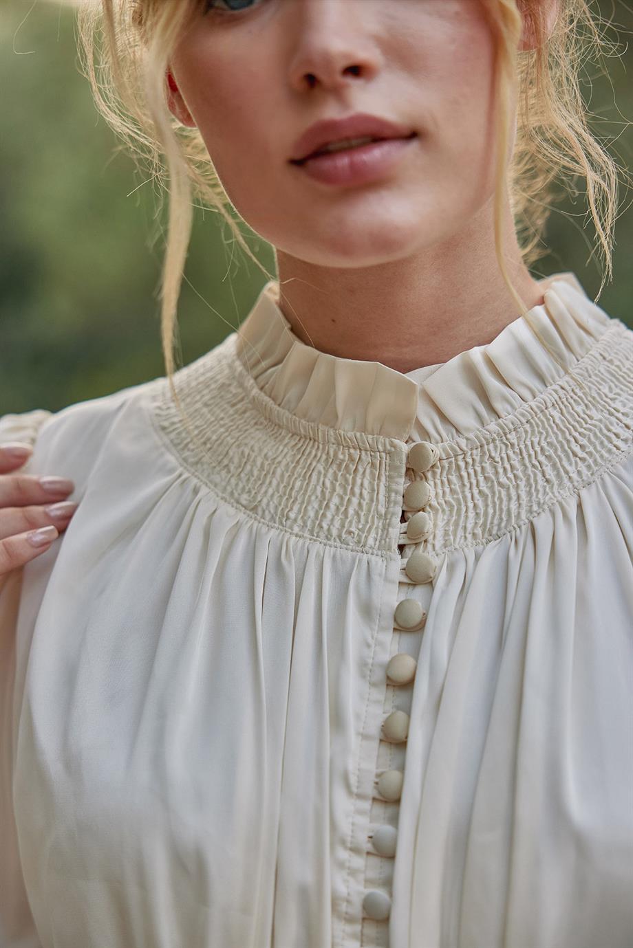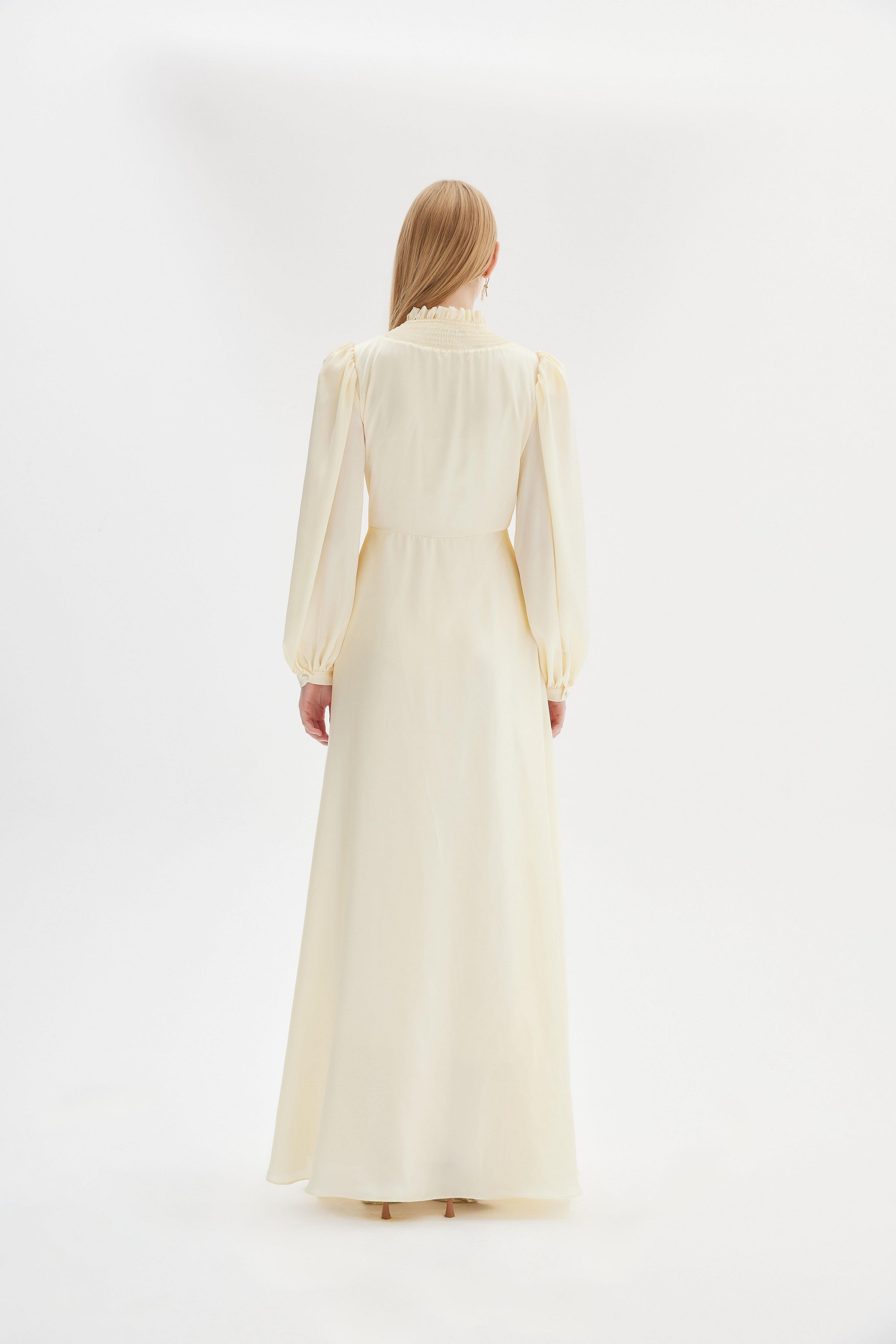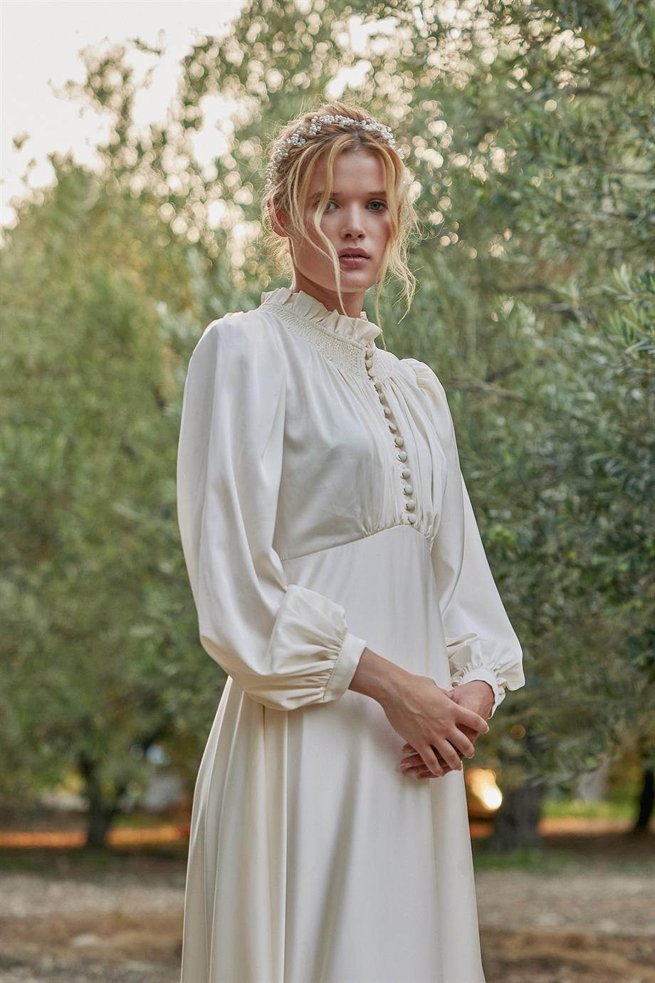 Hafif dökümlü ipek satenden, hakim yaka, boğaz kısmı gipe detaylı, göğüs altından büzgülü, üst kısmında birit kaplama düğmeli, uzun balon kollu, ince manşetli, yan kısmından gizli fermuarlı, astarlı Tailor’s Room Saten Gece Elbisesi
