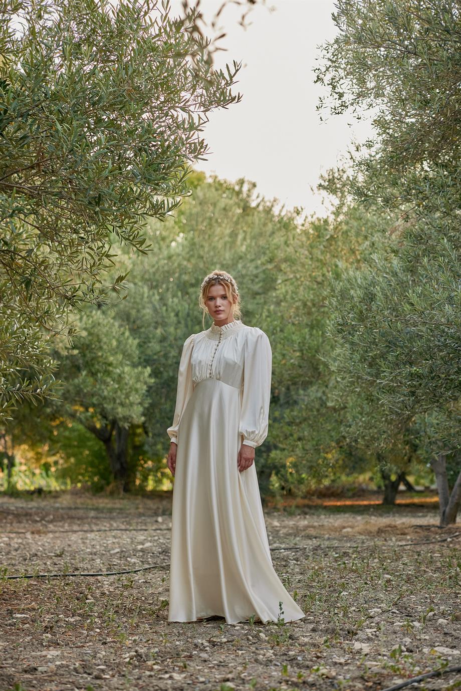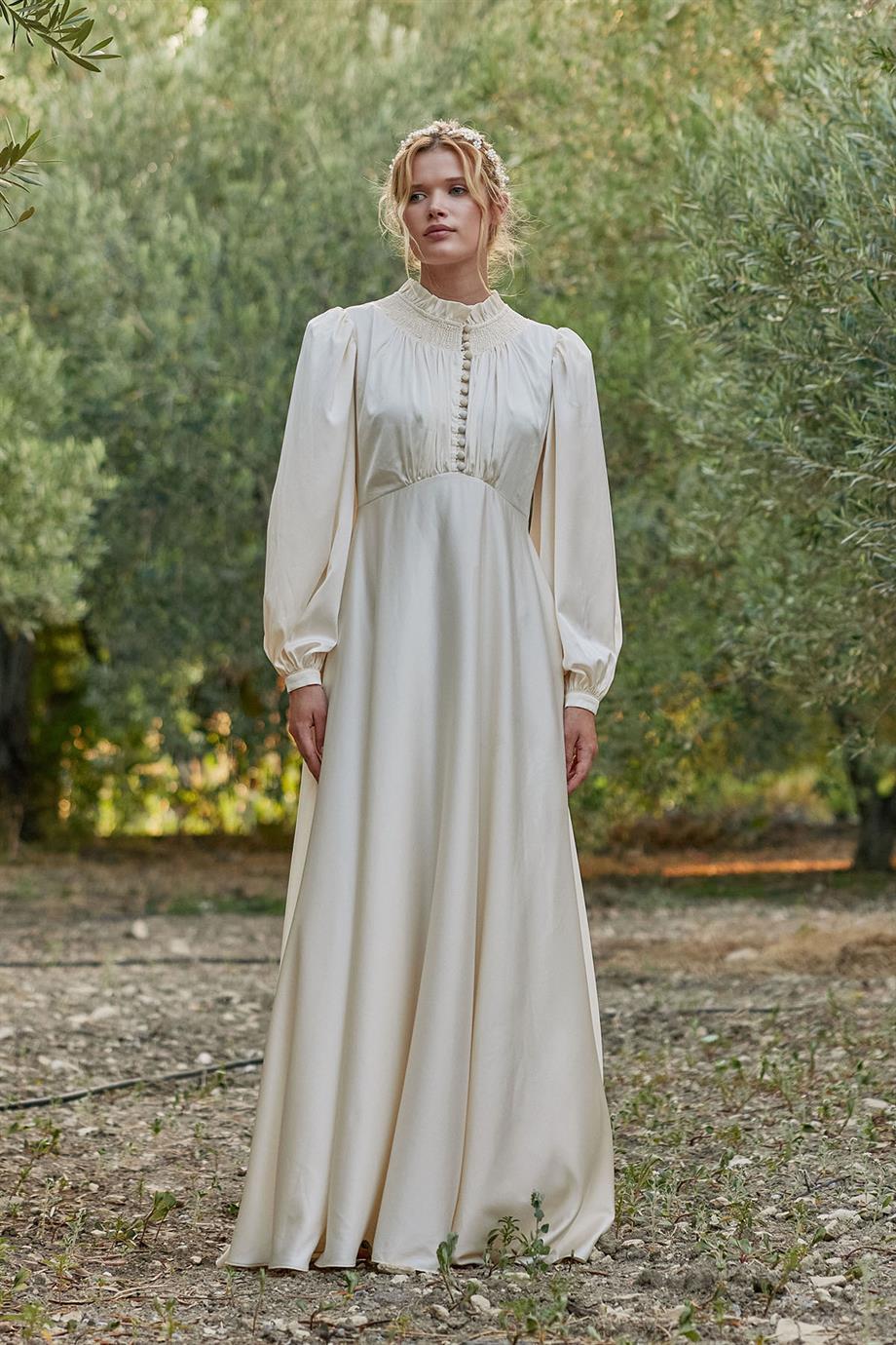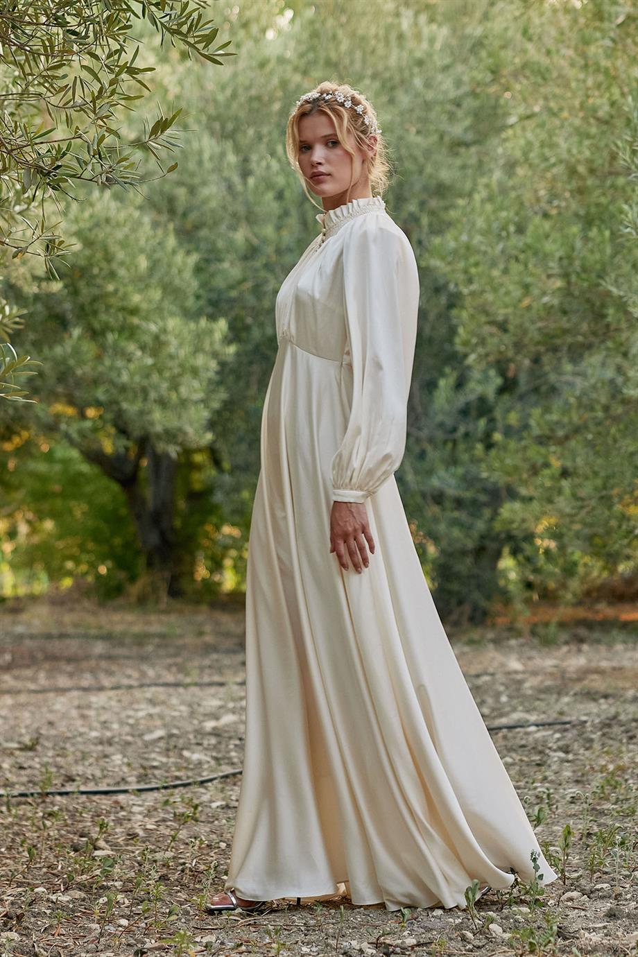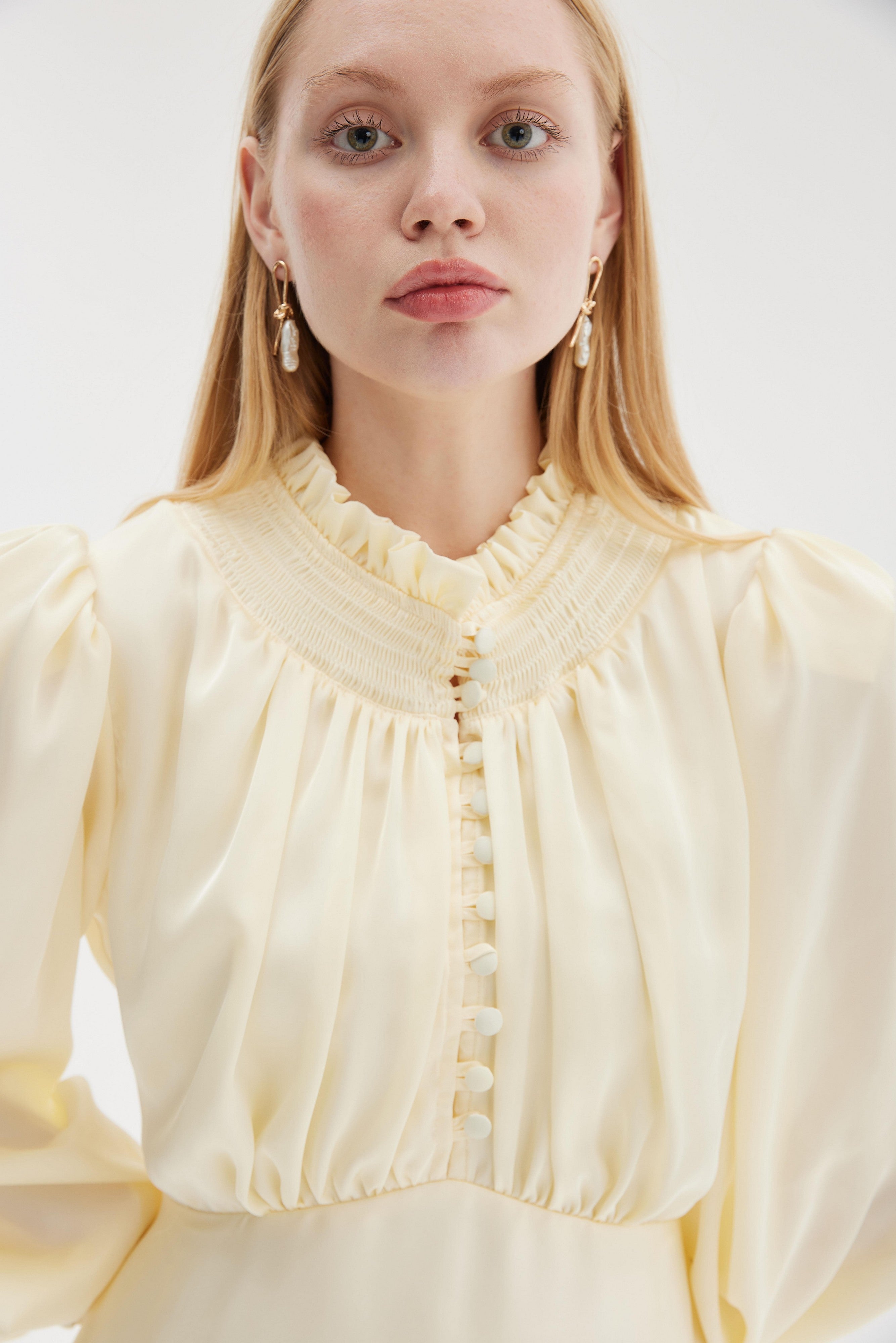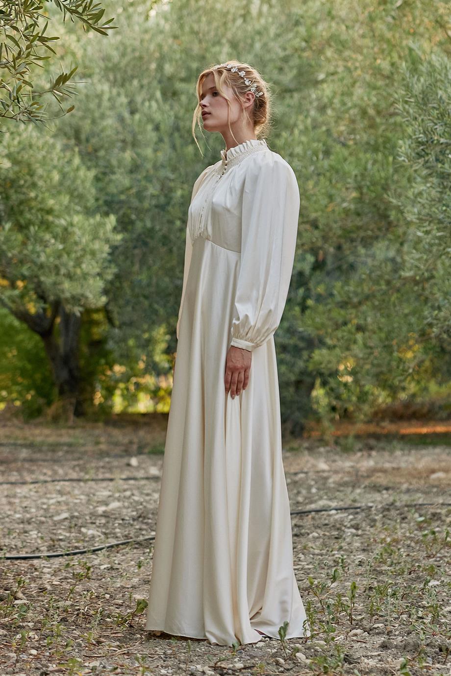 Hafif dökümlü ipek satenden, hakim yaka, boğaz kısmı gipe detaylı, göğüs altından büzgülü, üst kısmında birit kaplama düğmeli, uzun balon kollu, ince manşetli, yan kısmından gizli fermuarlı, astarlı Tailor’s Room Saten Gece Elbisesi