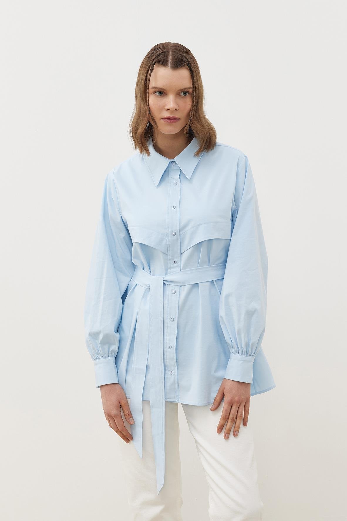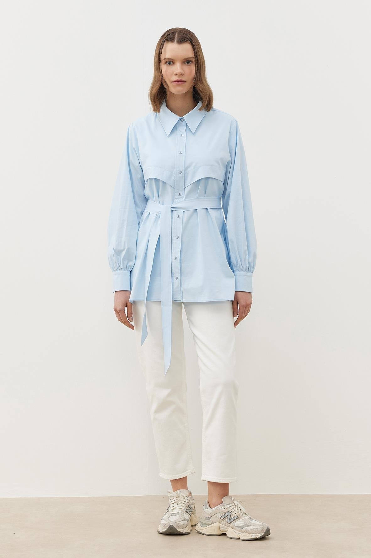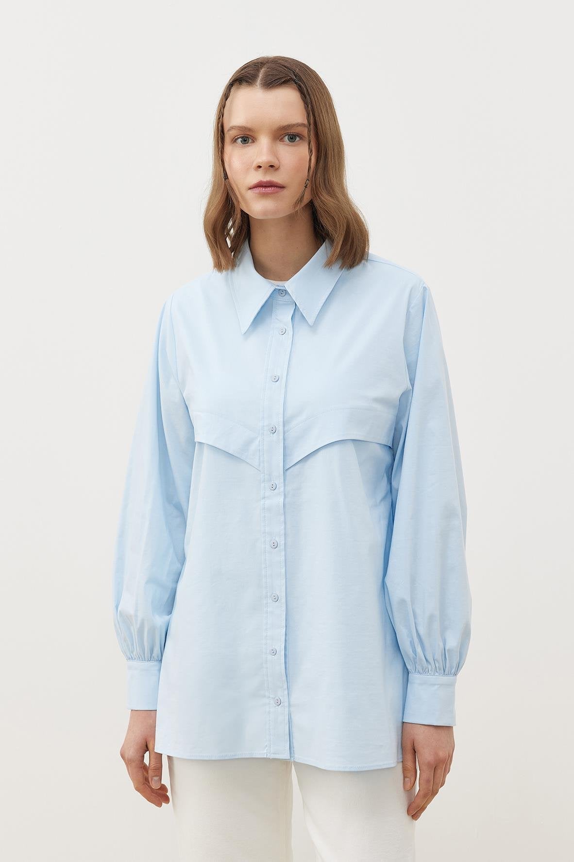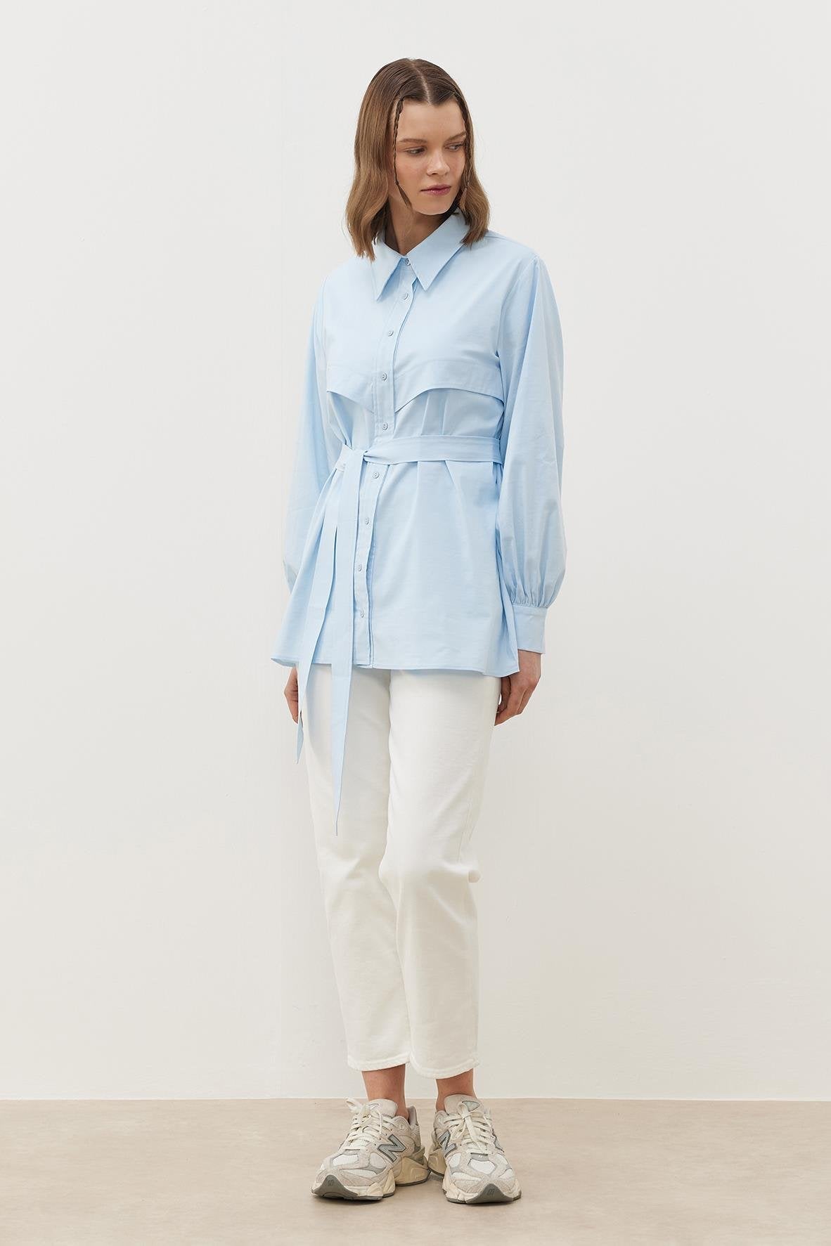 Pamuk dokuma kumaştan üretilen Soley Gömlek, klasik tasarımı ve zarif detaylarıyla şıklığınızı ön plana çıkarıyor. Yakalı ve önü patlı tasarımı, kollarındaki büzgü ve manşet detayları ile zamansız bir şıklık sunarken, düz kesimli etek ucu sayesinde modern bir siluet oluşturuyor. Hem günlük stilinize hem de iş hayatınıza mükemmel bir uyum sağlar.