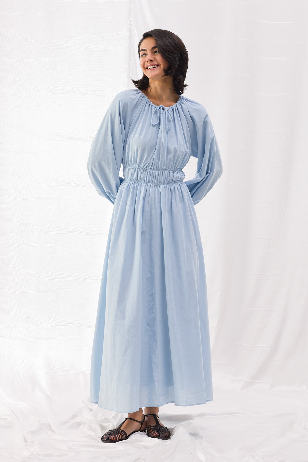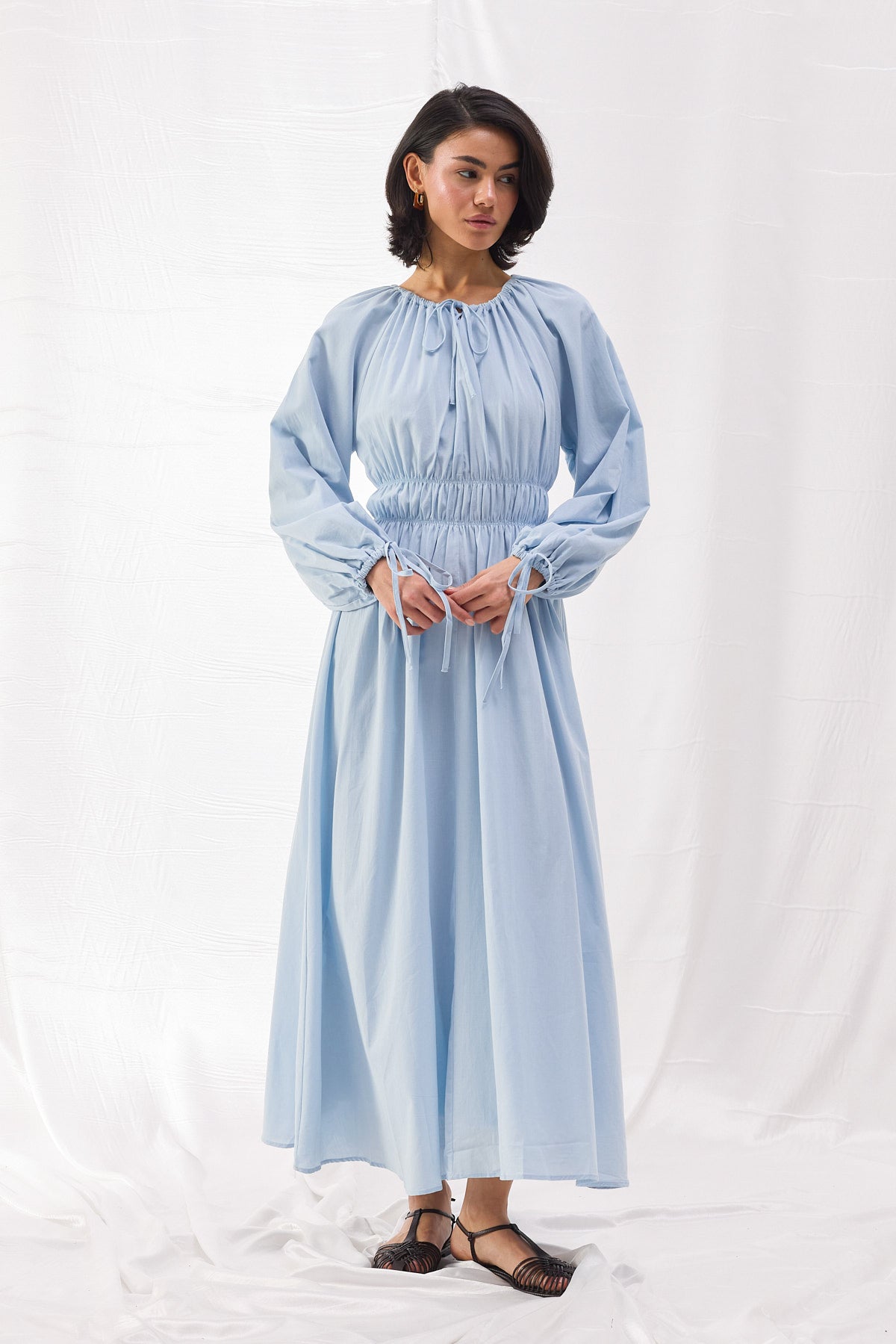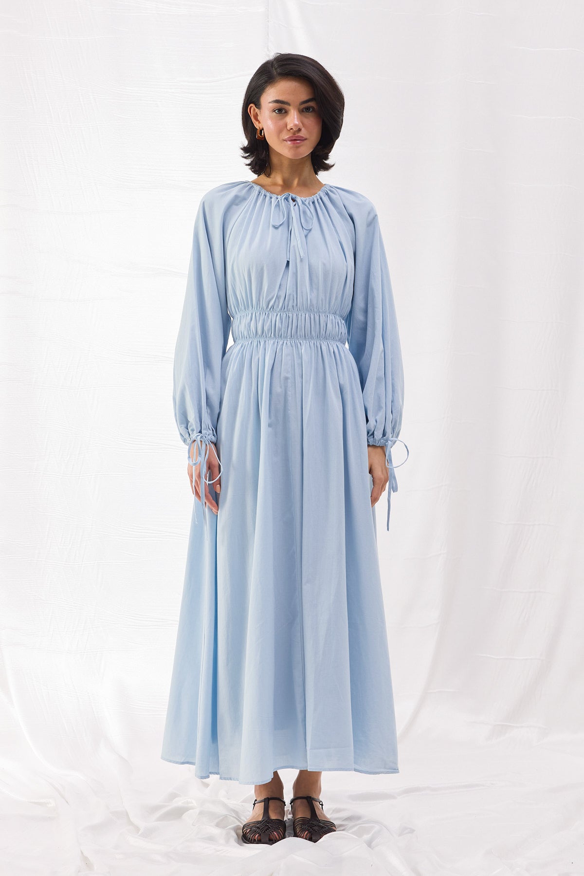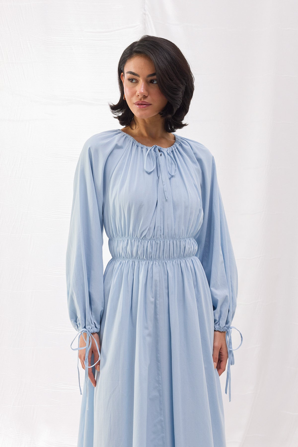 Pamuk dokuma kumaştan üretilen Beli Büzgülü Vual Elbise, şıklığı ve konforu bir araya getirerek her ortamda zarif bir duruş sergilemenizi sağlar. Bel kısmındaki lastik büzgü detayı, vücut hatlarını zarif bir şekilde vurgularken, hacimli balon kollar ve bağlama detayları modern bir dokunuş sunar.
