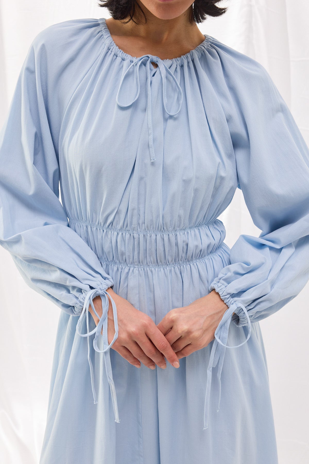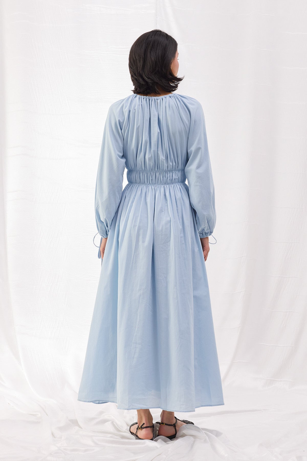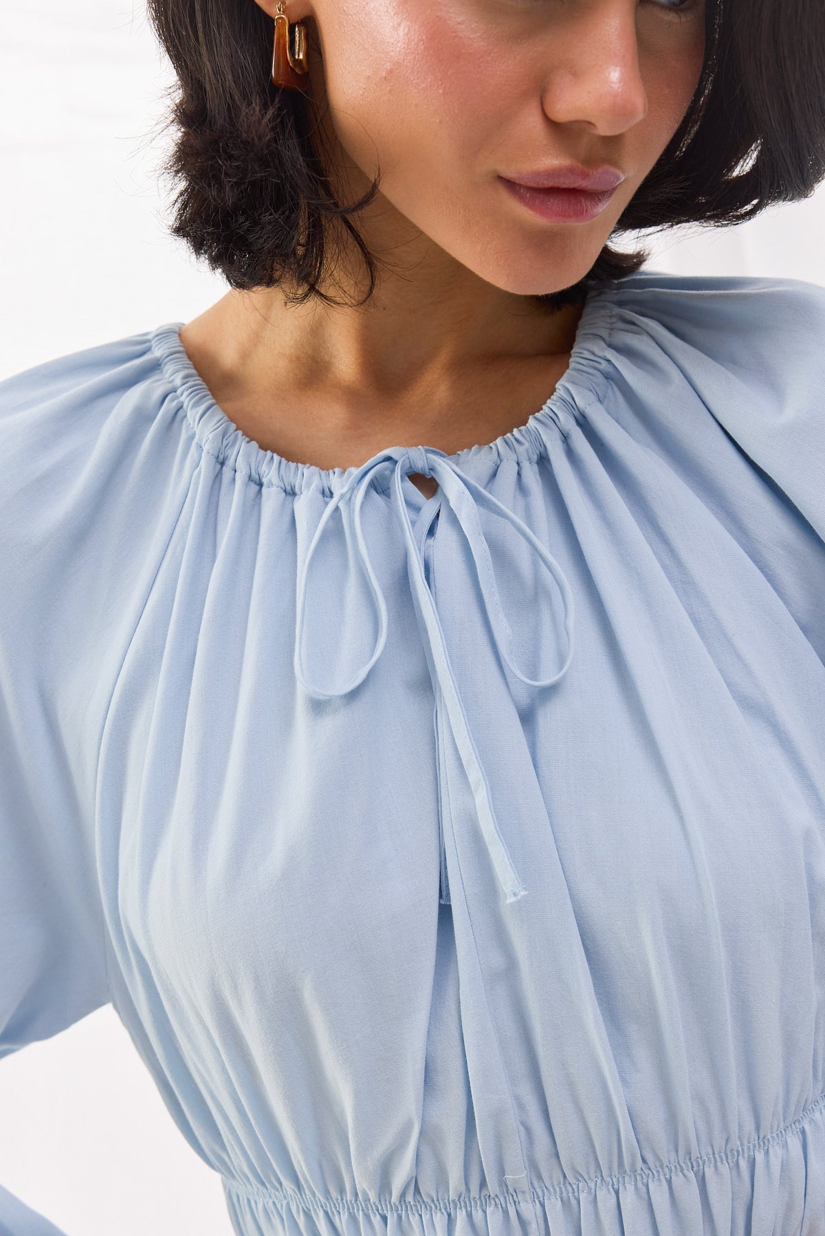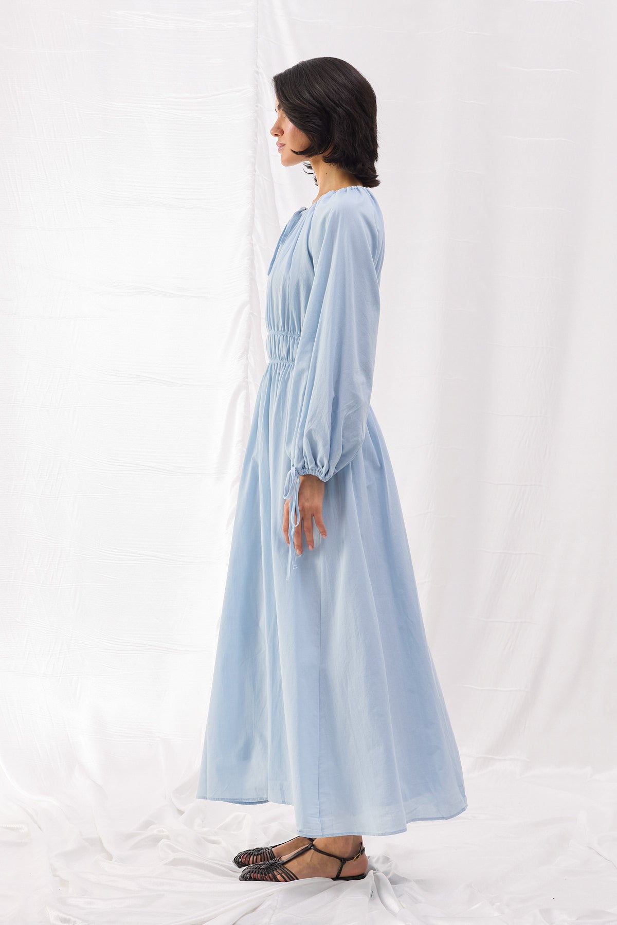Pamuk dokuma kumaştan üretilen Beli Büzgülü Vual Elbise, şıklığı ve konforu bir araya getirerek her ortamda zarif bir duruş sergilemenizi sağlar. Bel kısmındaki lastik büzgü detayı, vücut hatlarını zarif bir şekilde vurgularken, hacimli balon kollar ve bağlama detayları modern bir dokunuş sunar.