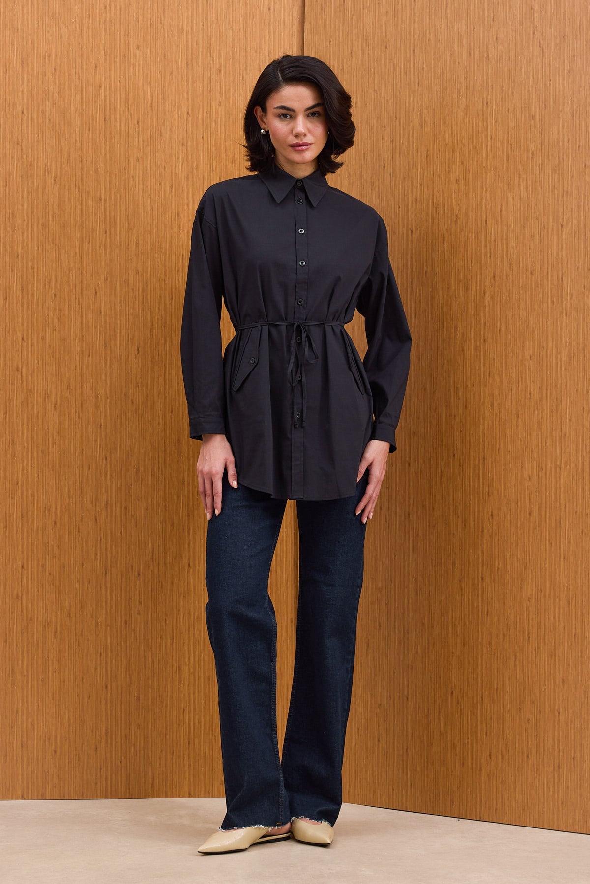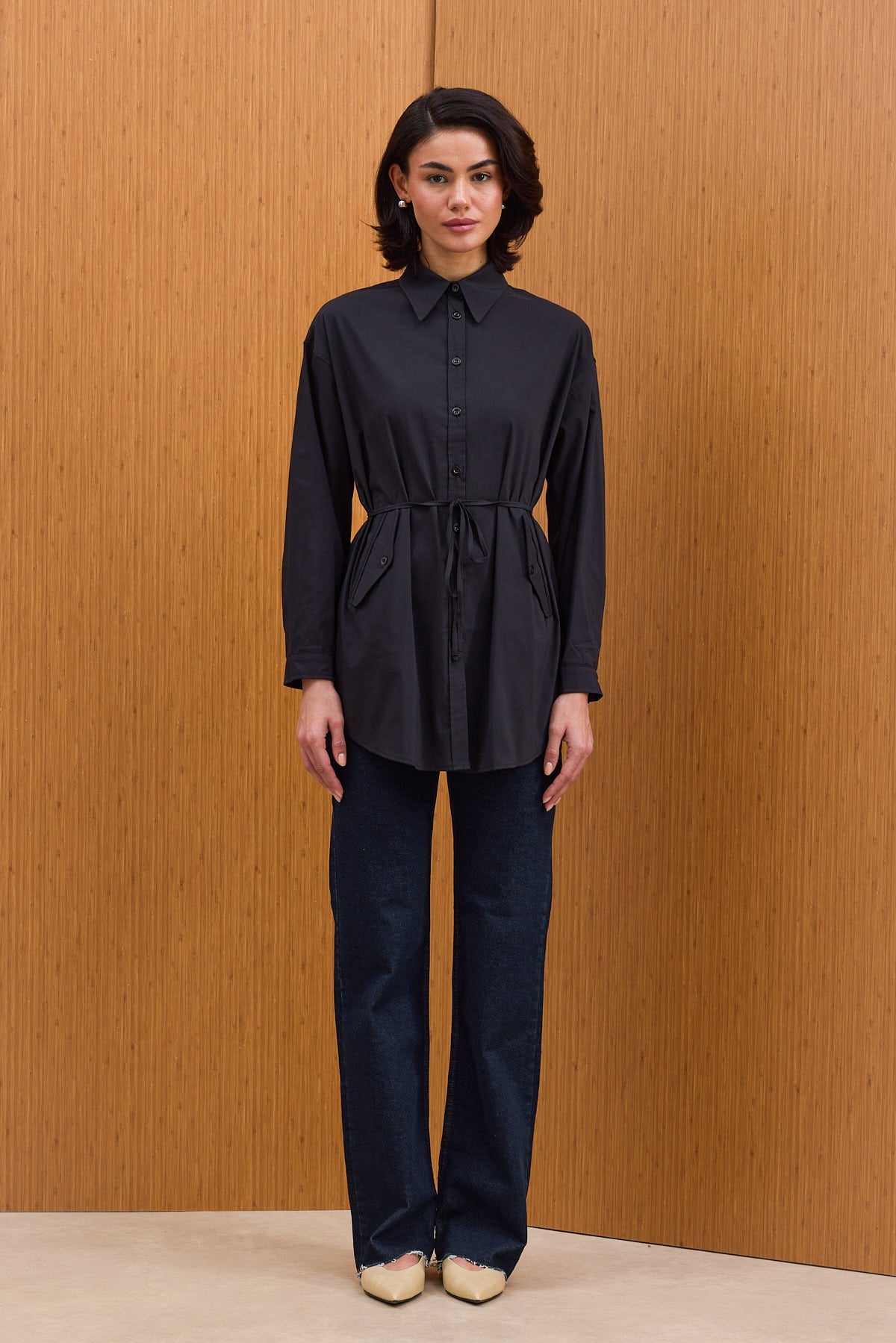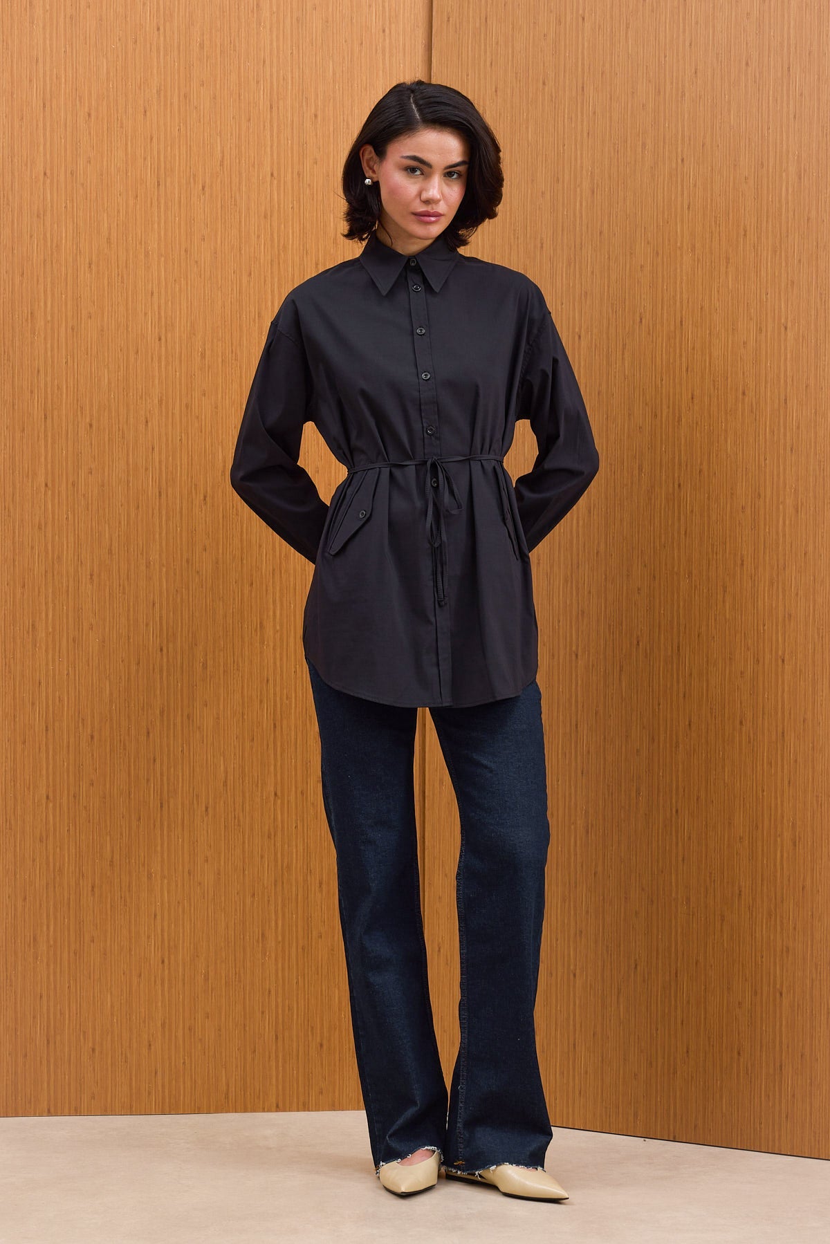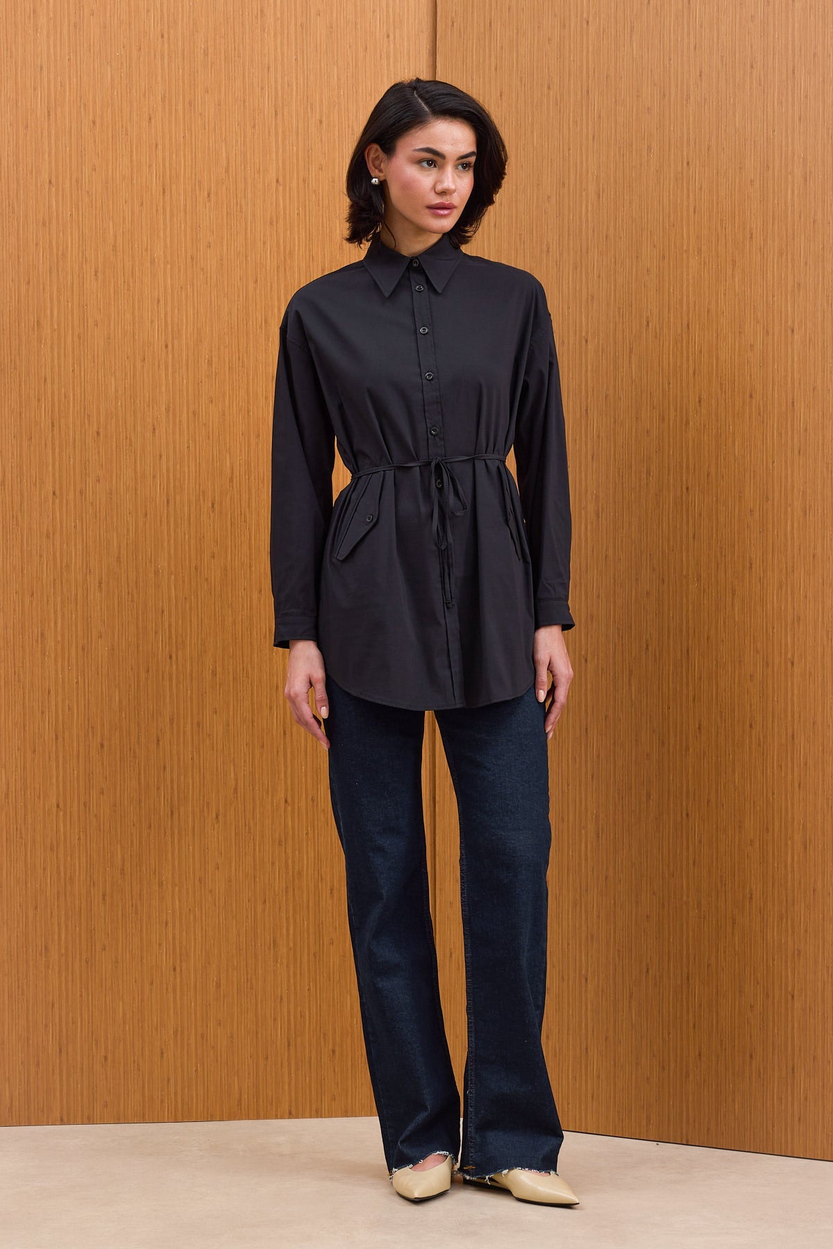 Pamuklu kumaştan kapaklı cepli, kendinden ince kuşaklı ve manşetli gömlek.