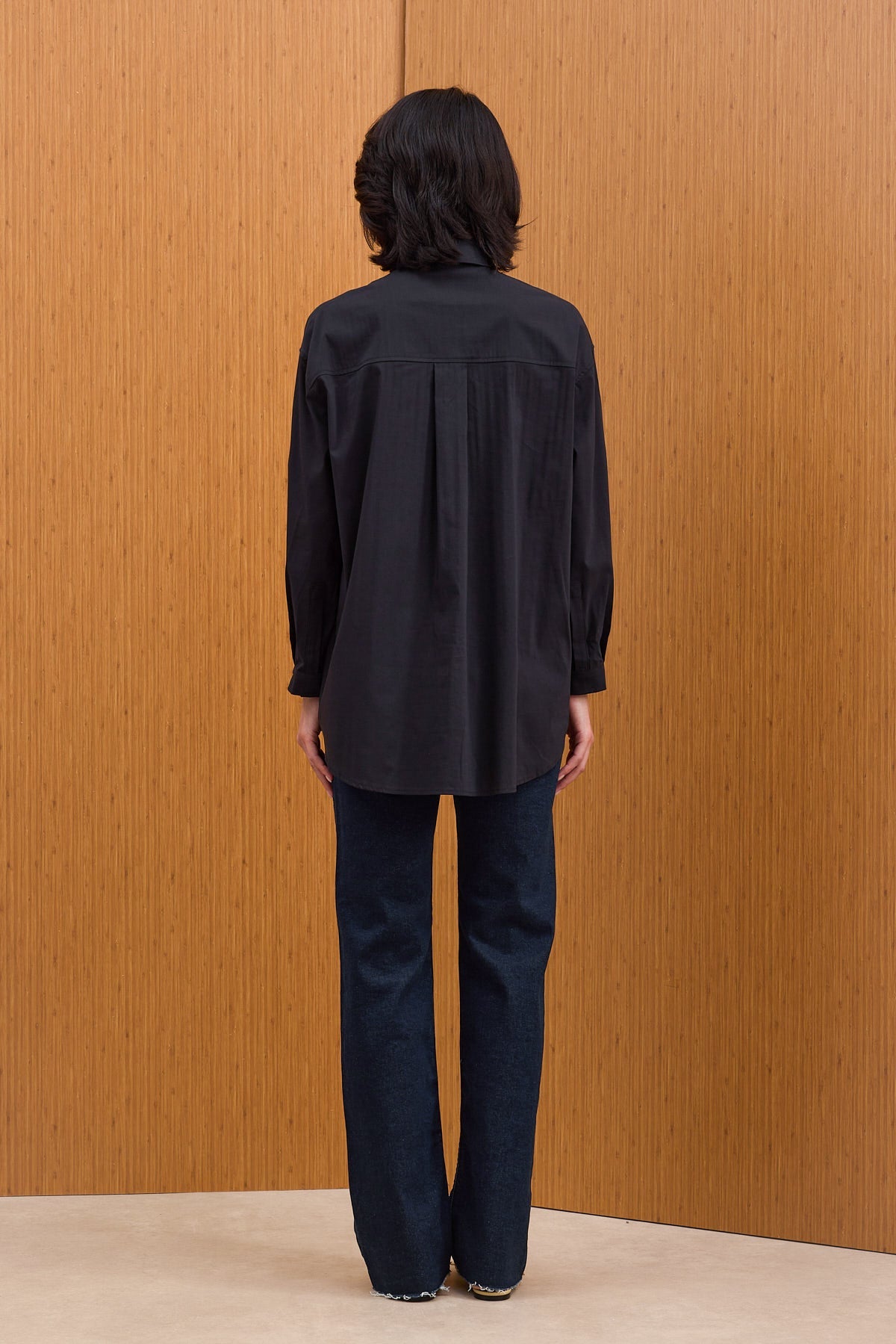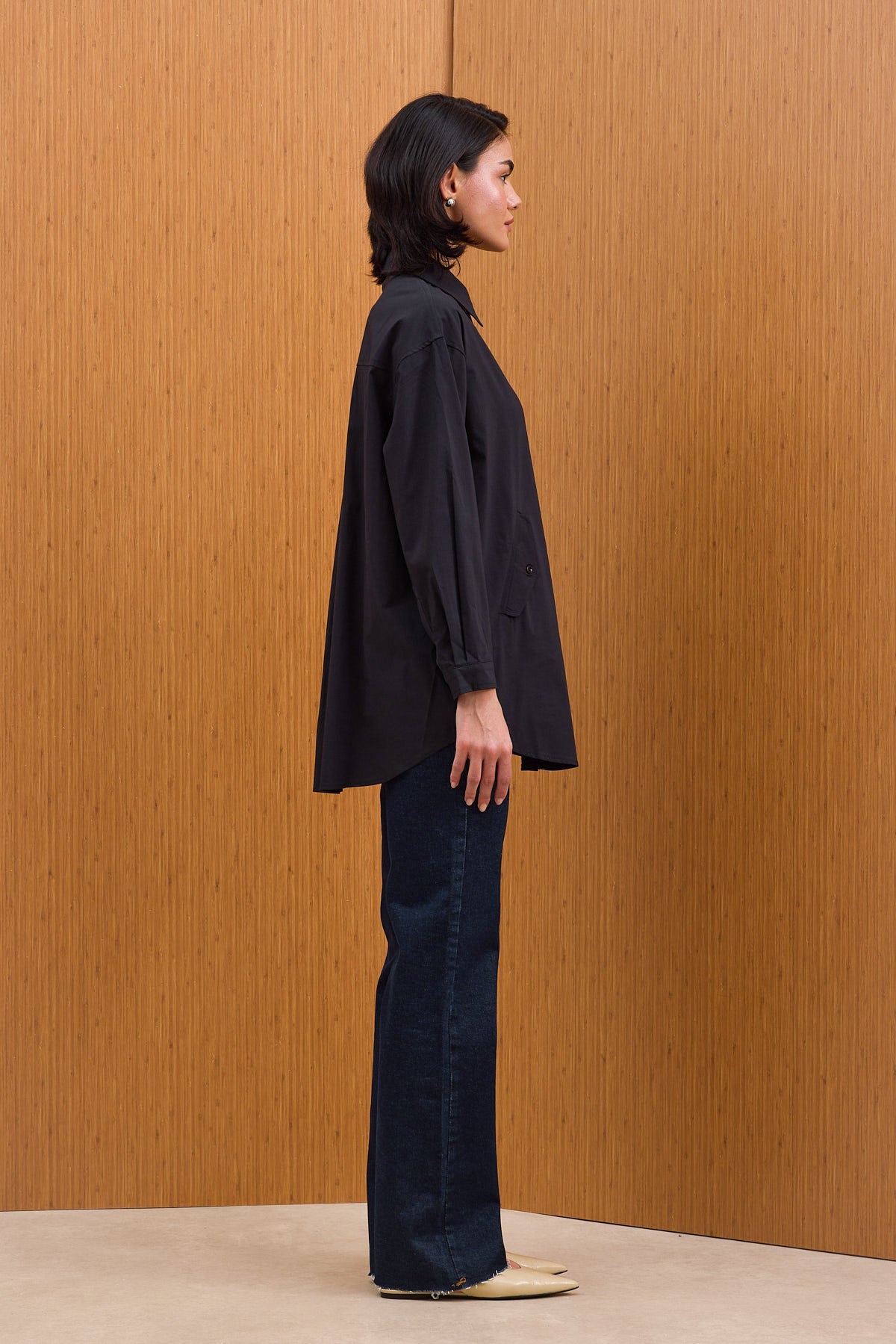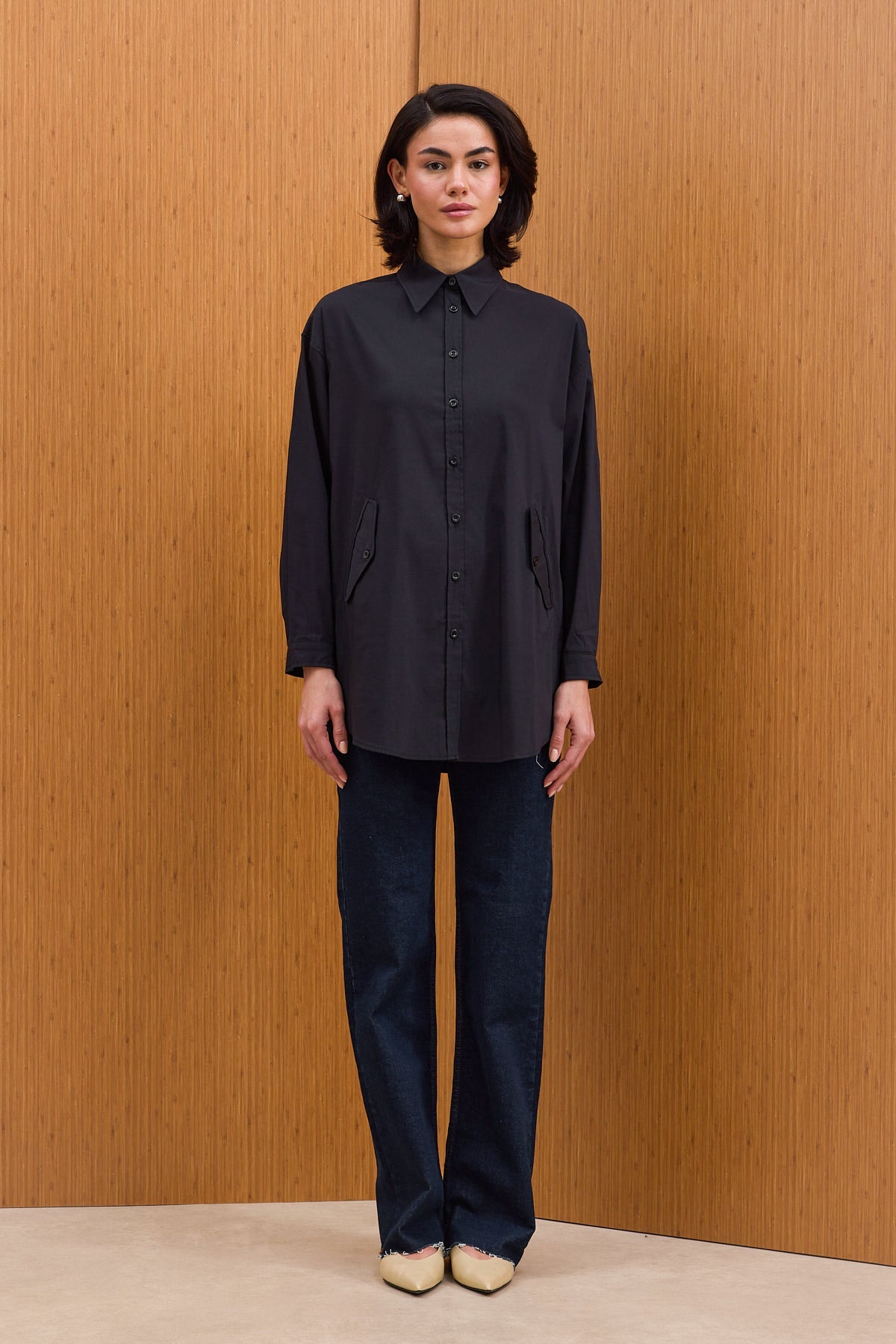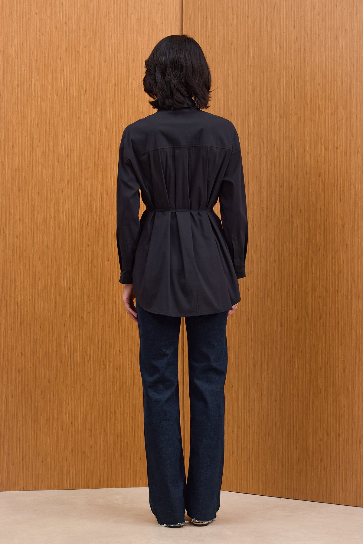 Pamuklu kumaştan kapaklı cepli, kendinden ince kuşaklı ve manşetli gömlek.