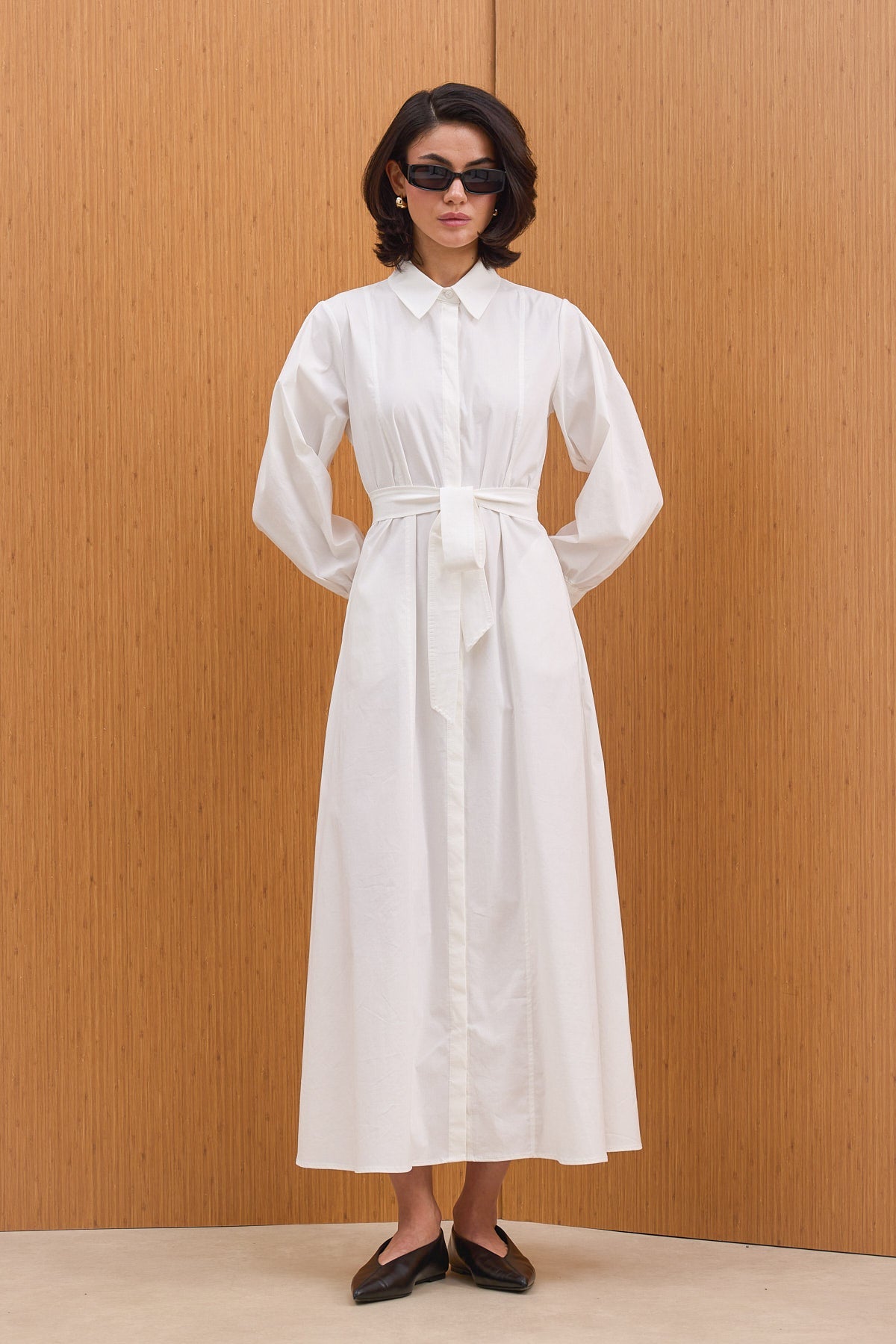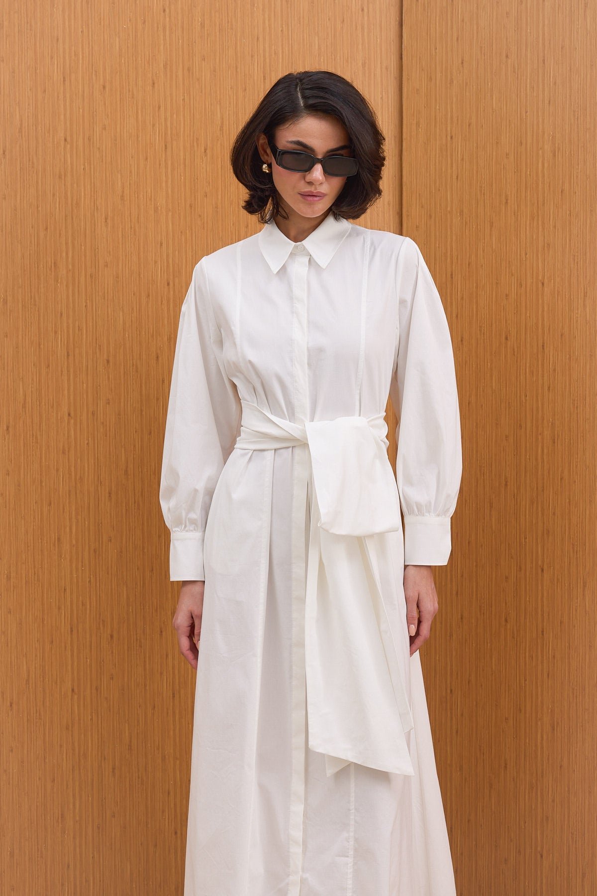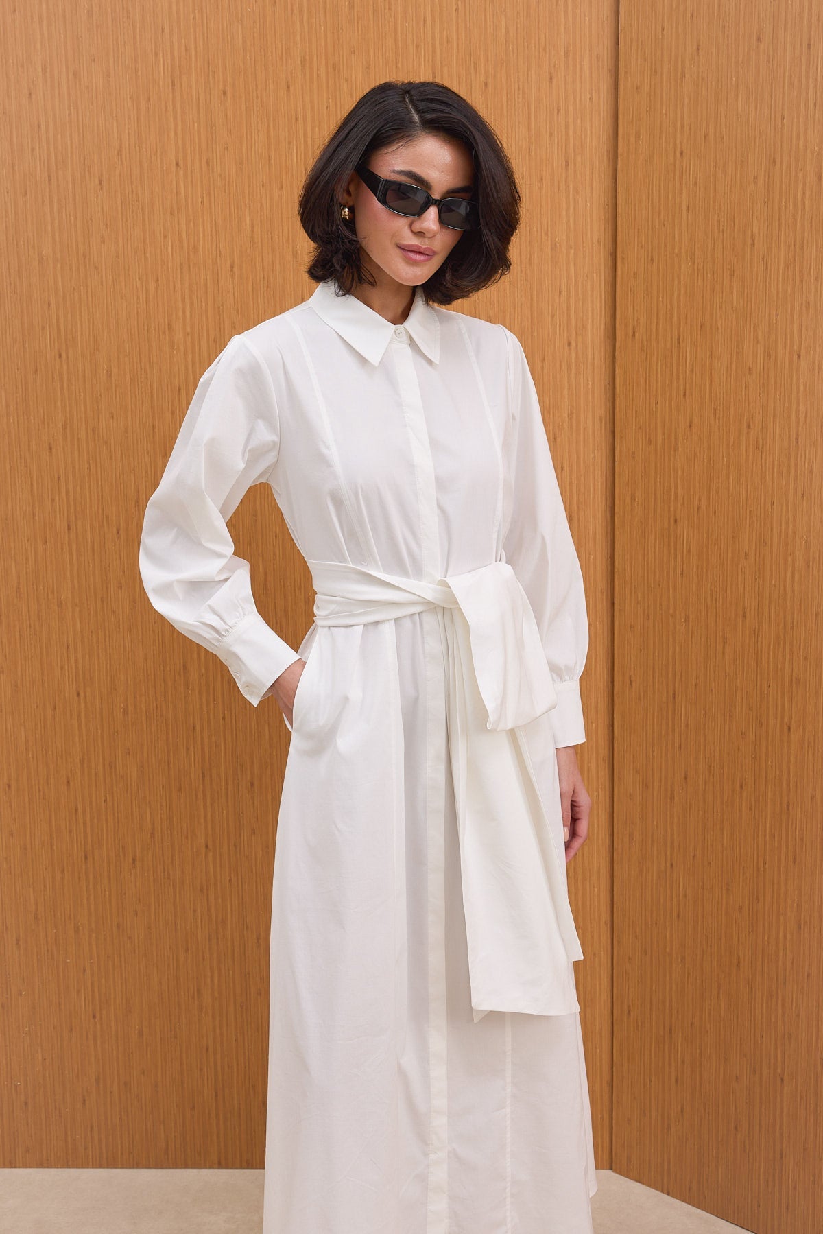 Çift Kuşaklı Gömlek Elbise - Beyaz