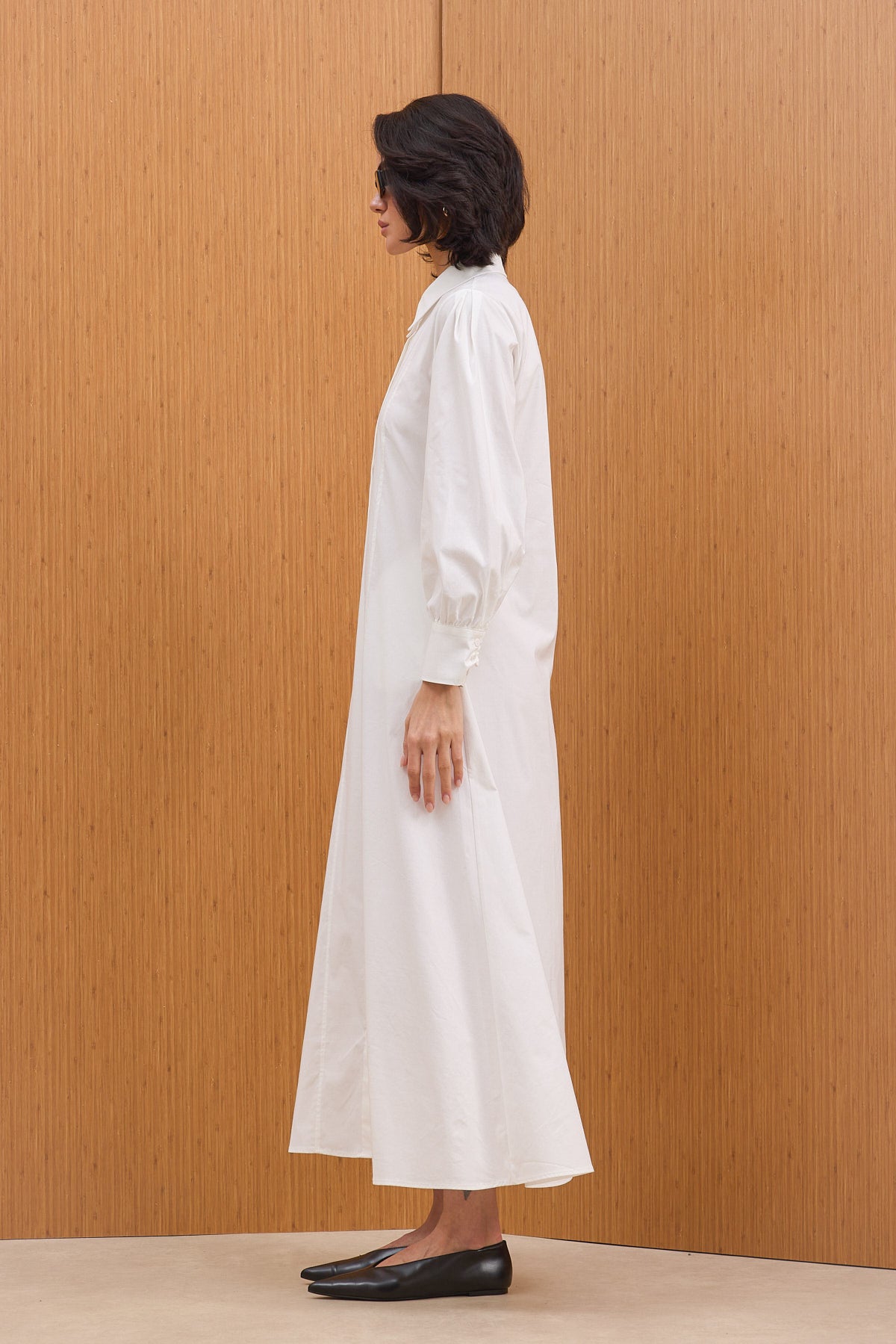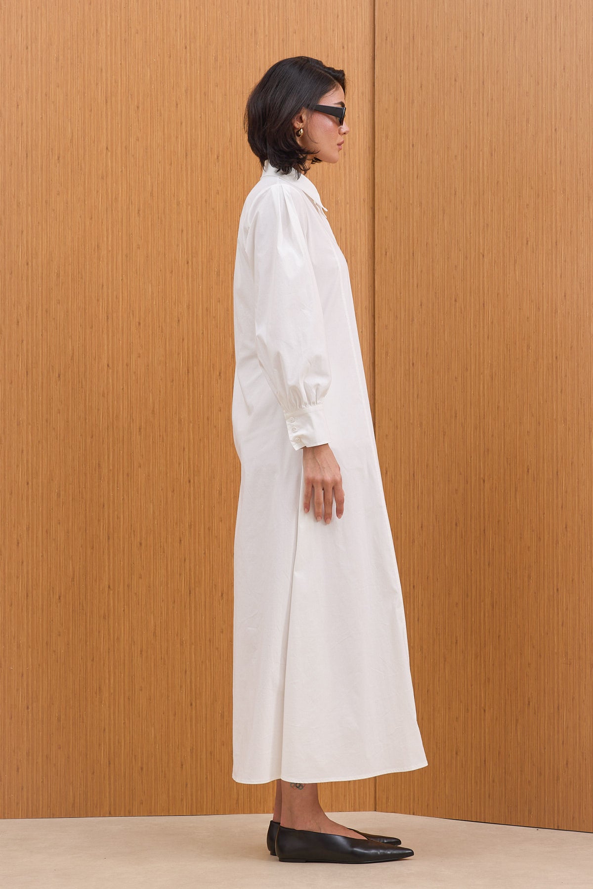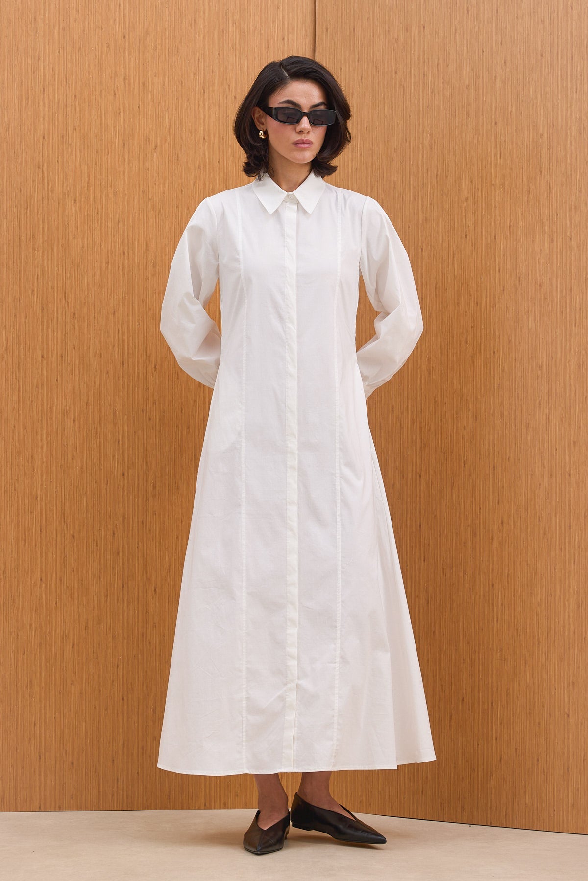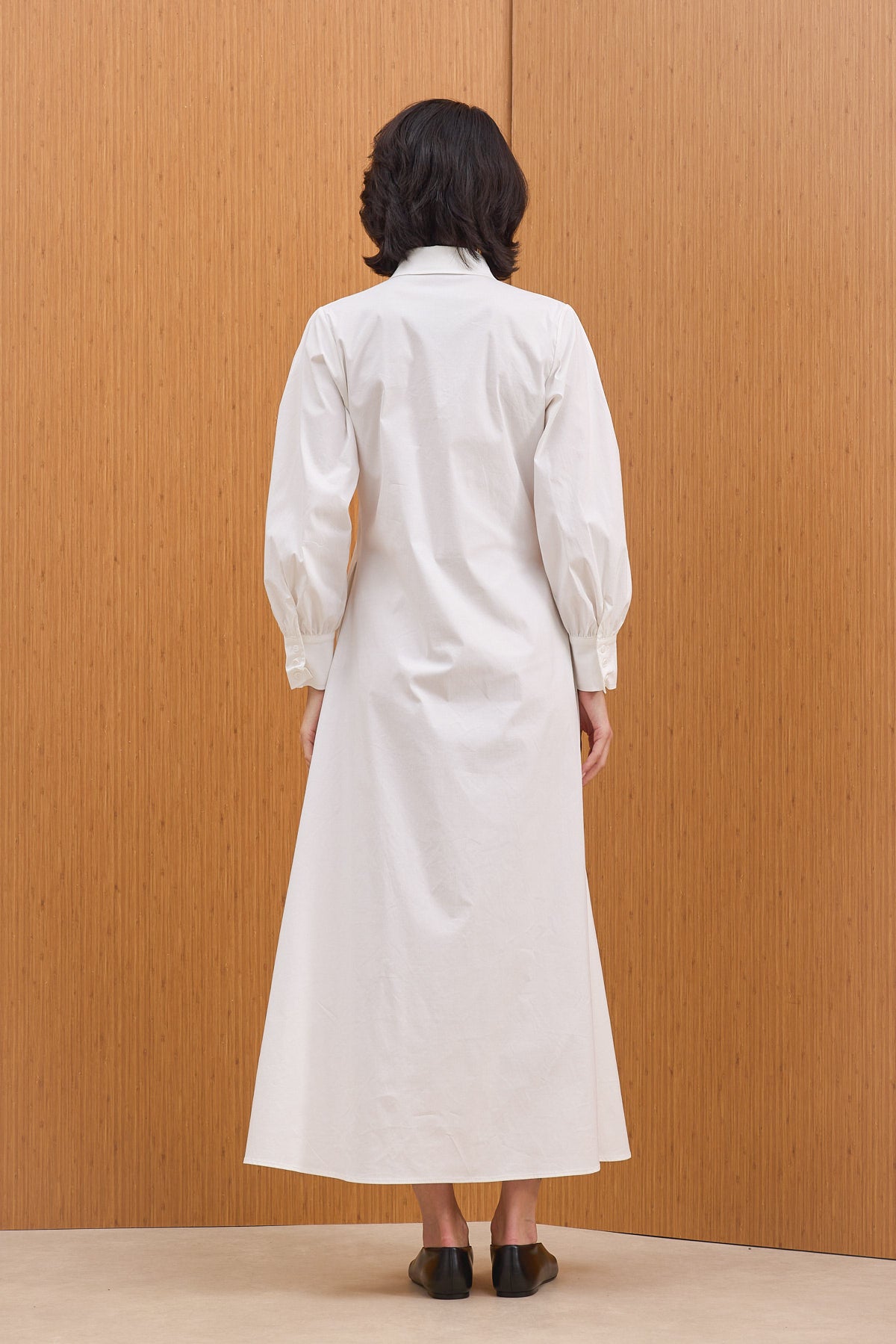 Pamuklu kumaştan, patlı, kup detaylı ve geniş manşetli gömlek elbise. Kalın ve ince kuşaklı. Astarsız.